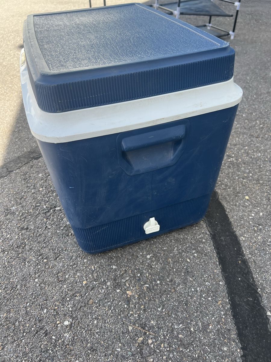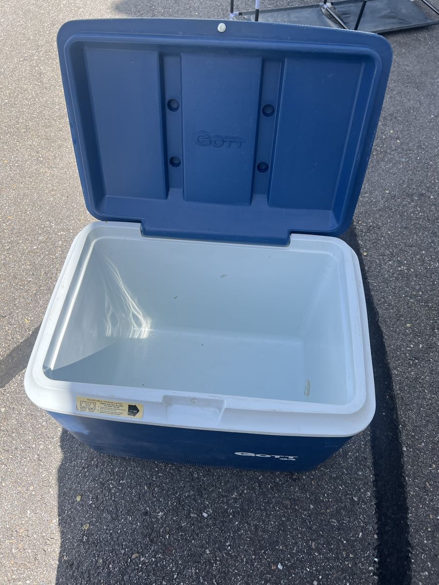 GooglePayThis item is a vintage GOTT 34 model cooler, featuring a 34-quart capacity and blue and white design. Brand: GOTT. Model: 34. Material: Durable plastic construction. Features: Includes an adjustable tension latch and is suitable for camping, fishing, or beach trips.