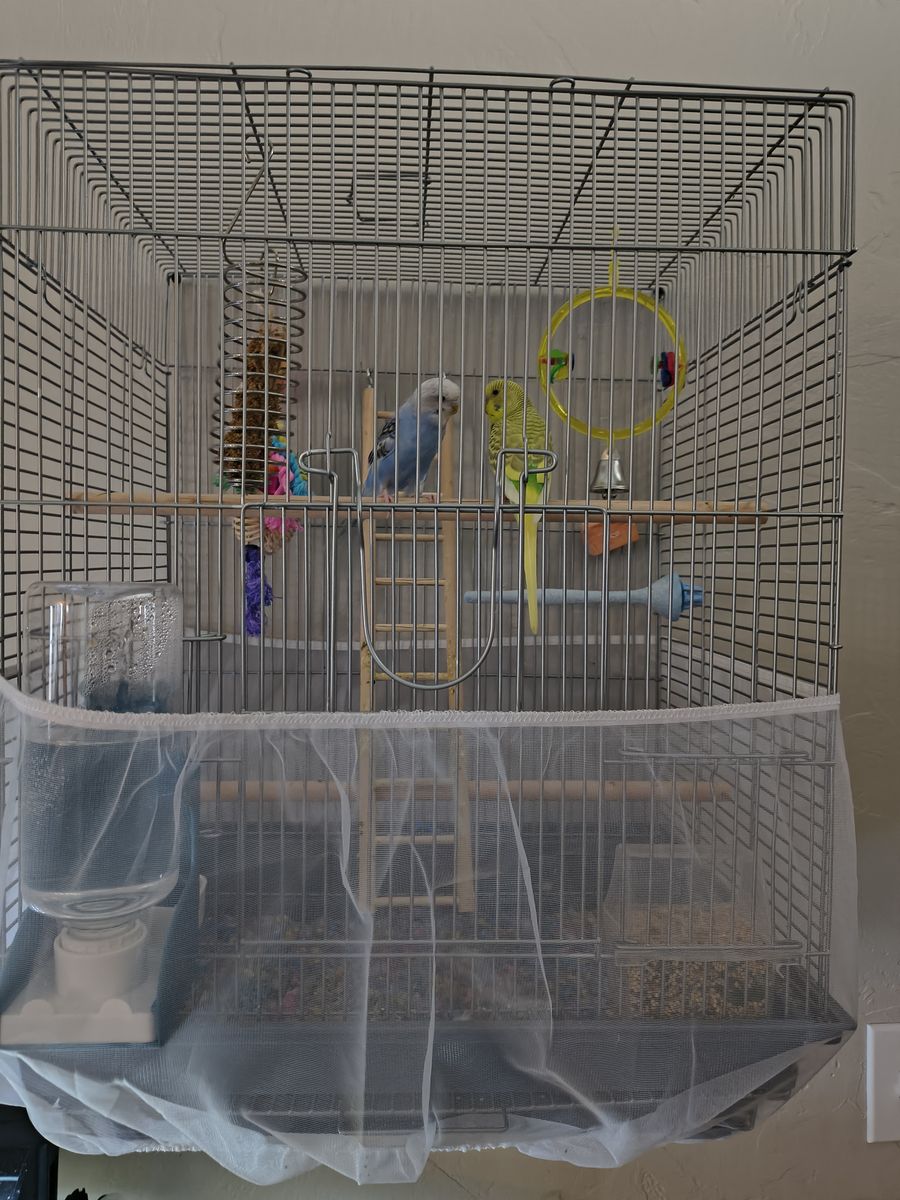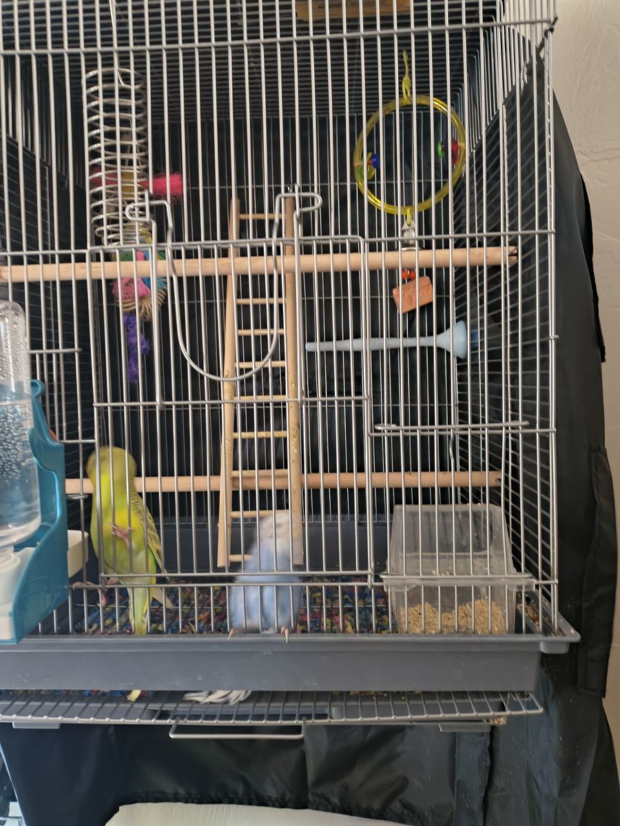 Selling cute Parakeets, only had them for 2 months. Can't take care of them anymore because I got a job that will require me to be in office the whole day and these cuties need some human presence around them throughout the day! Have food, Millet and cage included with everything inside.Price is negotiable.