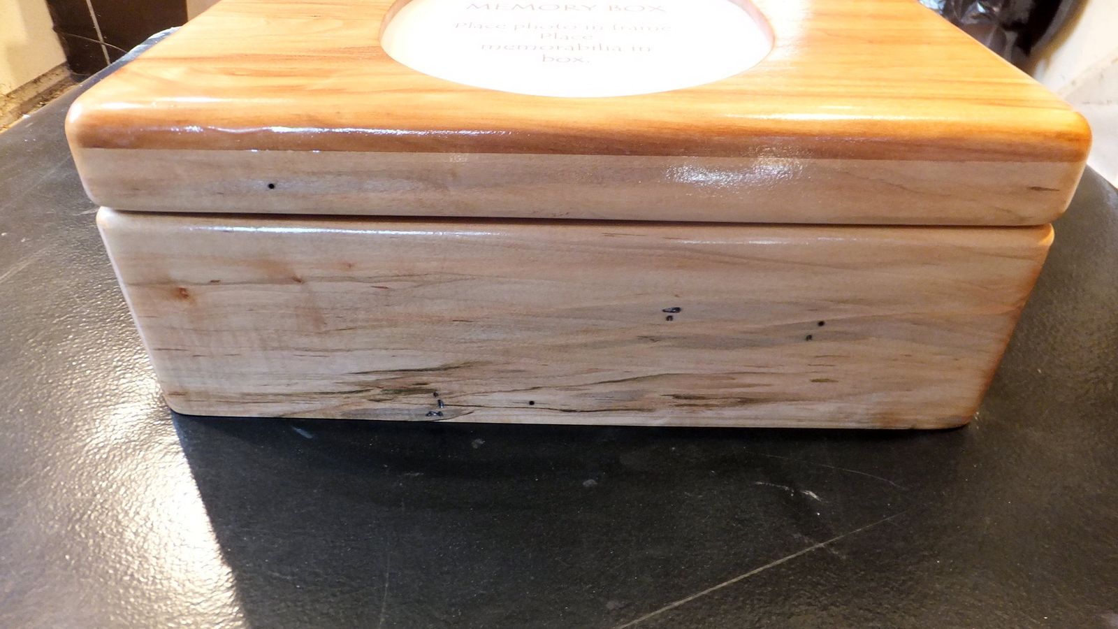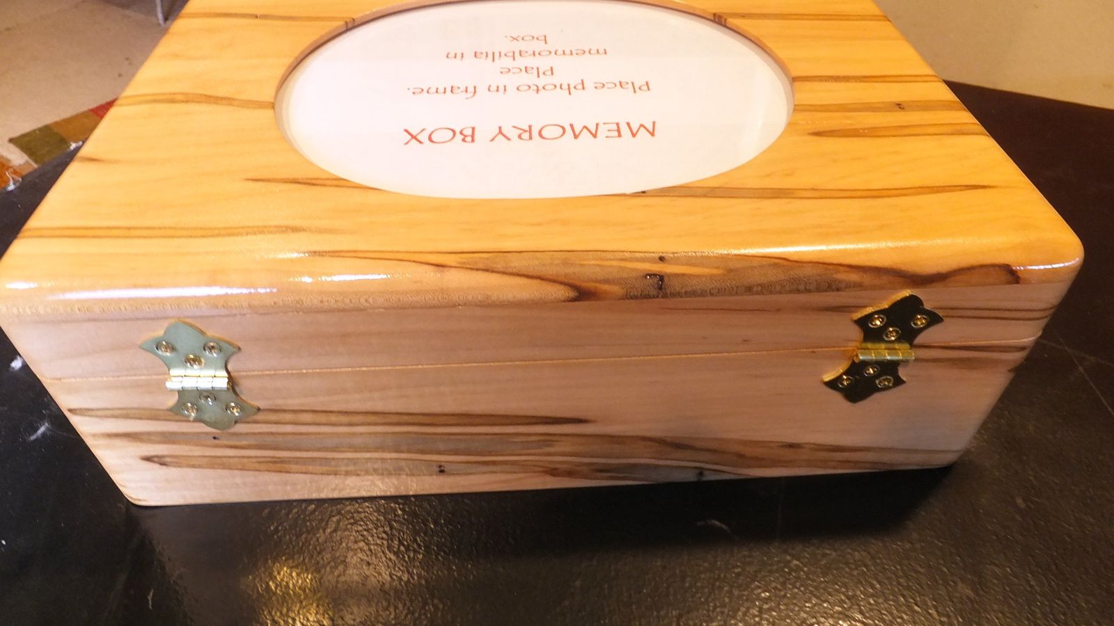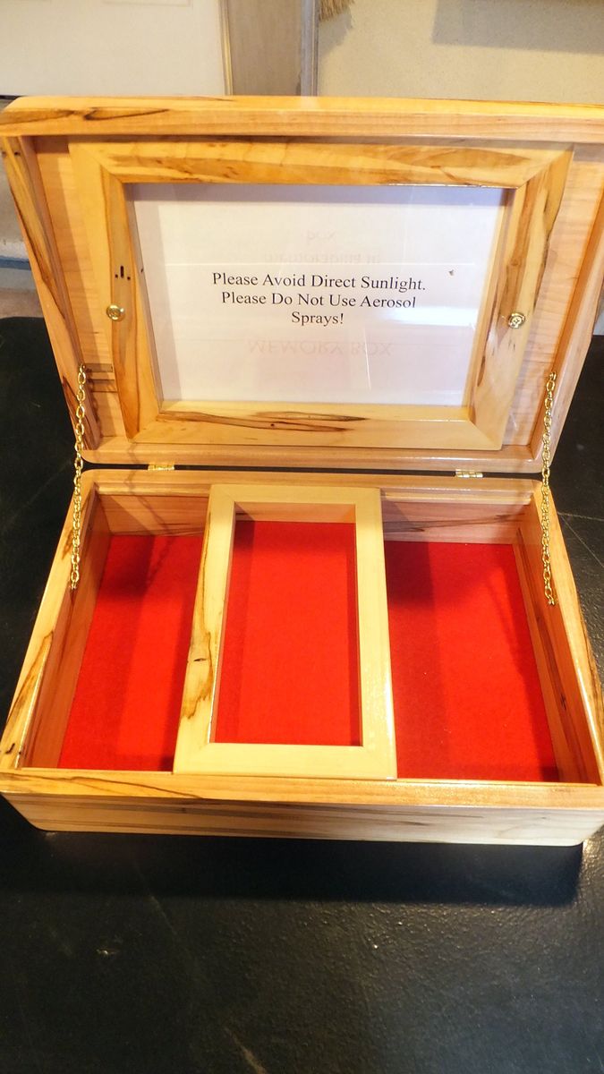 Buy This $70 - Retail Value $250 NEW Memory Box, Hand Crafted, Knotty Worm Maple, stunning NEW Memory Box - HAND CRAFTED - STUNNING Now located in Eagle Mountain, UT - WE WILL SHIP - JUST ASK FOR SHIP COST ! Knotty Worm Maple - sorry pics just do not do justice to the beauty of this box Hand Crafted Stunning Center Photo Oval is on inside of Lid -you may put ANY photo up to 8" x 10" which is clamped behind a sheet of glass (2 screws on inside of lid) custom wood is absolutely stunningly beautiful - these pics do NOT do justice to it's beauty outside measures 15.75"w x 13"d x 4.75"h Pic 2 shows inside red felt lined bottom sliding box hold small pieces - glides from side to side Sliding inner box measures (inside measurement) 5"w x 9.5"d x .5"h - see pic 2 inside measures 14.12"w x 11.25"d x 2.75"h Pic 3 shows felt feet on bottom to protect any surface you set it on extremely high quality 90 degree hinges (cost alone was $30) make opening and closing very easy Pic 5 shows felt feet on bottom to protect any surface you set it on extremely high quality 90 degree hinges (cost alone was $30) make opening and closing very easy Sliding inner shelf measures (inside measurement) 5"w x 9.5"d x .5"h - see pic 3 weight 10 lbs.