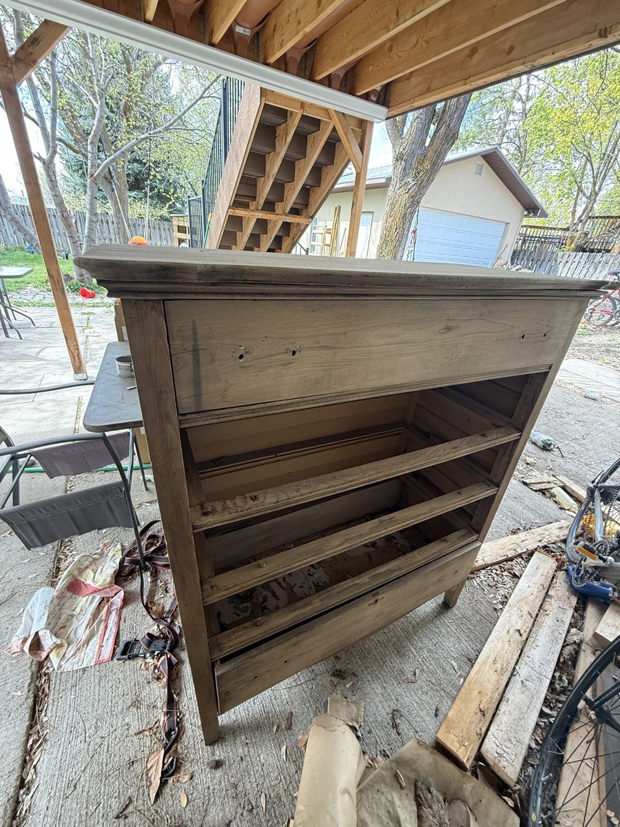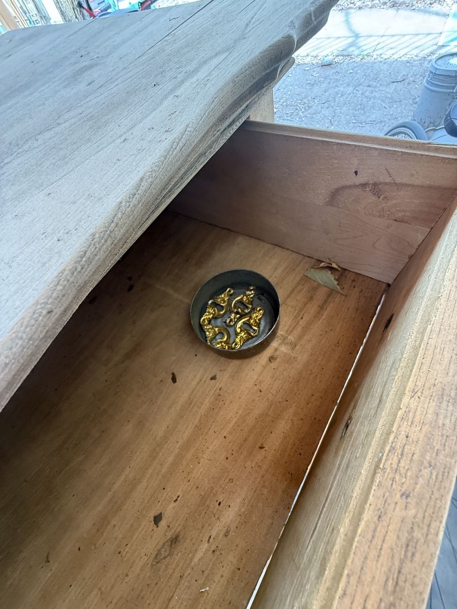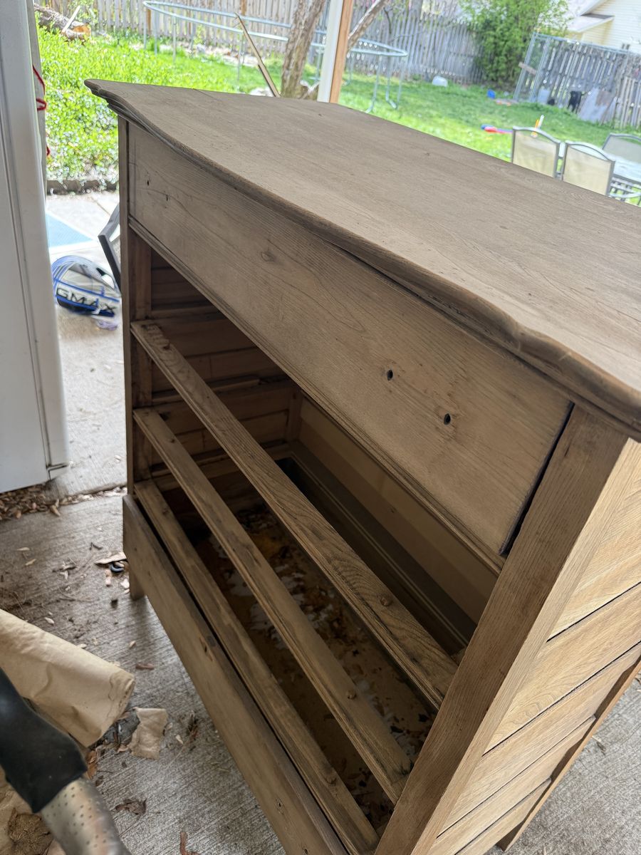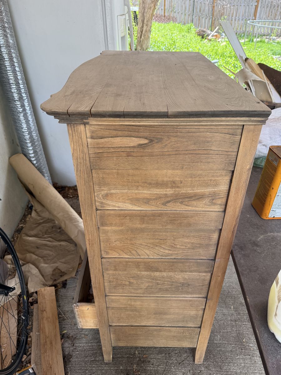 VenmoI intended to refinish, but don’t have the time. $50. The top looks like solid wood. I have all the drawers. The bottoms of the drawers are a bit warped. I have the original vintage key hole covers as well.