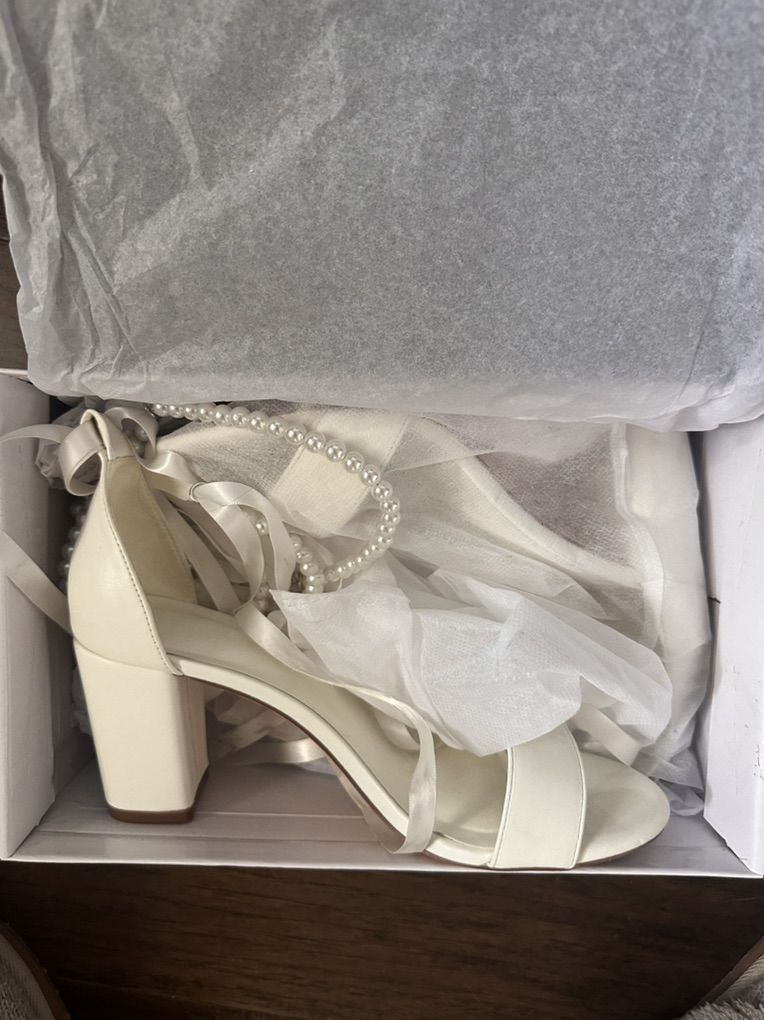ApplePayWhite wedding shoes worn for one day. Might want to get new ribbon for the laces. The current ones might wash out but as of right now are slightly dirty. Paid 49.99 new. Very comfortable. Pearls were a beautiful touch.