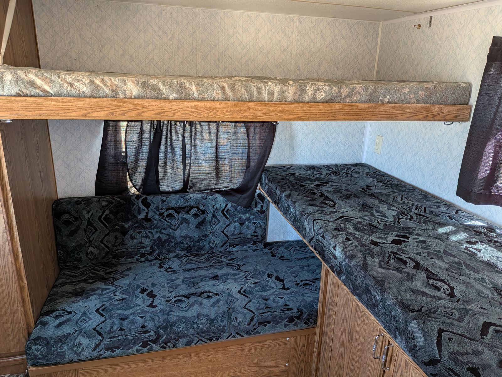 Great family camper with a rare bunkhouse layout and comfortable king bed. About 25 ft, lightweight (~3,460 lbs), tows easily with a half-ton truck or SUV.