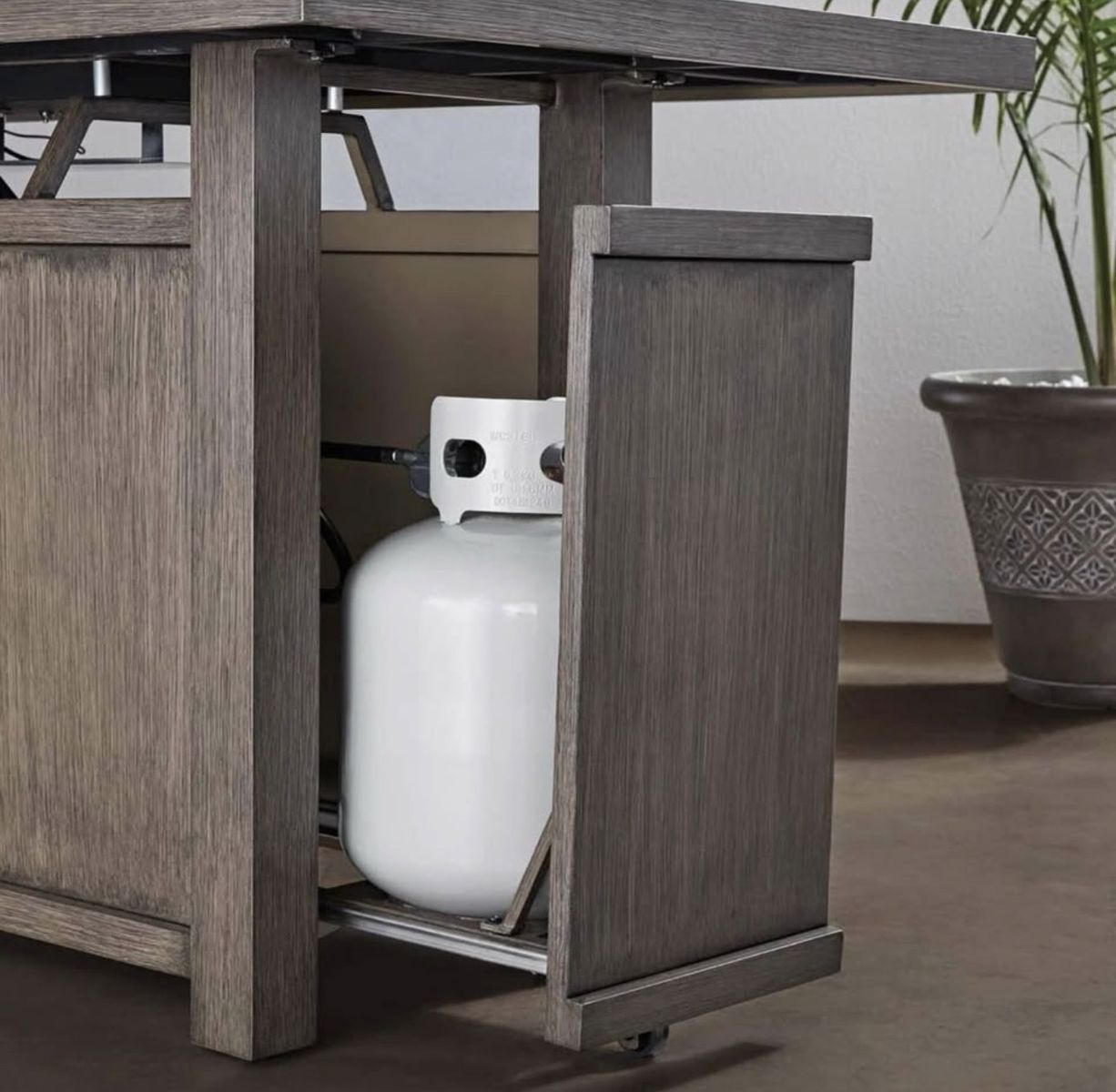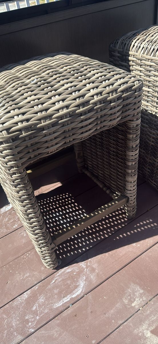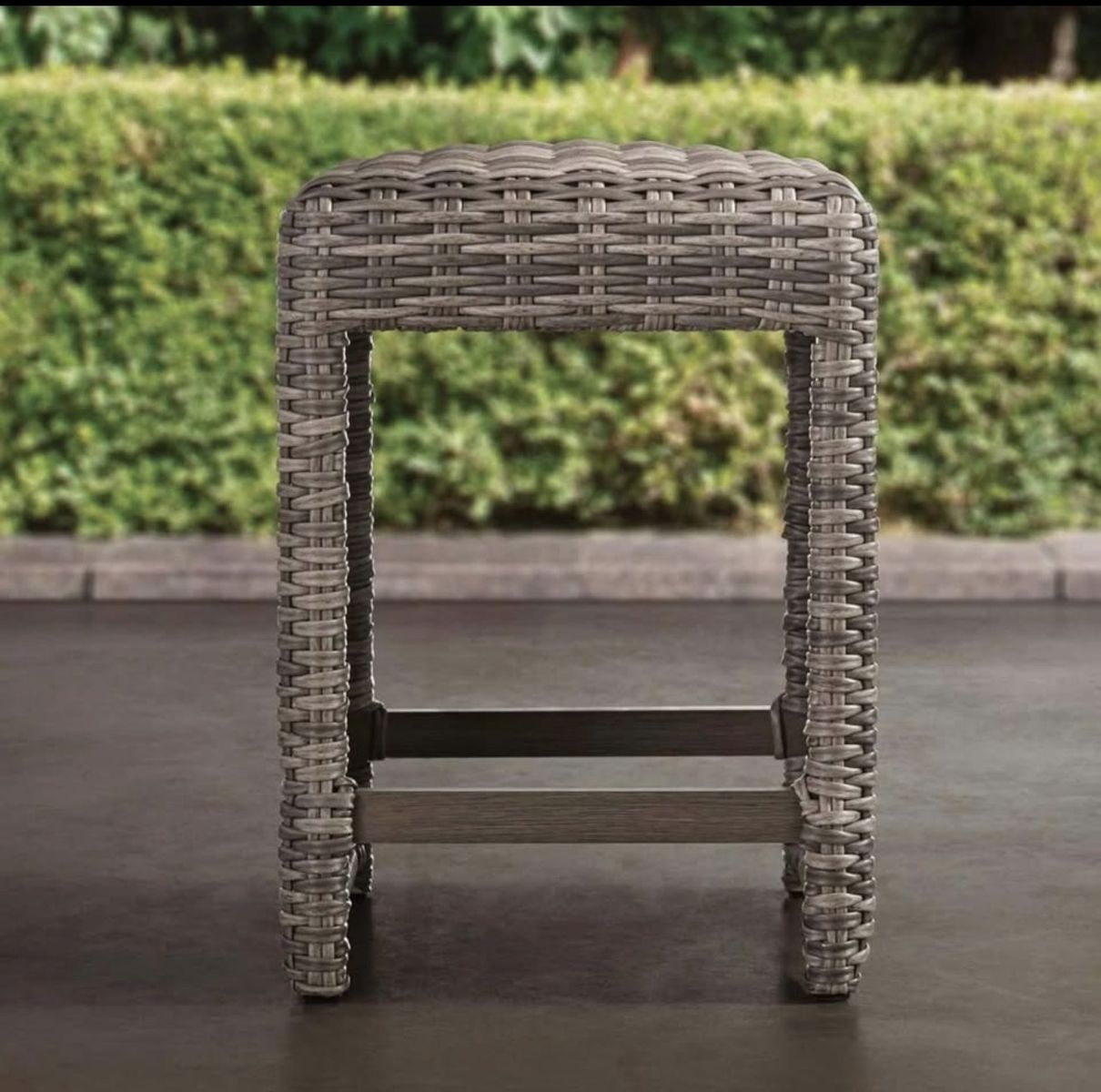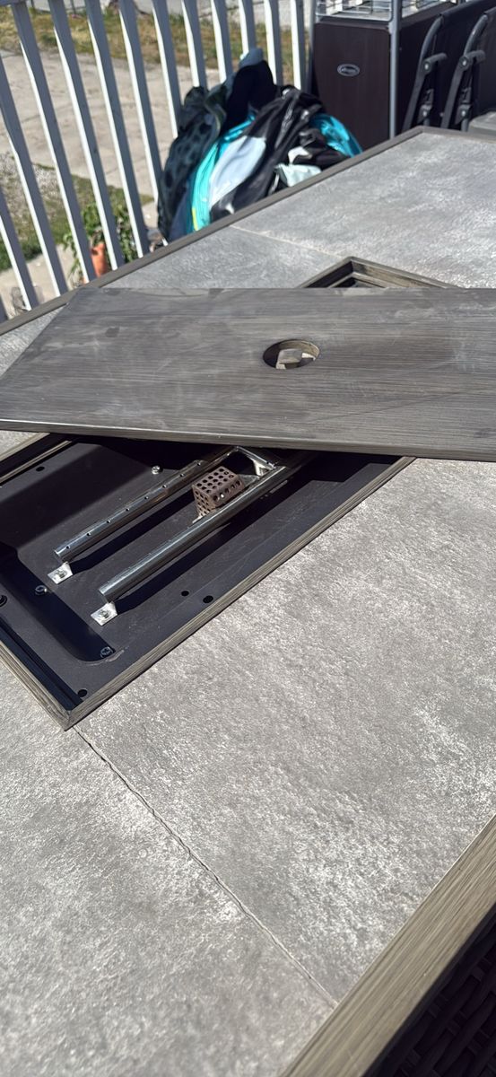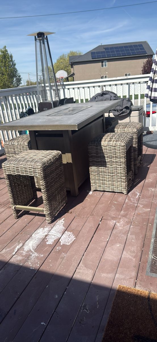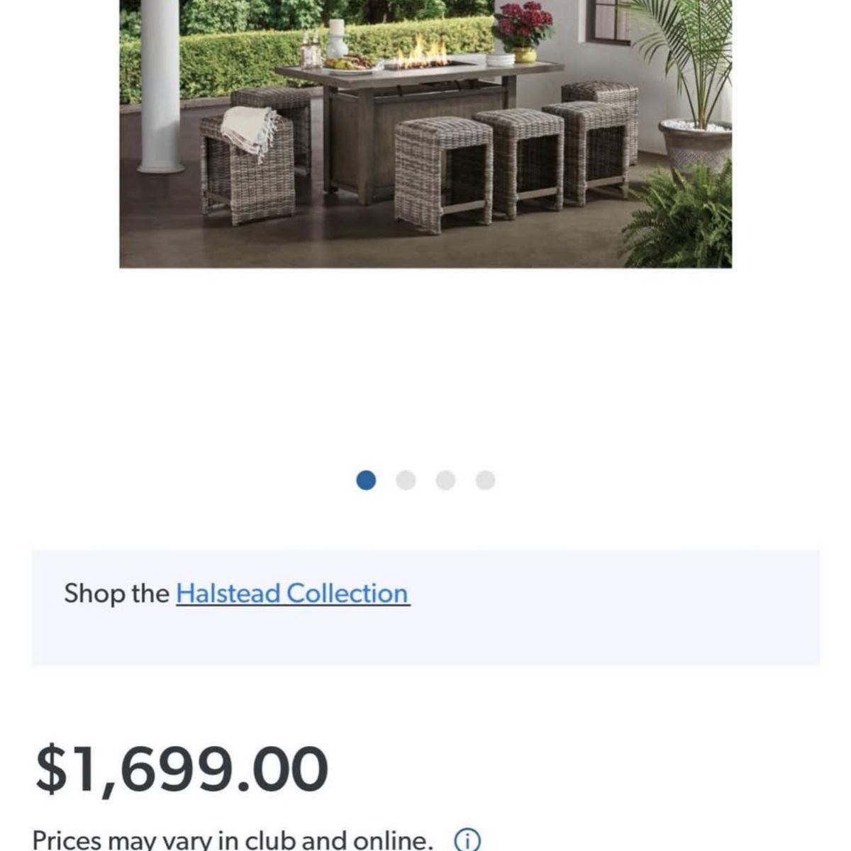 Member's Mark Halstead 7-Piece Bar Set features a liquid propane fire element that makes it a space-saving solution for an outdoor living area. The six quick-drying padded wicker stools make this bar set a true space saver, while still offering a 72 x 37 tabletop. The faux concrete porcelain tile tabletop provides durable strength with a neutral look. Part of Sam’s Club exclusive Halstead collection, the large fire element is accented perfectly by shattered fire glass and features the clean lines and transitional styling associated with all of the Halstead items. Changing the standard 20 lbs. LP tank is easy with the smooth gliding door that hides the tank. Looks new, but does have a scratch on the fire table. Firm on price, I’m already $1000 below retail price 17.3 x 17.3 x 26.8 It needs four screws for the table top if you want to secure it, As does need to be cleaned . Has a hair line crack in the tile on top