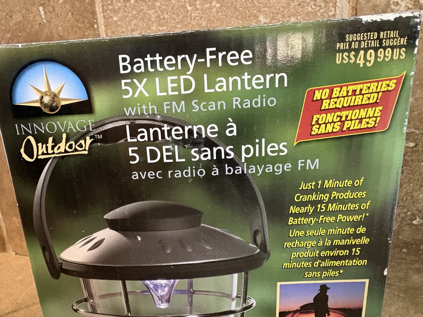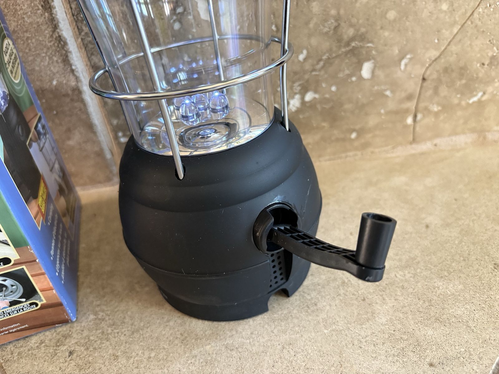 I have a small lantern with a hand crank. It works for up to 15 minutes after cranking for 1 minute. It does not use batteries. It also has an FM Radio. It is about 9 1/2 inches tall. The box doesn’t look great but the lantern is like new. See my other ads for jewelry, artwork, home decor and more.