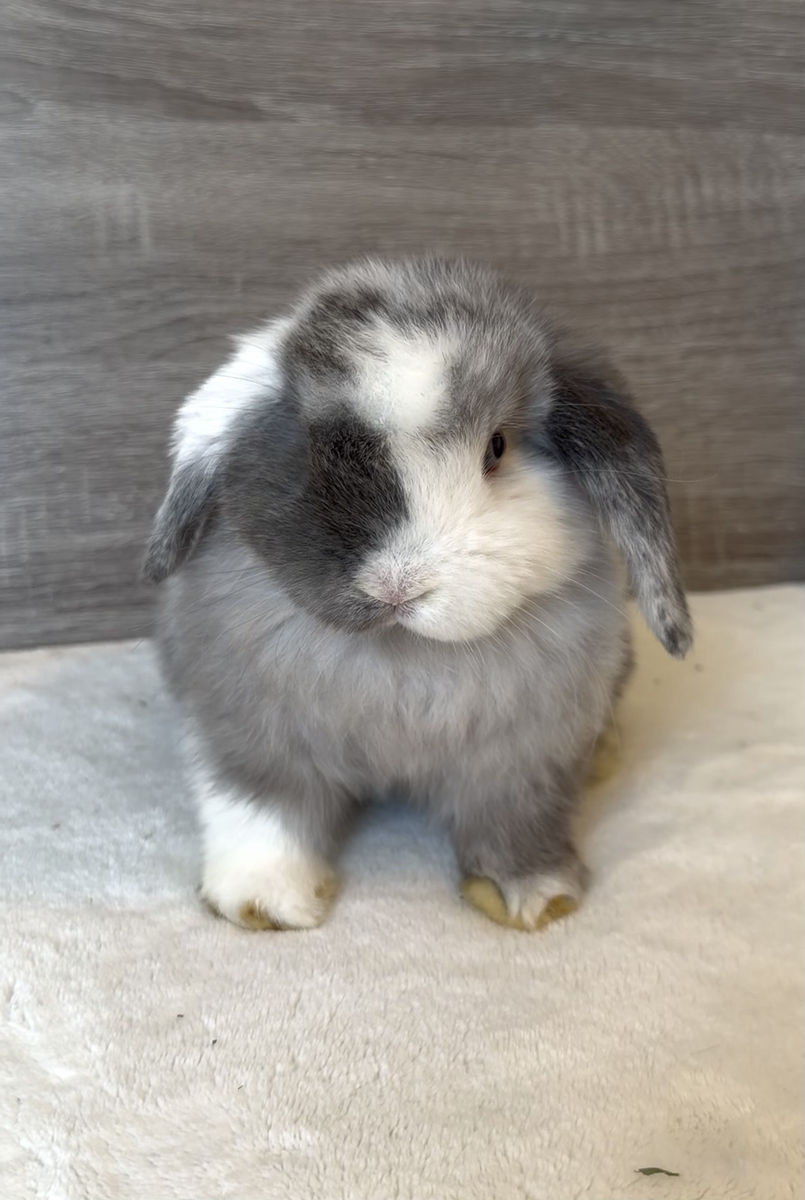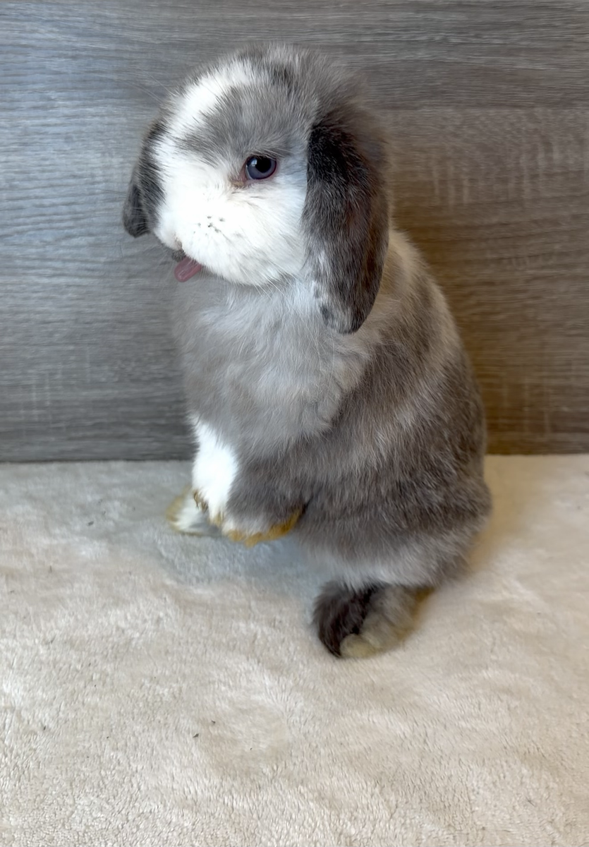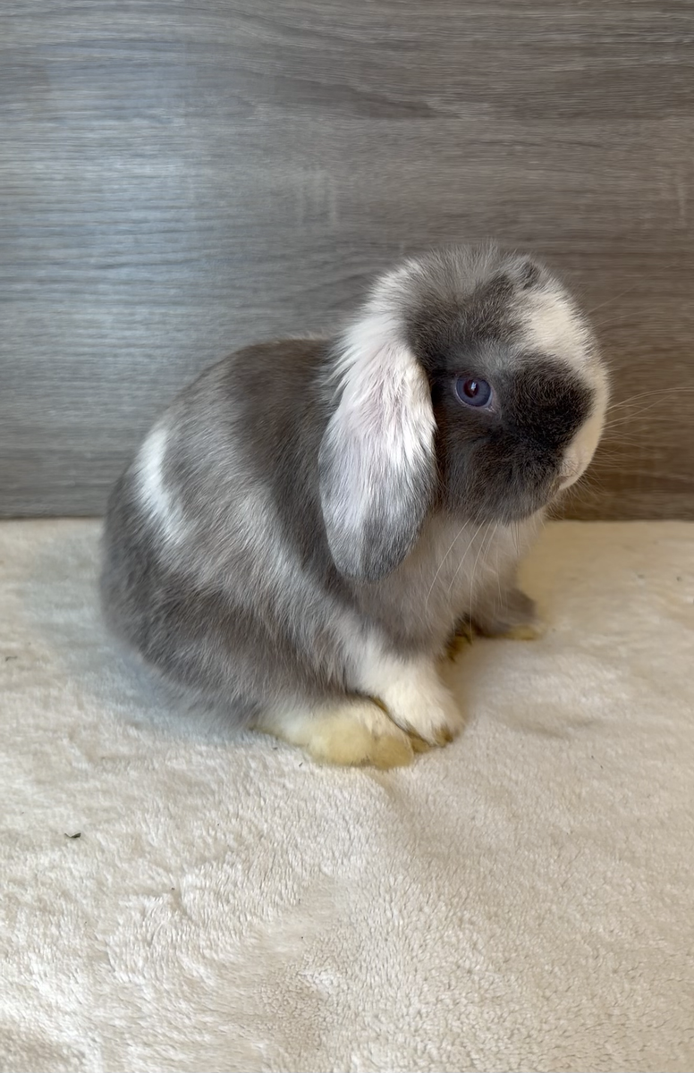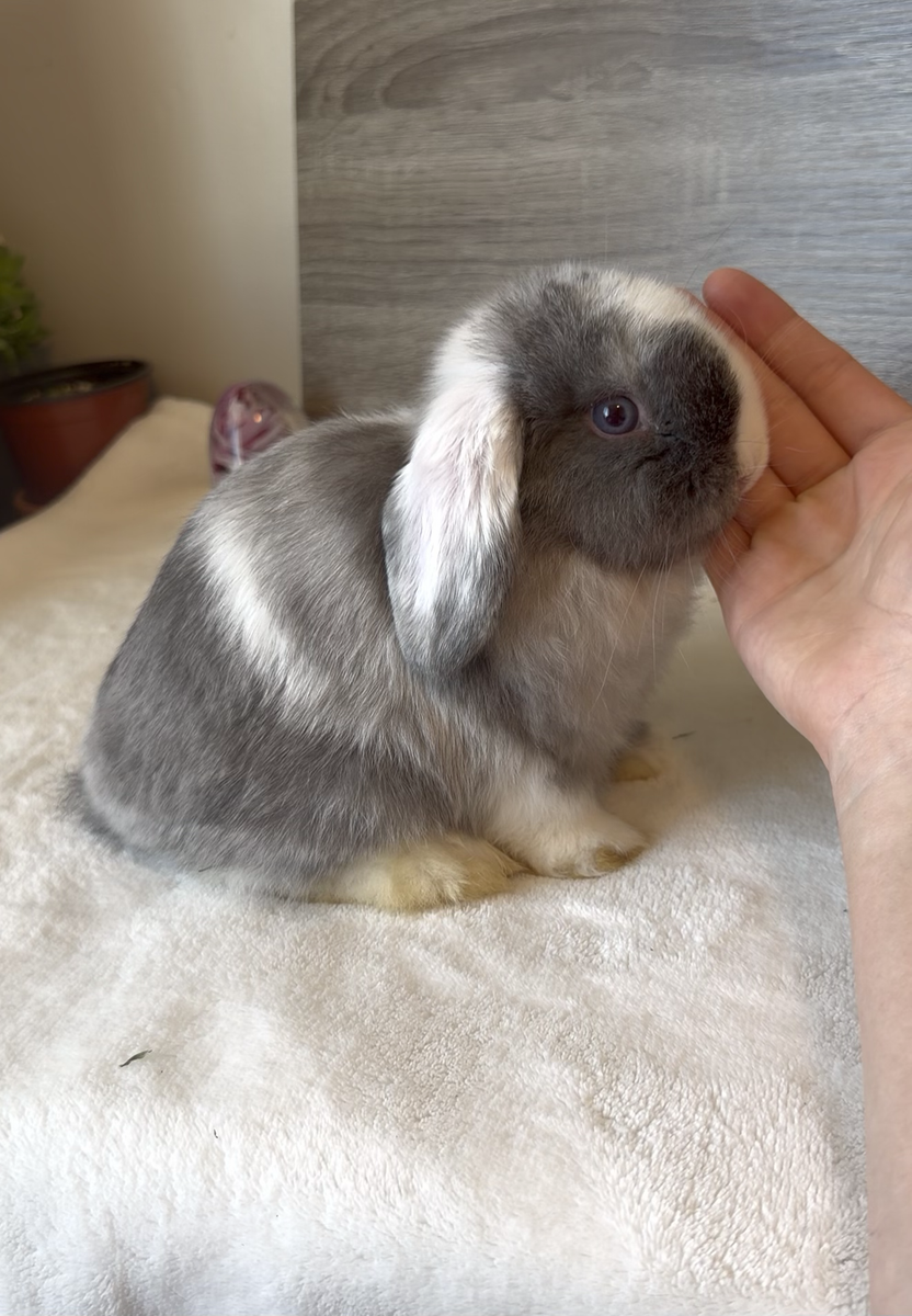 Meet Dove! An adorable Holland Lop doe with a gorgeous Blue Magpie Vm coat and soft blue eyes! Dove is an adorably sweet doe who is just too cute! She is friendly and sweet but on the more shyer side but warms up quickly to people as long as you give her loads of affection! She has been held daily since day 1 and is very used to it. She is such a sweet, gentle, shy doe who is so perfect! She was born February 14 and is ready to hop to her furever home this Saturday! Dove has been raised around people of all ages, dogs, and has been raised outdoors but can be an indoor pet. When she leaves she will be given a fresh nail trim, a bag of food(pellets) and a lifetime of support!