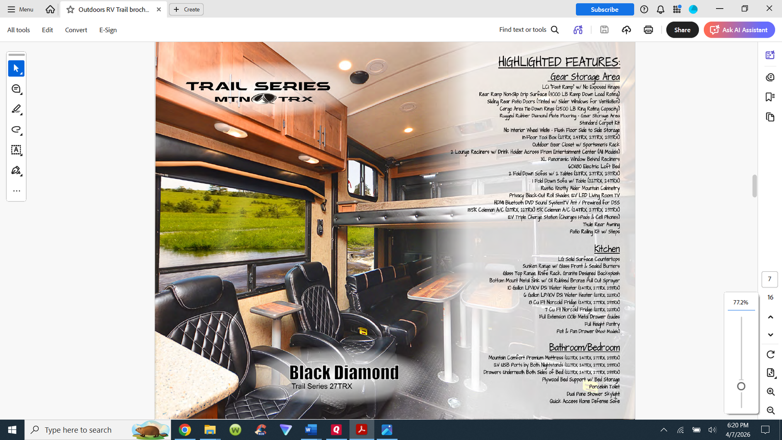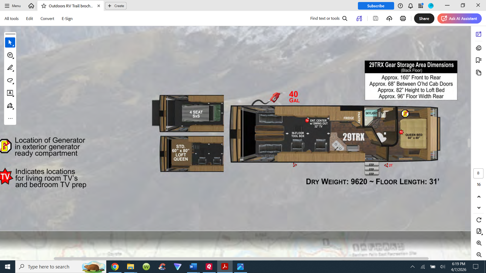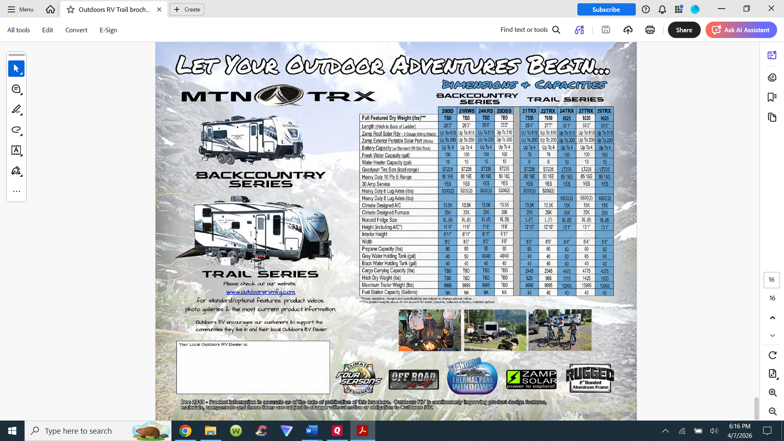 Dimensions, specs, and pictures are best viewed at the Outdoors RV website. https://outdoorsrvmfg.com/trail-series-29trx/