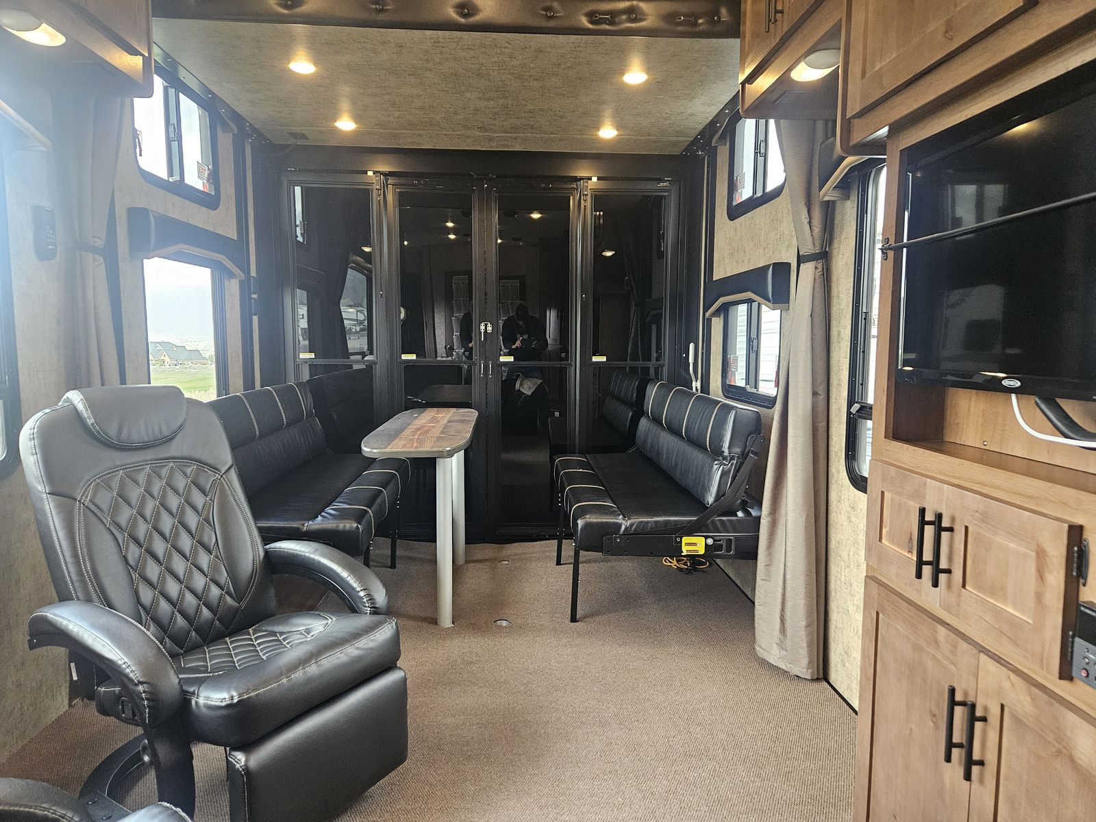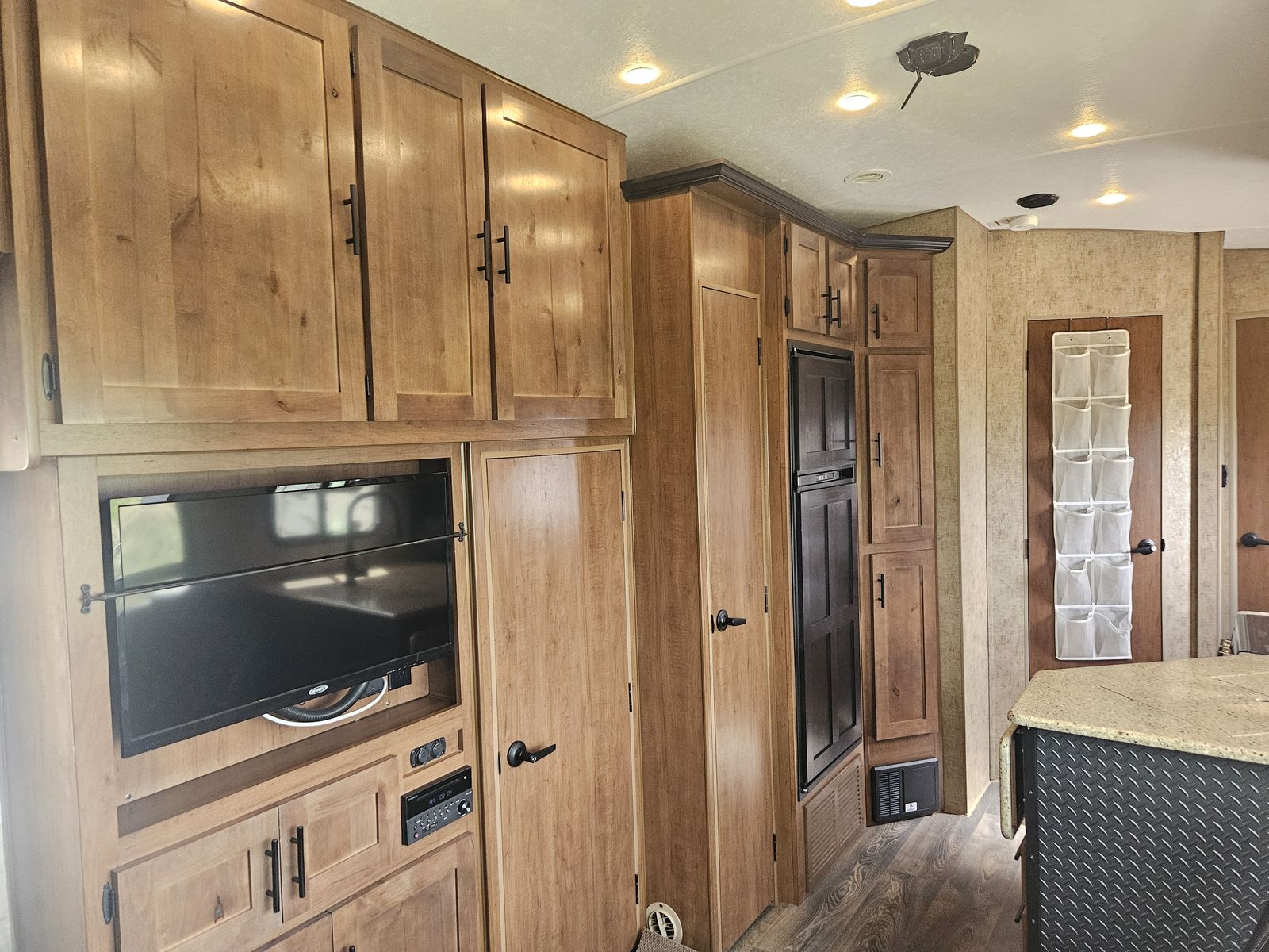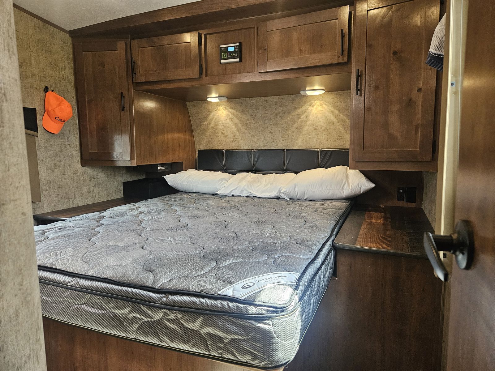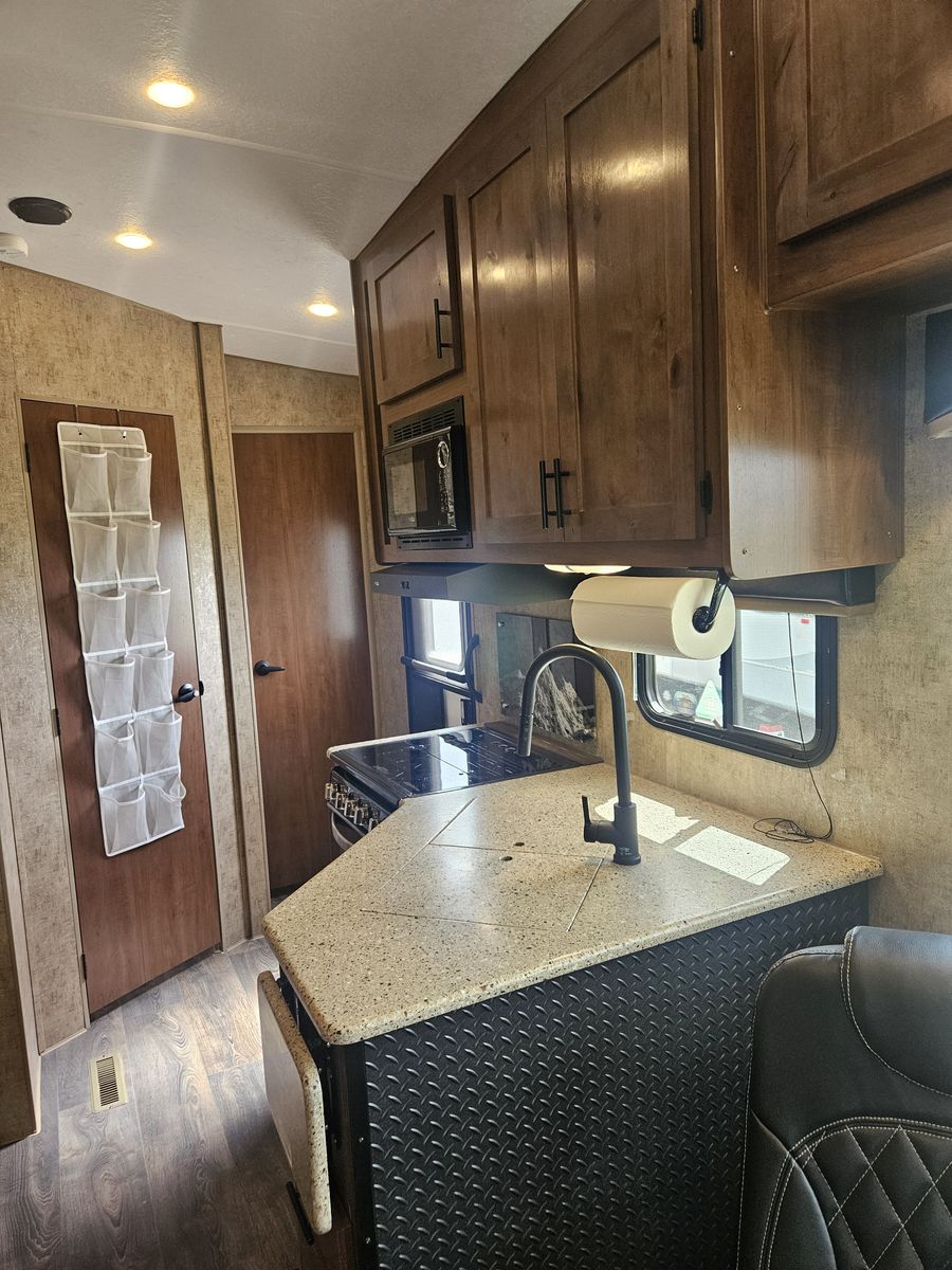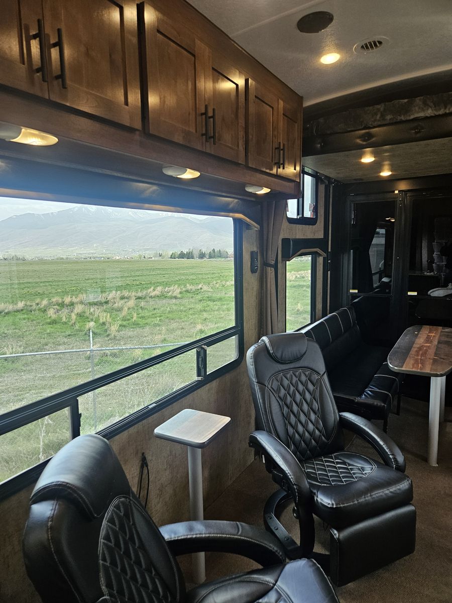 Comes with the Weigh Safe Heavy-Duty weight distribution hitch (https://www.weigh-safe.com/product/true-tow-weight-distribution-hitch/). Probably the best hitch on the market for this weight trailer. Includes Furrion cameras located on both sides of the RV, one on the RV rear, and one on the interior facing the toy hauler area. Addons include (dimmable interior and exterior lighting, and LevelMatePro (Bluetooth-enabled vehicle leveling system).