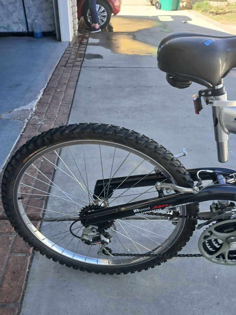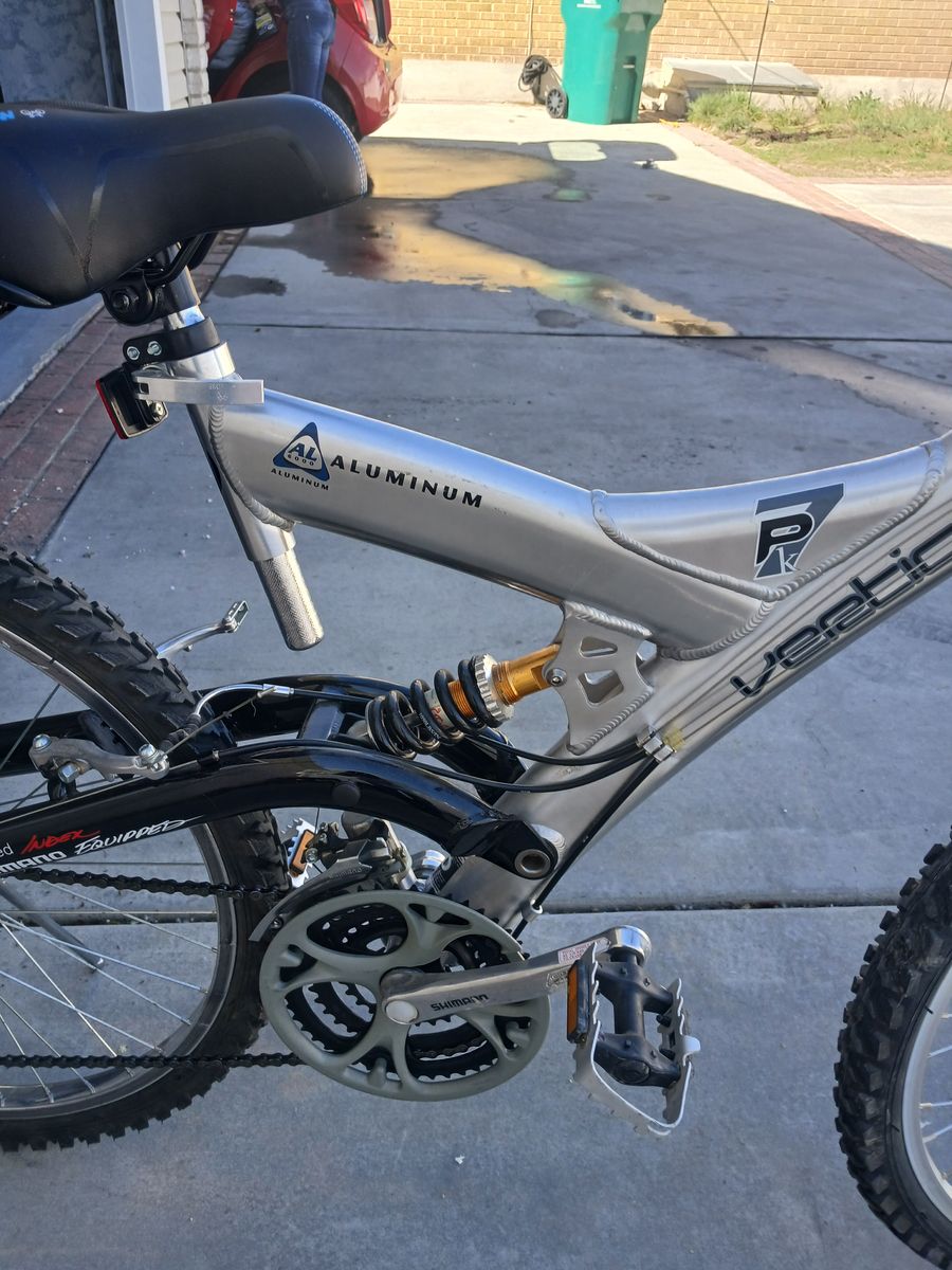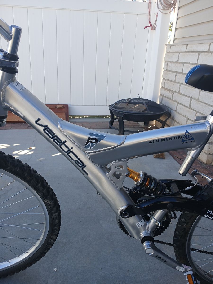 Vertical PK7 mountain by 21 speed aluminum\nRebound downhill shock, this bike is an excellent condition.It is twenty six inches.
