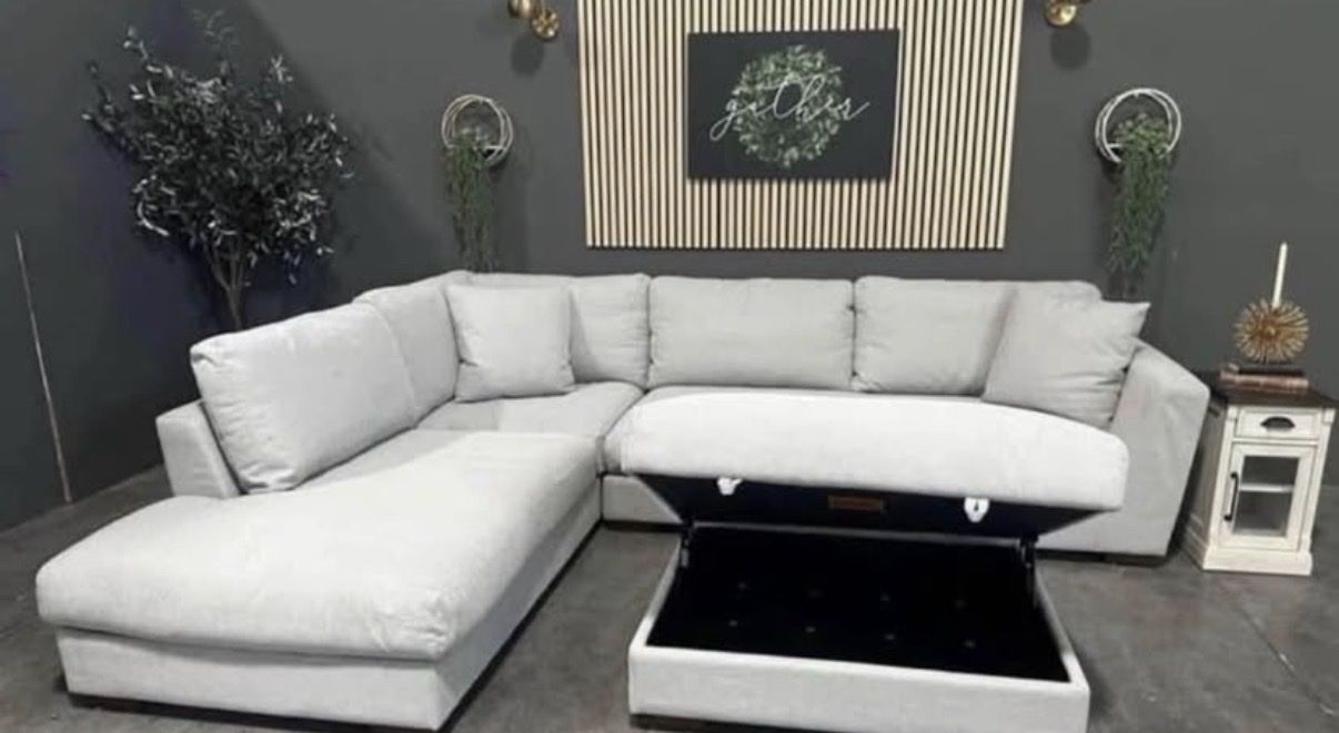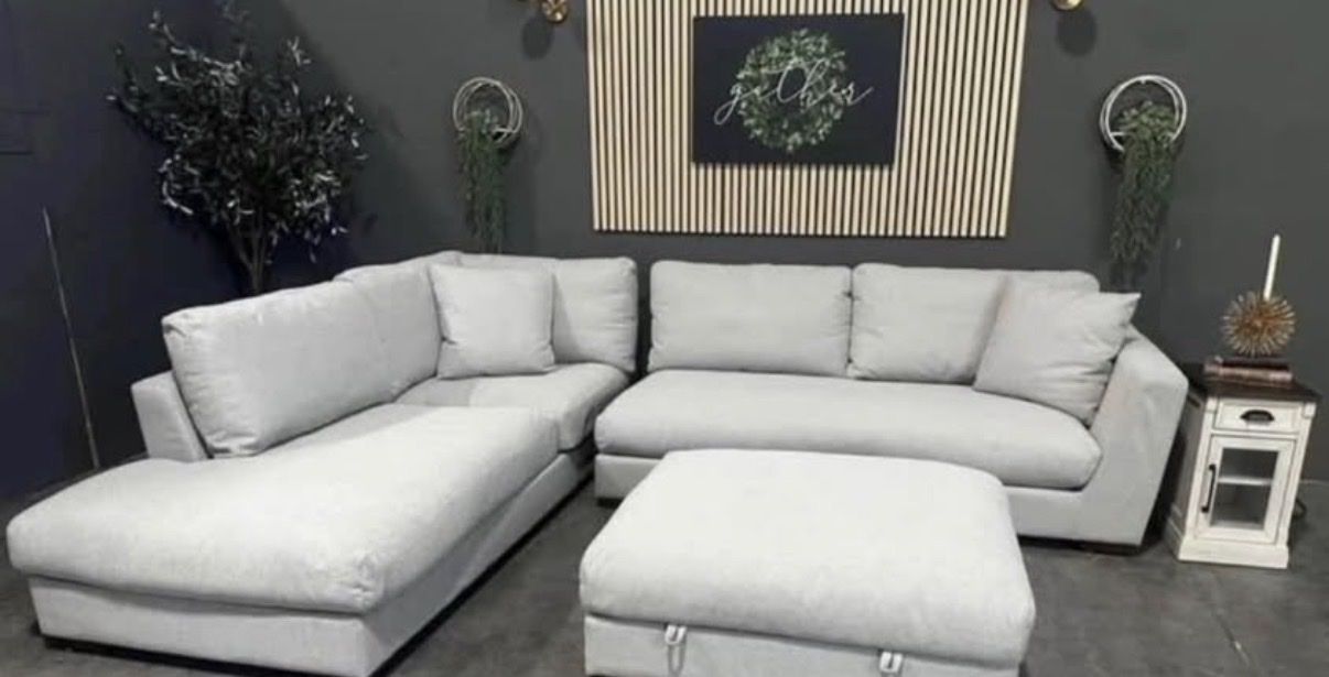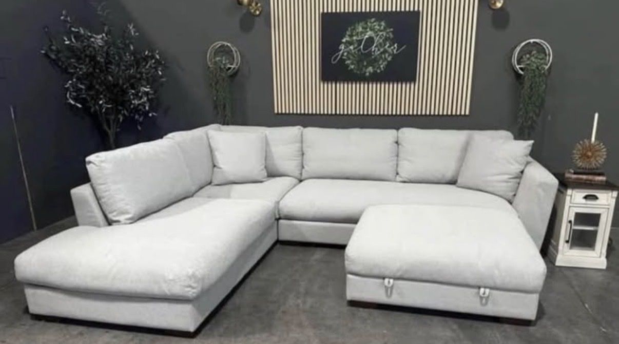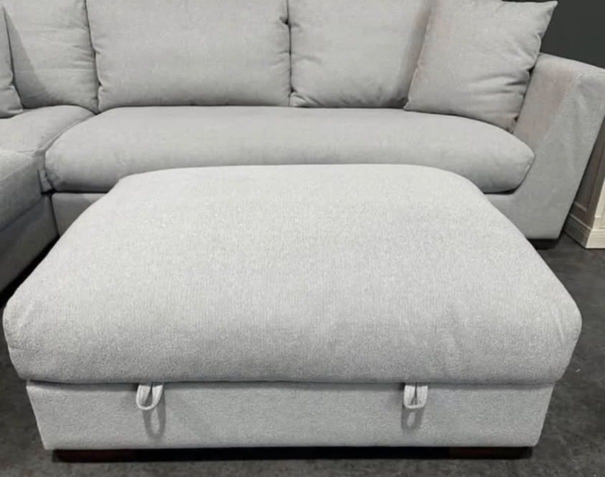 Transform your living space with our sophisticated Henredon Larkin House Sectional Chaise and Storage Ottoman, where luxury meets unparalleled comfort. This sectional is wrapped in sumptuous 100% polyester fabric, crafted from eco-friendly REPREVE® fibers for both elegance and sustainability. Revel in the ultimate relaxation offered by ultra-soft feather and fiber filled cushions and spacious deep seating. The loose and reversible back cushions ensure ease of care, while the large storage ottoman provides a refined solution for maintaining an organized space. Supported by solid wood, block-shaped legs, this sectional perfectly combines durability and sleek design, making it an essential piece for any high-end home.