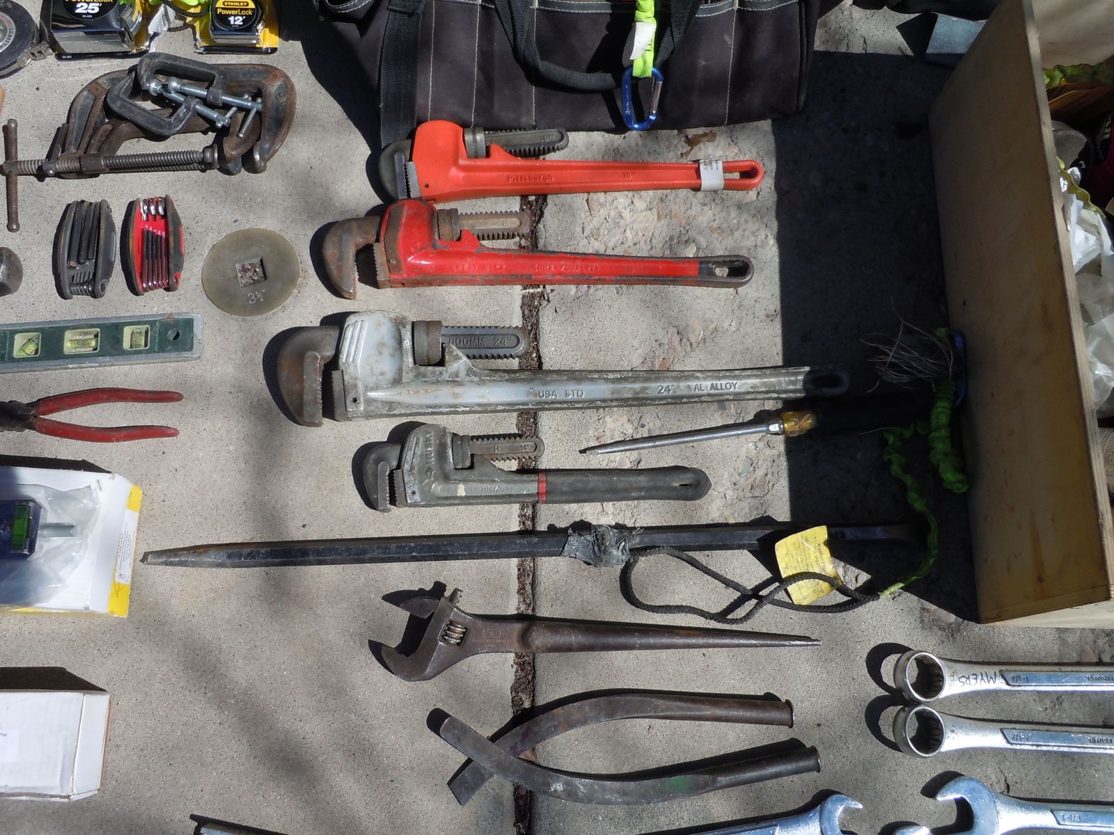 Center finder as new, flange pins, multiple combination wrenches, pipe wrenches, vise grip tools, flange tools, tape measures, squares, tool bag, toolbox, and lots of miscellaneous items. Center finder and flange pins were $200 alone. Approx $650 total purchases. Need to sell all together. $225.00 for everything. 225-939-3810