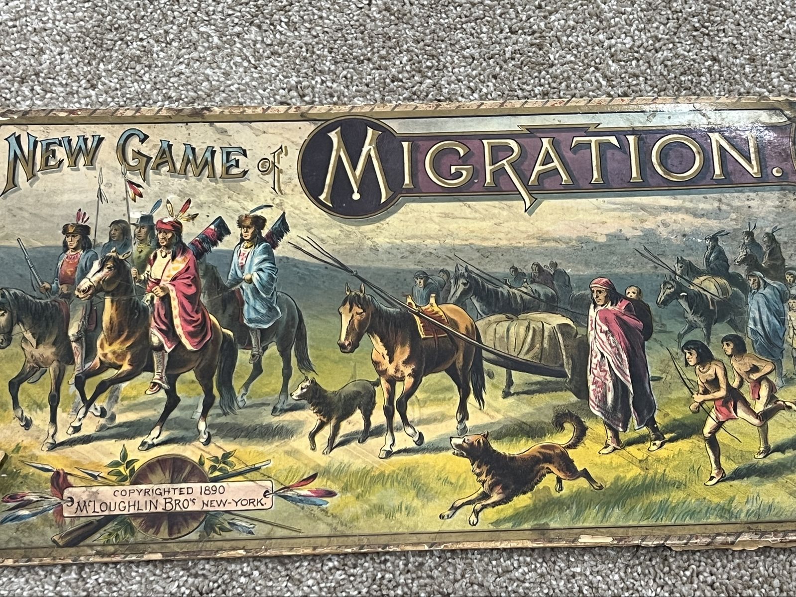 VenmoThis is the box cover and game board ONLY for the New Game of Migration, an antique board game published by the McLoughlin Brothers, New York in 1890. Features detailed chromolithograph artwork typical of the late 19th century. The game cover depicts a historical scene of Native American migration. The board o on very good condition for its age with bright artwork and only a small place shed the board is separated along the seam. The box top cover has damage along the edges where the sids bent or tore away, but the art area is in great condition for its age. Pick up in Draper. Pet and smoke free home. Cash or Venmo. $75
