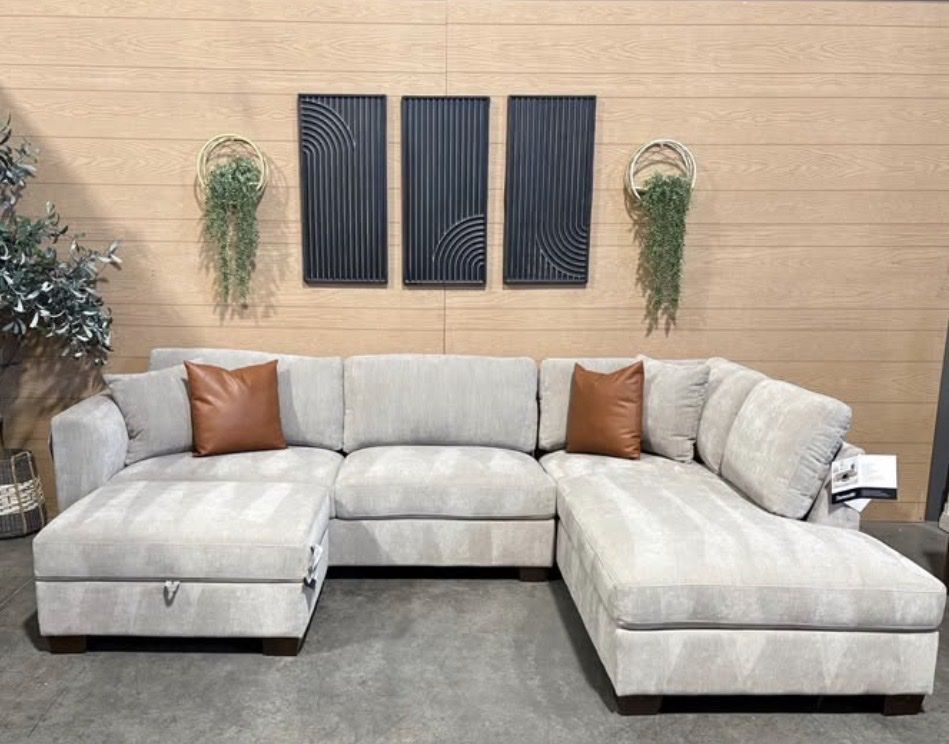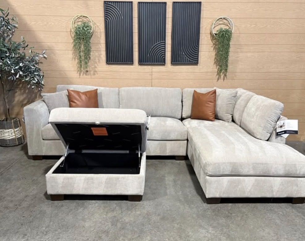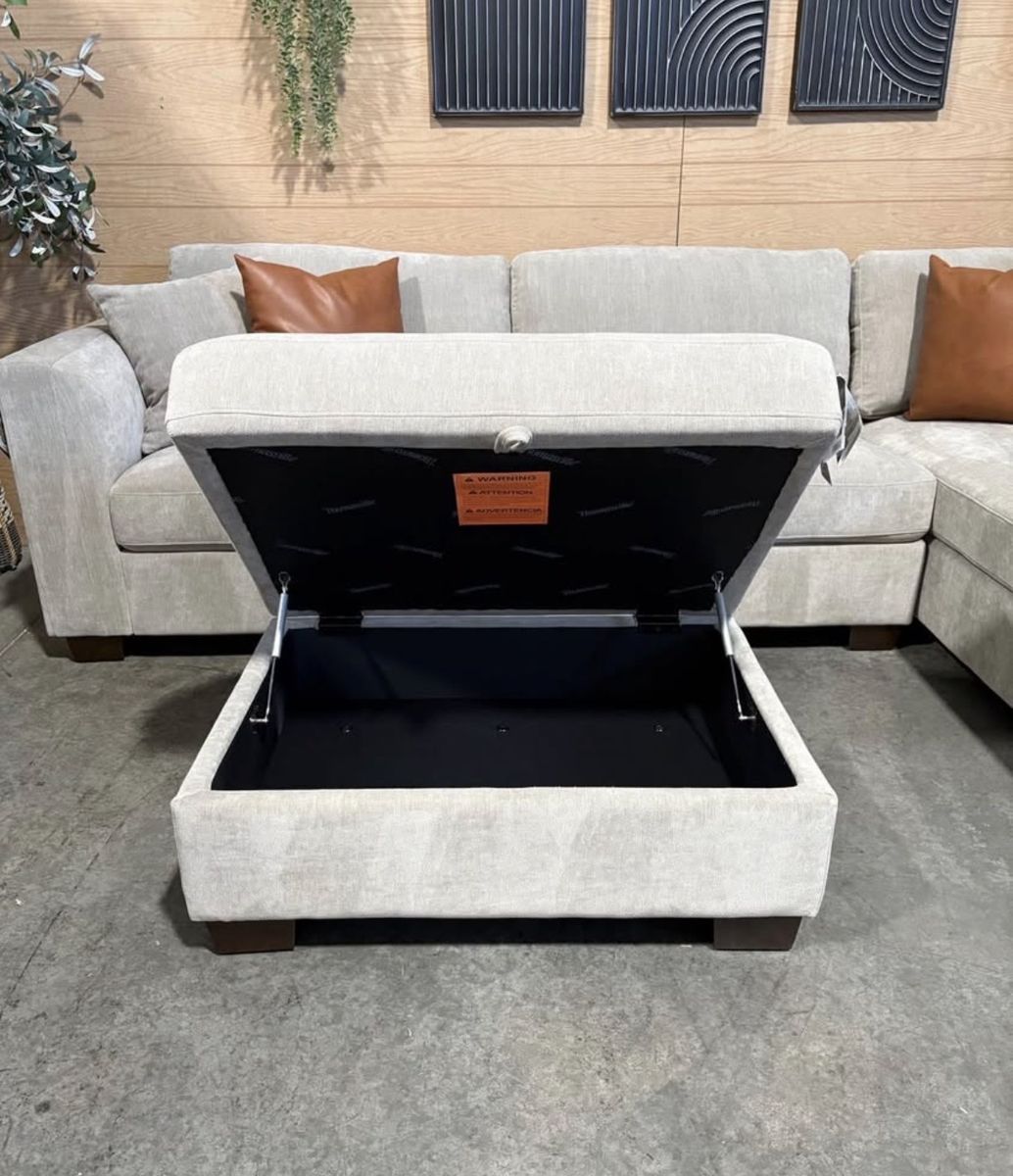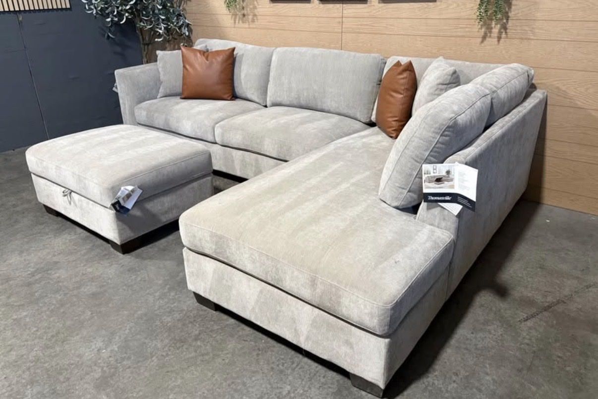WHY YOU WILL LOVE THIS SECTIONAL... Transform your living room with the Thomasville Walsen Sectional Chaise with Storage Ottoman. Luxurious, soft polyester fabric and firm seat cushions offer the perfect blend of comfort and support. The modern track arm and solid wood tapered legs add a touch of elegance, while the lounging chaise and storage ottoman provide unmatched versatility. With two stylish accent pillows and practical attached cushions, this sectional is designed for both beauty and functionality. Enjoy ultimate relaxation and chic style with Thomasville.