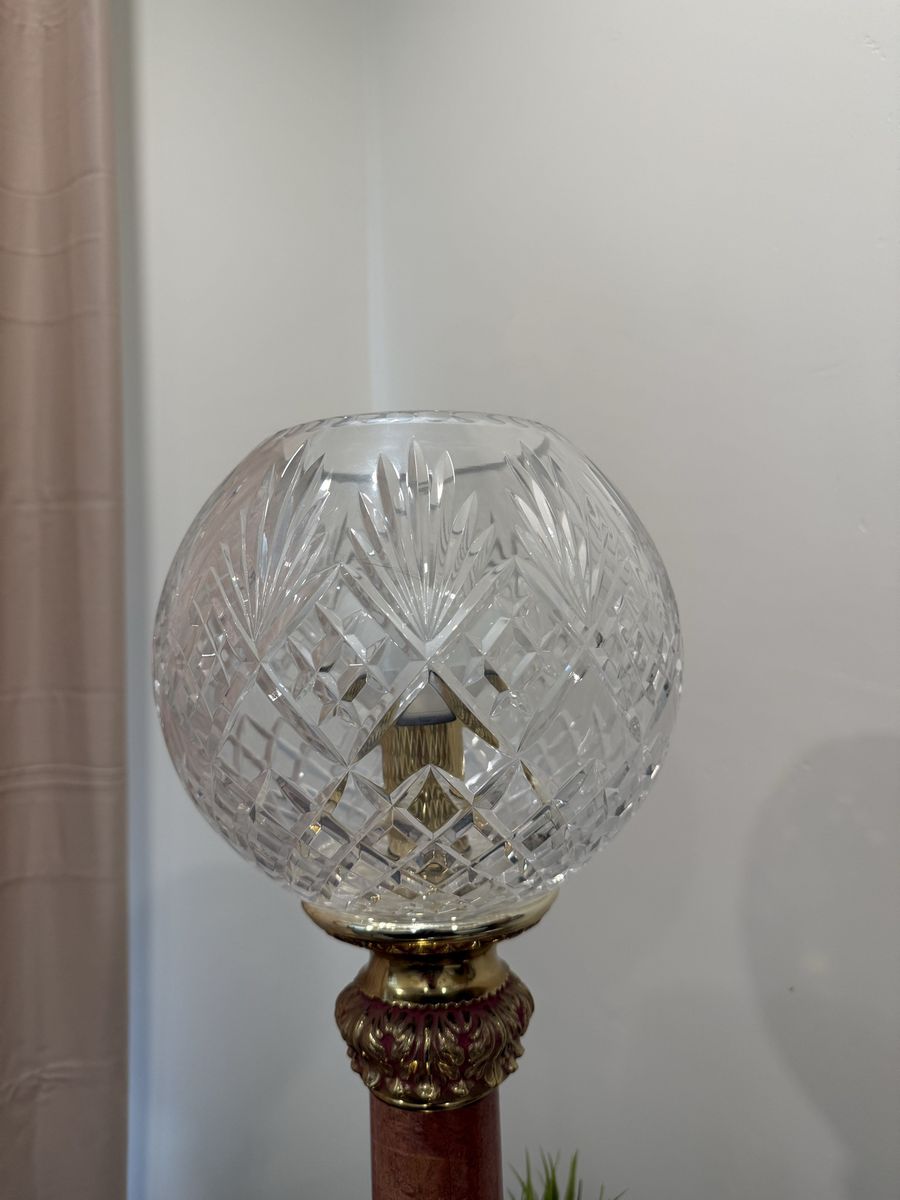 VenmoStunning vintage table lamp sourced from a local estate sale. Features a solid pink and rose marble column, ornate brass base with detailed relief work, and a beautifully cut crystal globe shade that throws gorgeous light when lit. Heavy, well made and full of character. Works perfectly and is in excellent condition with only light normal wear for its age. This is a substantial high quality lamp not a modern lightweight reproduction.