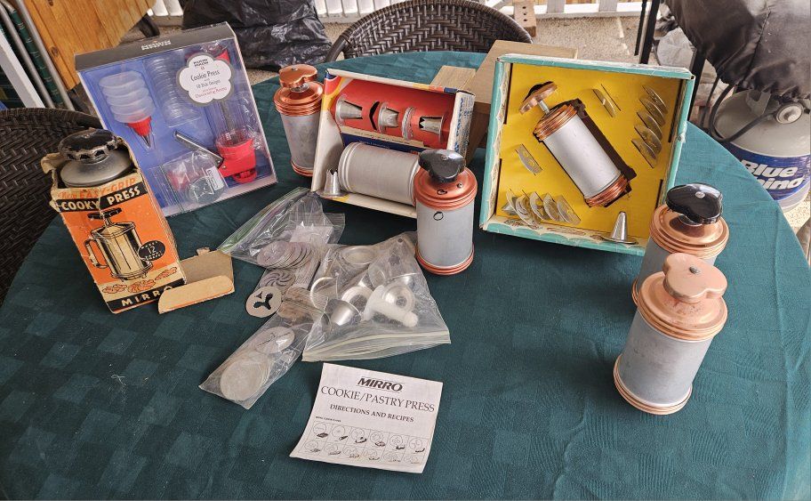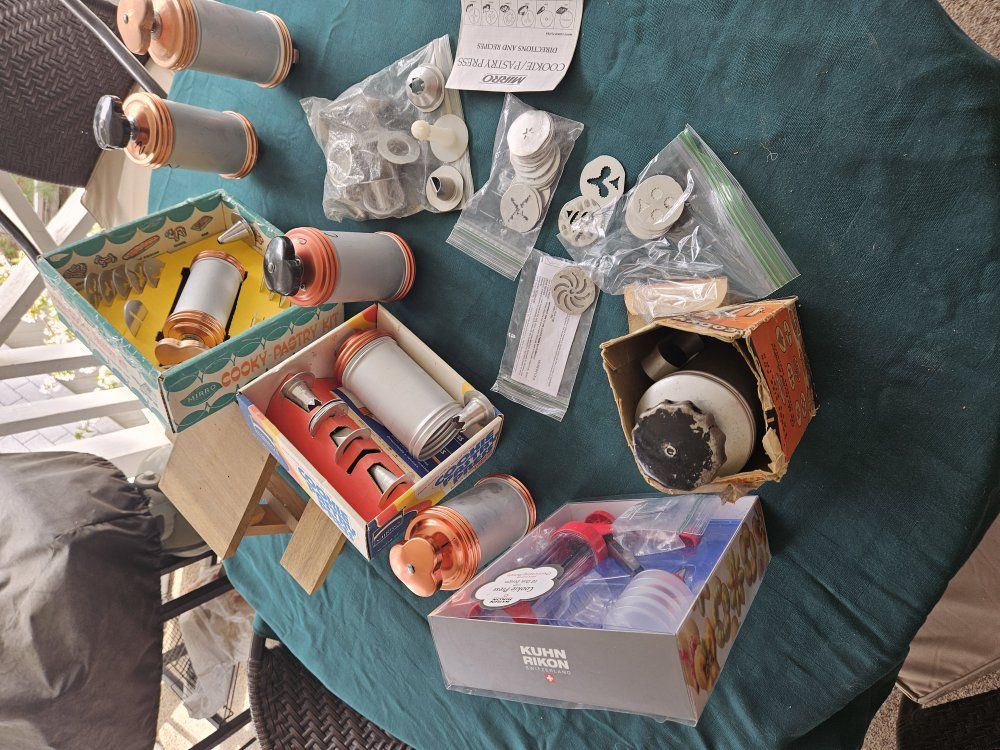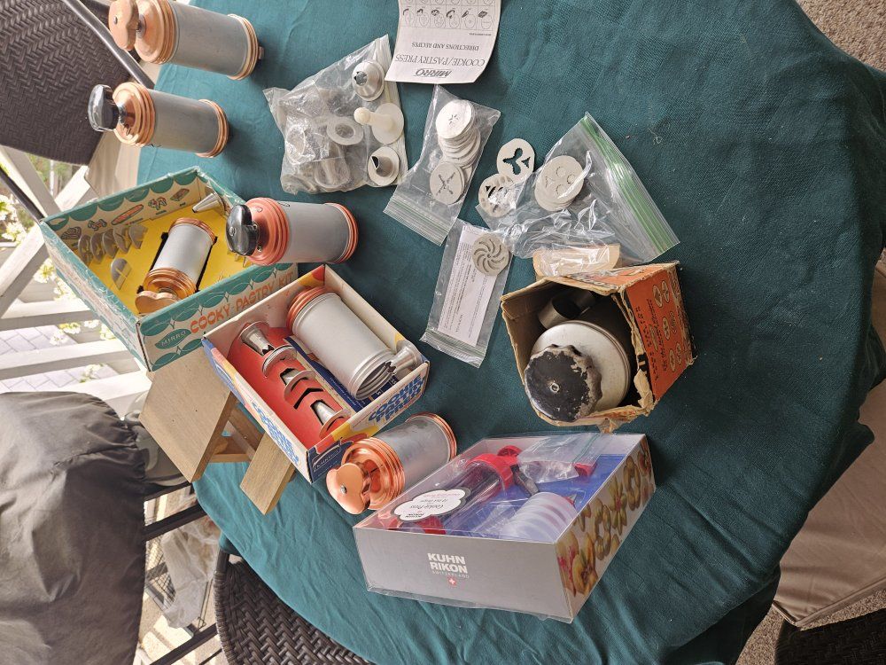 VenmoVarious presses, one Kuhn Rikon and five Mirro brand presses. Many plate inserts for different styles of cookies. Includes injector nozzles for filling pastries.