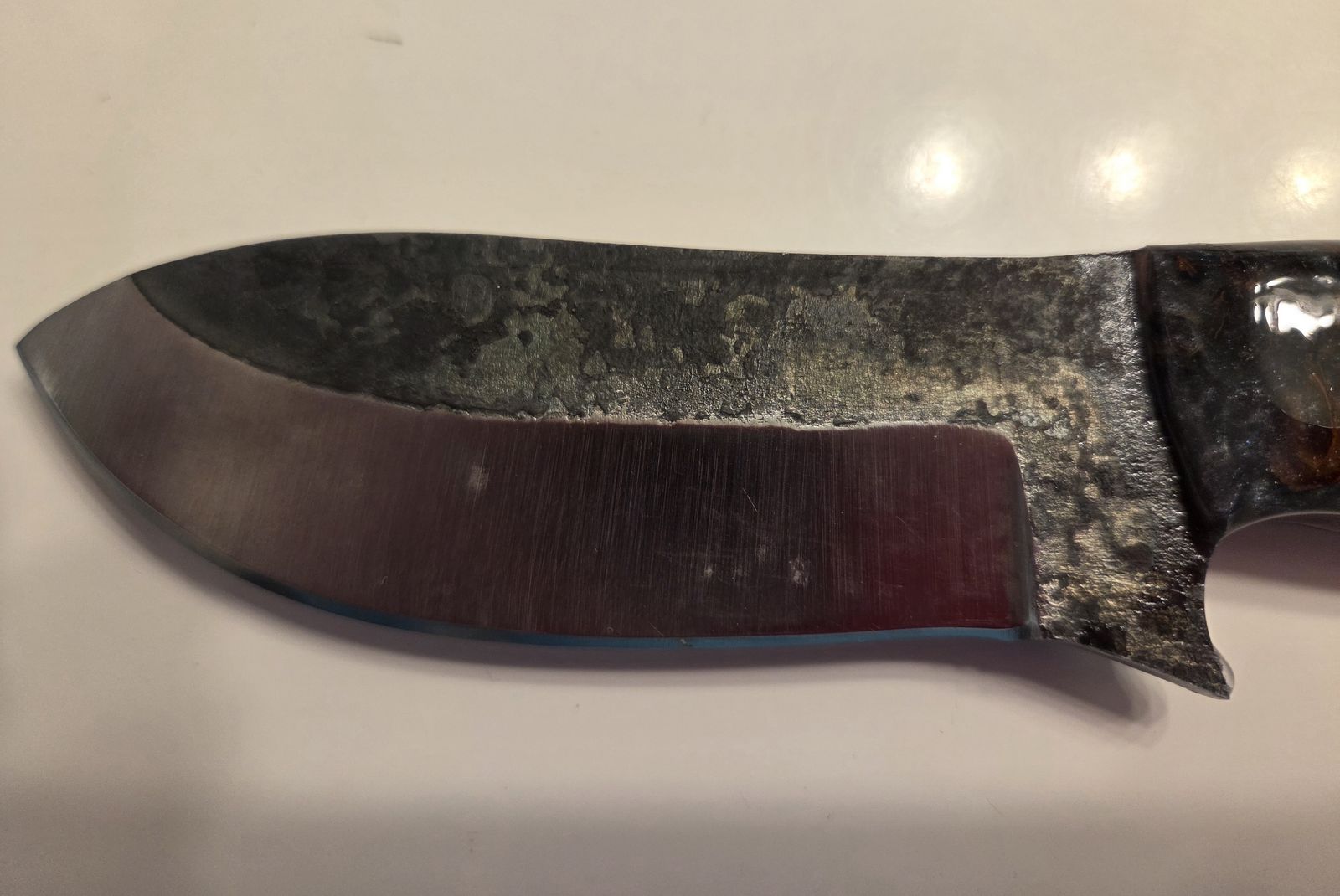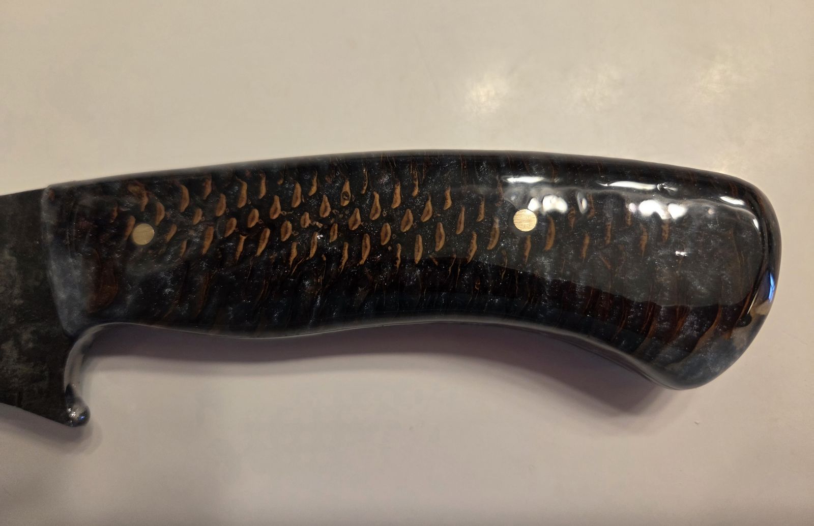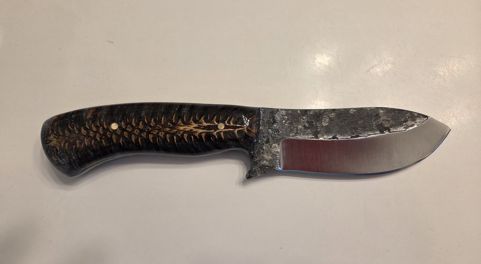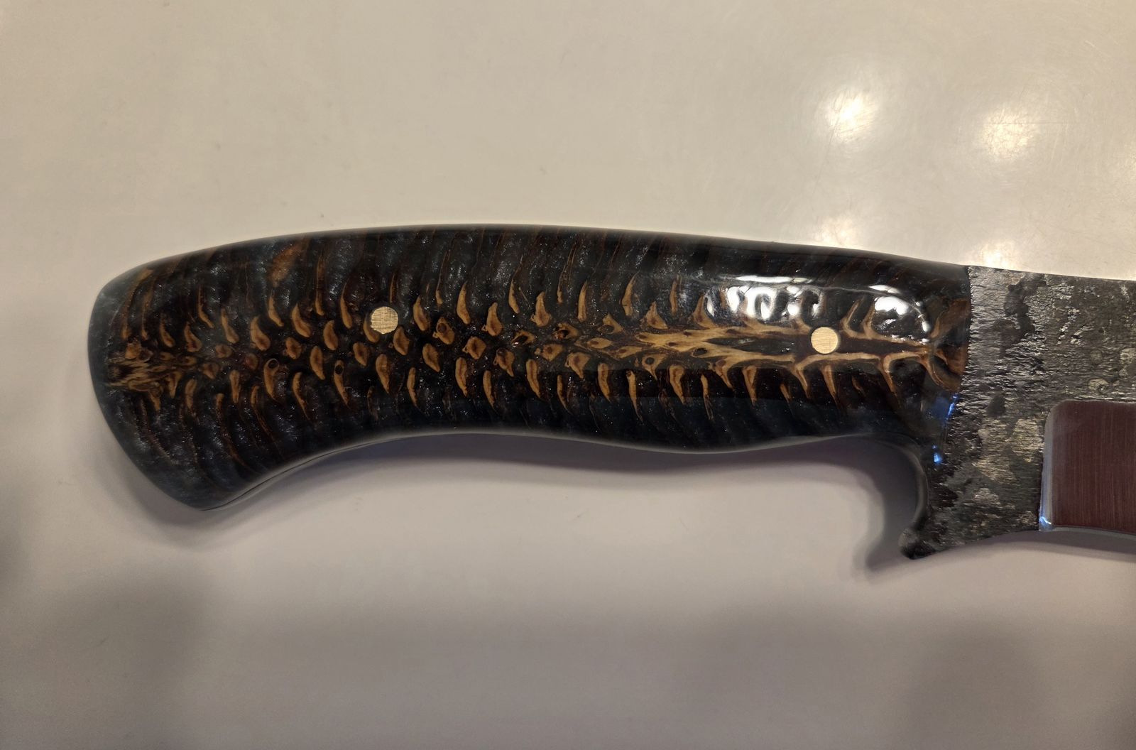 VenmoFor sale is a "distressed" appearance C2 high carbon steel blade knife with an awesome pinecone handle. Knife is 8 1/2 inches long with a 4 1/4 inch blade. Blade is 3/16th of an inch thick. You've got to see it to really appreciate the beautiful, slightly menacing look of the handle. It fits perfectly with the purposely rusted and pitted blade.
