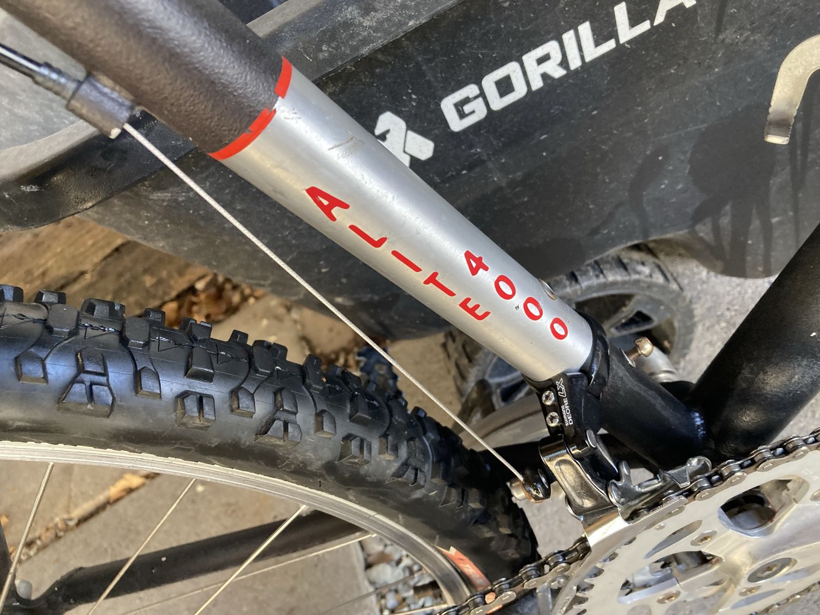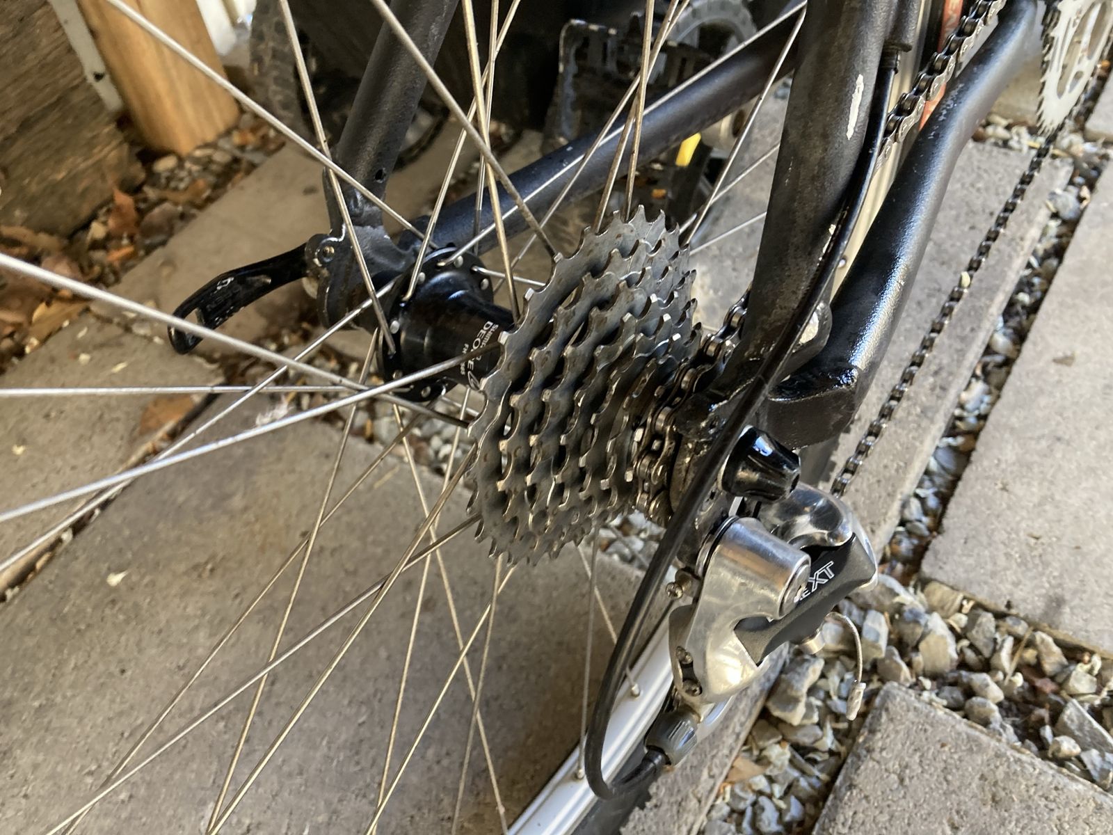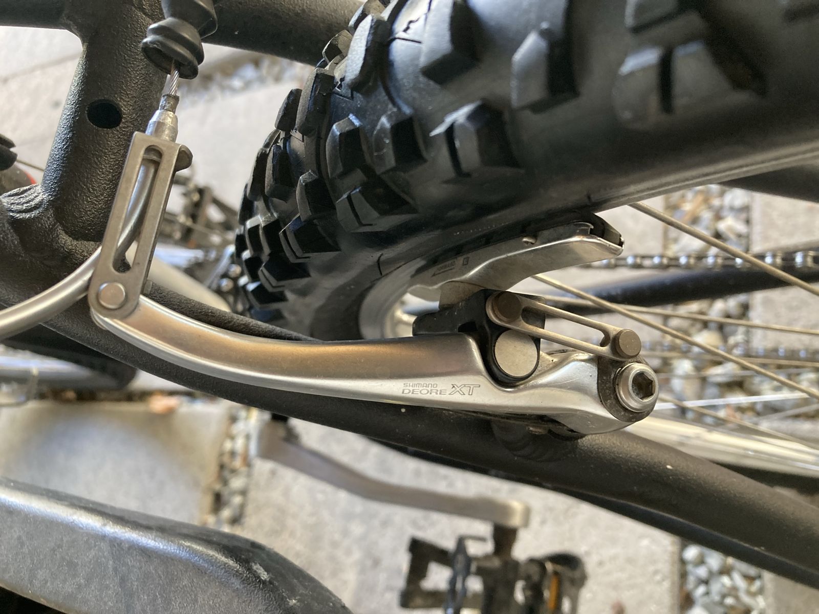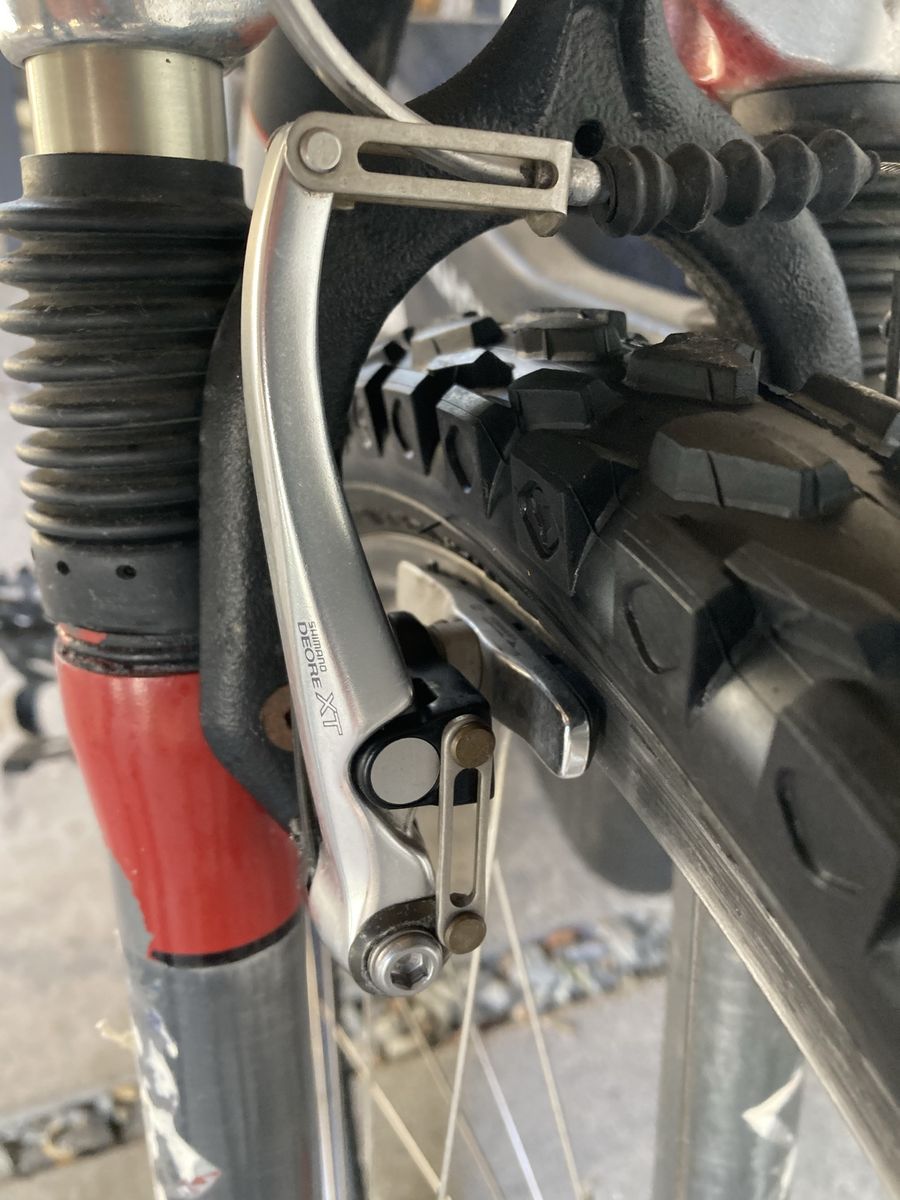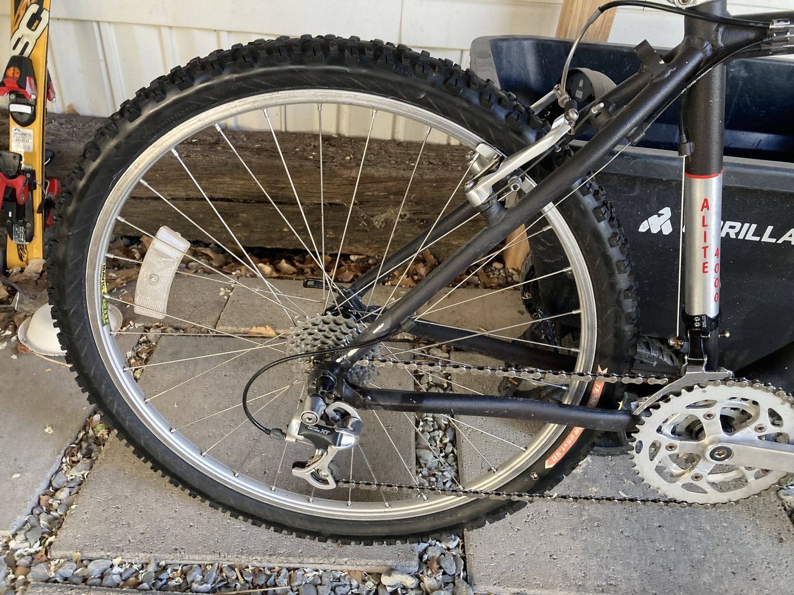 Is got a Shimano deore xt group set works great it’s a 3x8 speed the brake calipers are nice ! You don’t see a lot of those anymore. Shows it’s cosmetics from use they do not affect the function the bike is clean and working Has like a sort of tough rhino lining black/gray style of pant to protect the frame