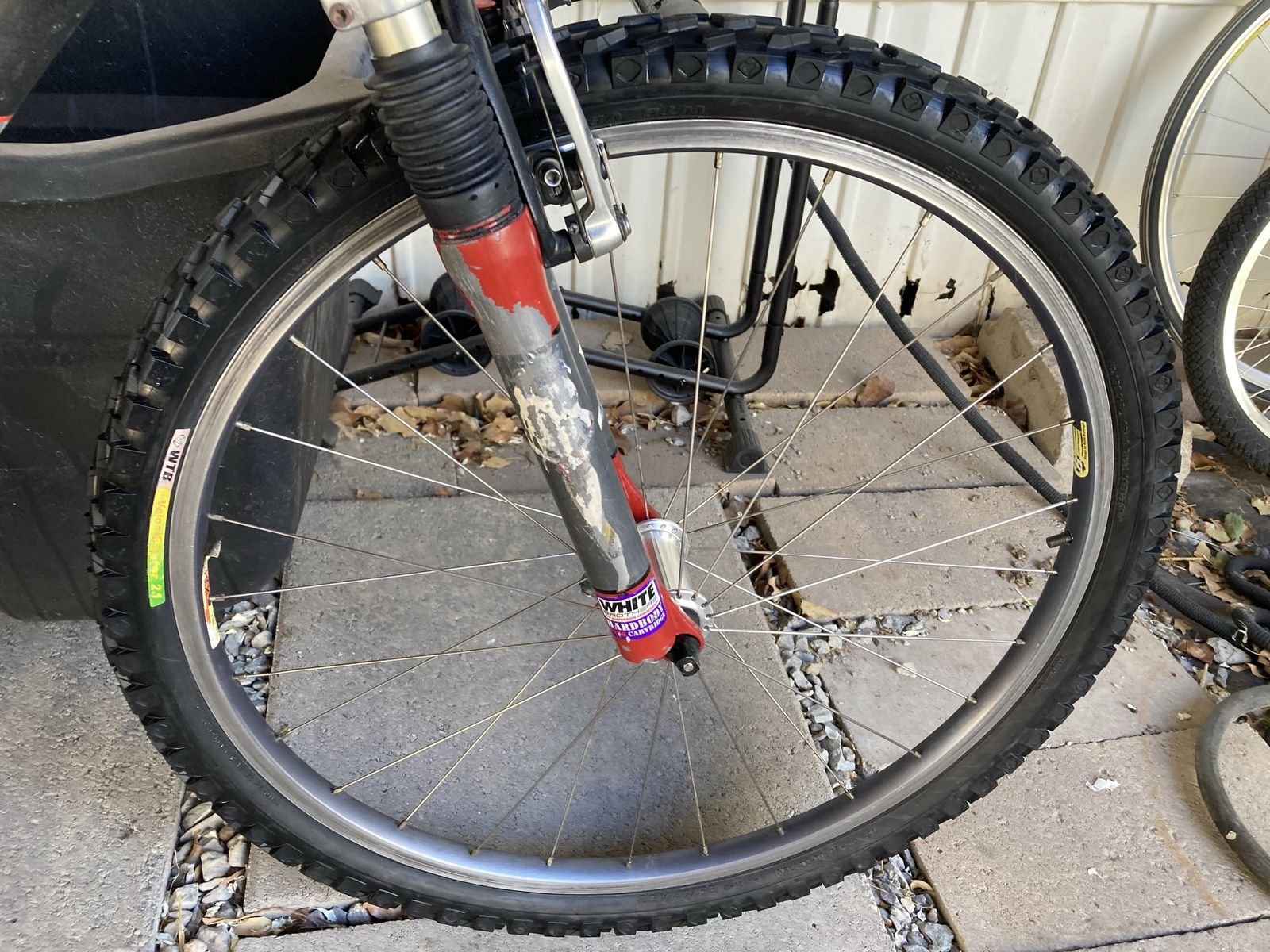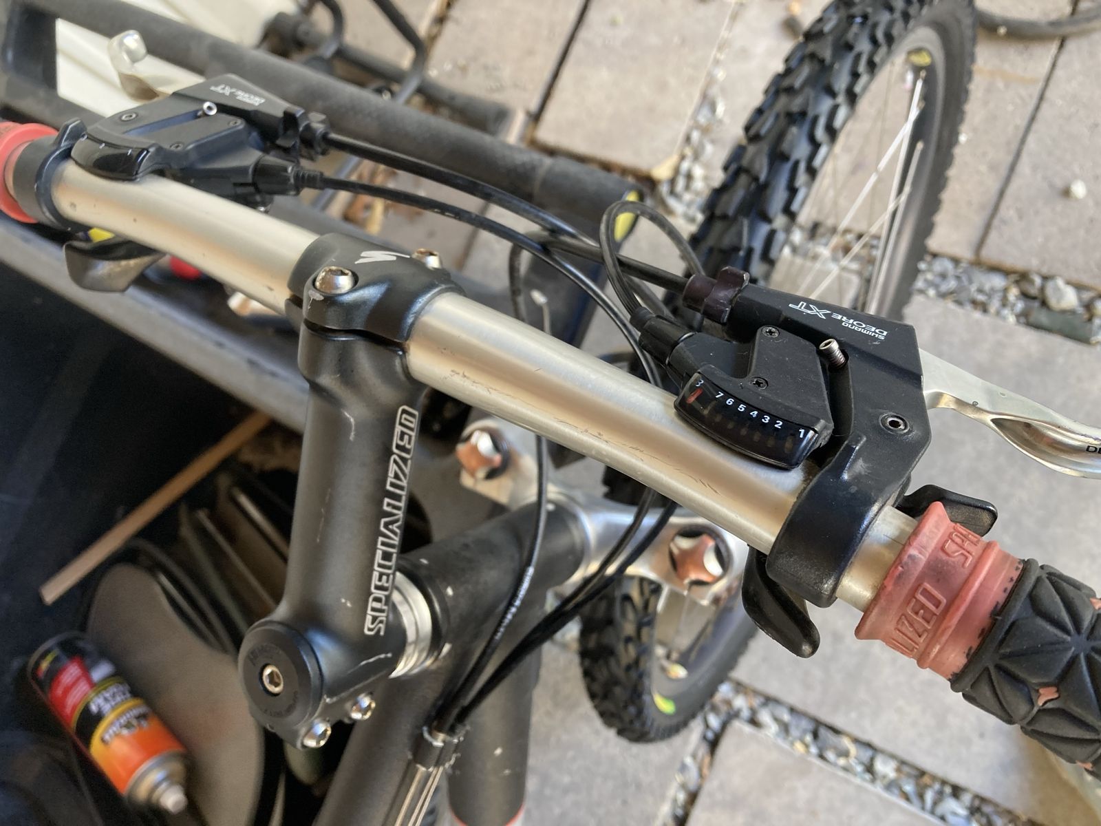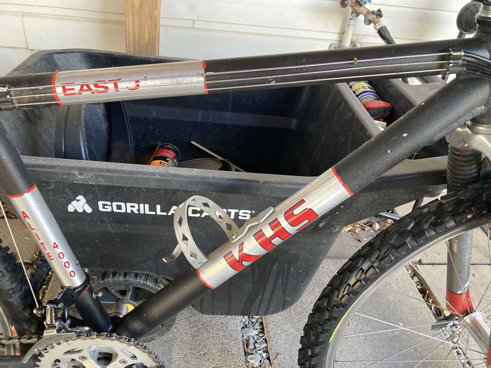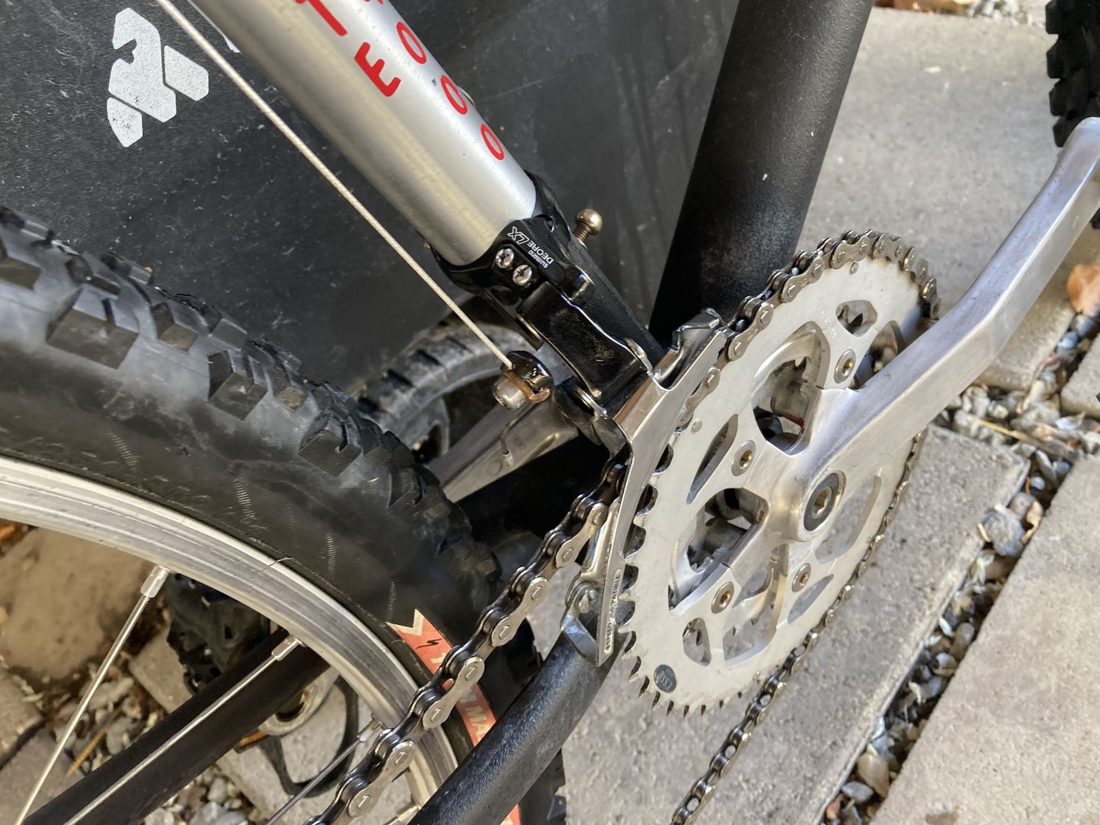 Is got a Shimano deore xt group set works great it’s a 3x8 speed the brake calipers are nice ! You don’t see a lot of those anymore. Shows it’s cosmetics from use they do not affect the function the bike is clean and working Has like a sort of tough rhino lining black/gray style of pant to protect the frame