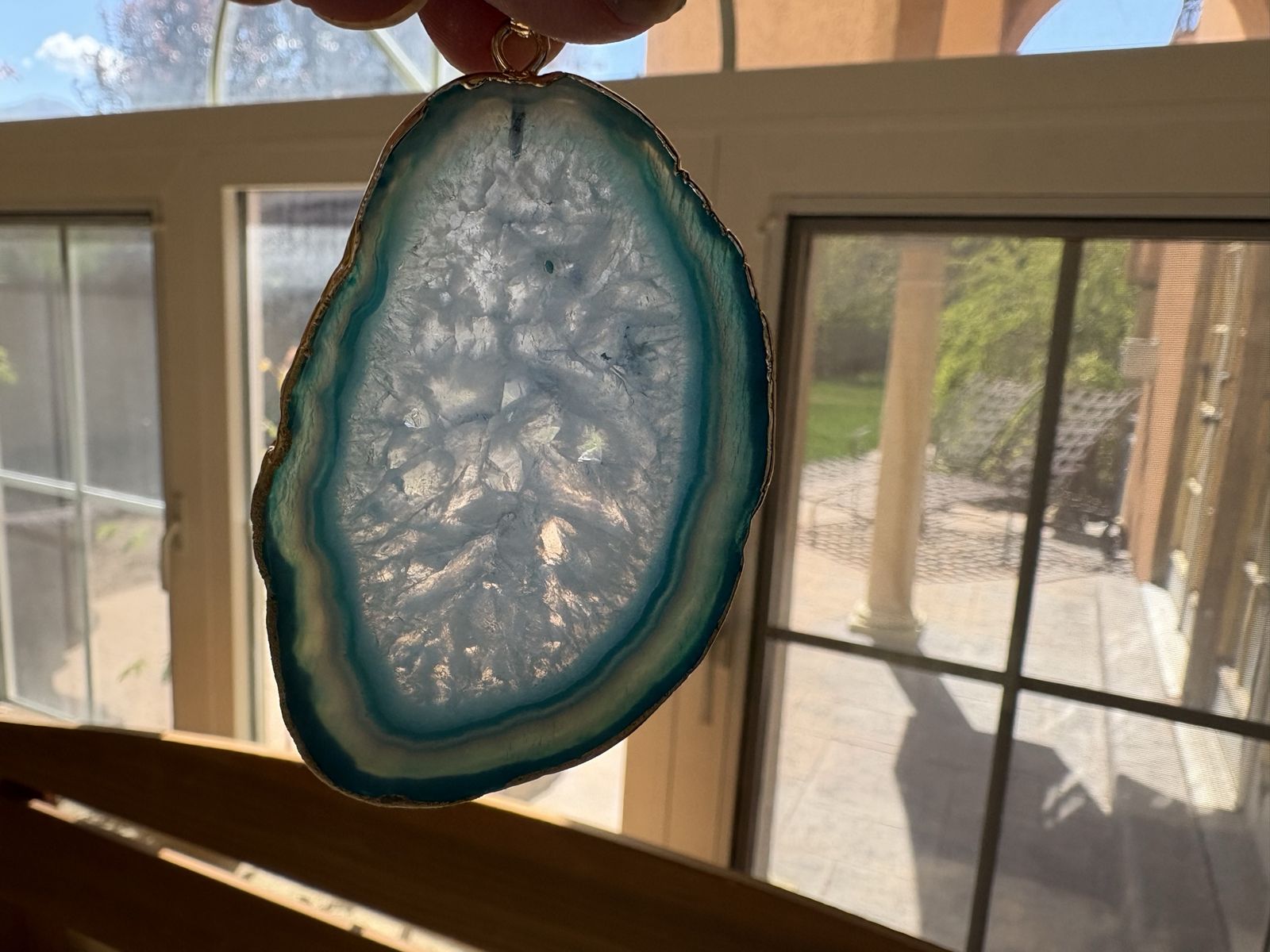 I have a really large blue slice of agate pendant with gold around the edge. The last picture shows all of the colors I have. They are 3 to 3 1/2 inches tall. I don’t know what the metal actually is. A magnet doesn’t stick to it. See my other ads for jewelry, artwork, home decor and more.