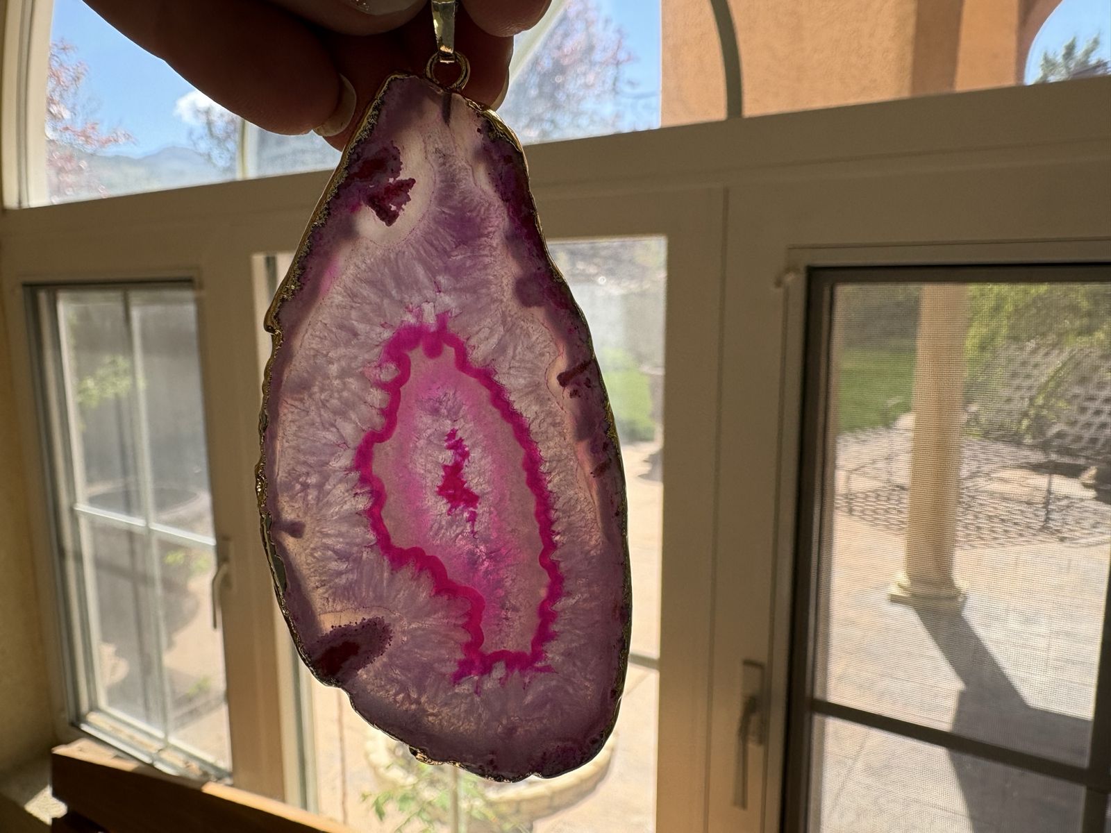 I have a really large pink slice of agate pendant with gold around the edge. The last picture shows all of the colors I have. They are 3 to 3 1/2 inches tall. I don’t know what the metal actually is. A magnet doesn’t stick to it. See my other ads for jewelry, artwork, home decor and more.