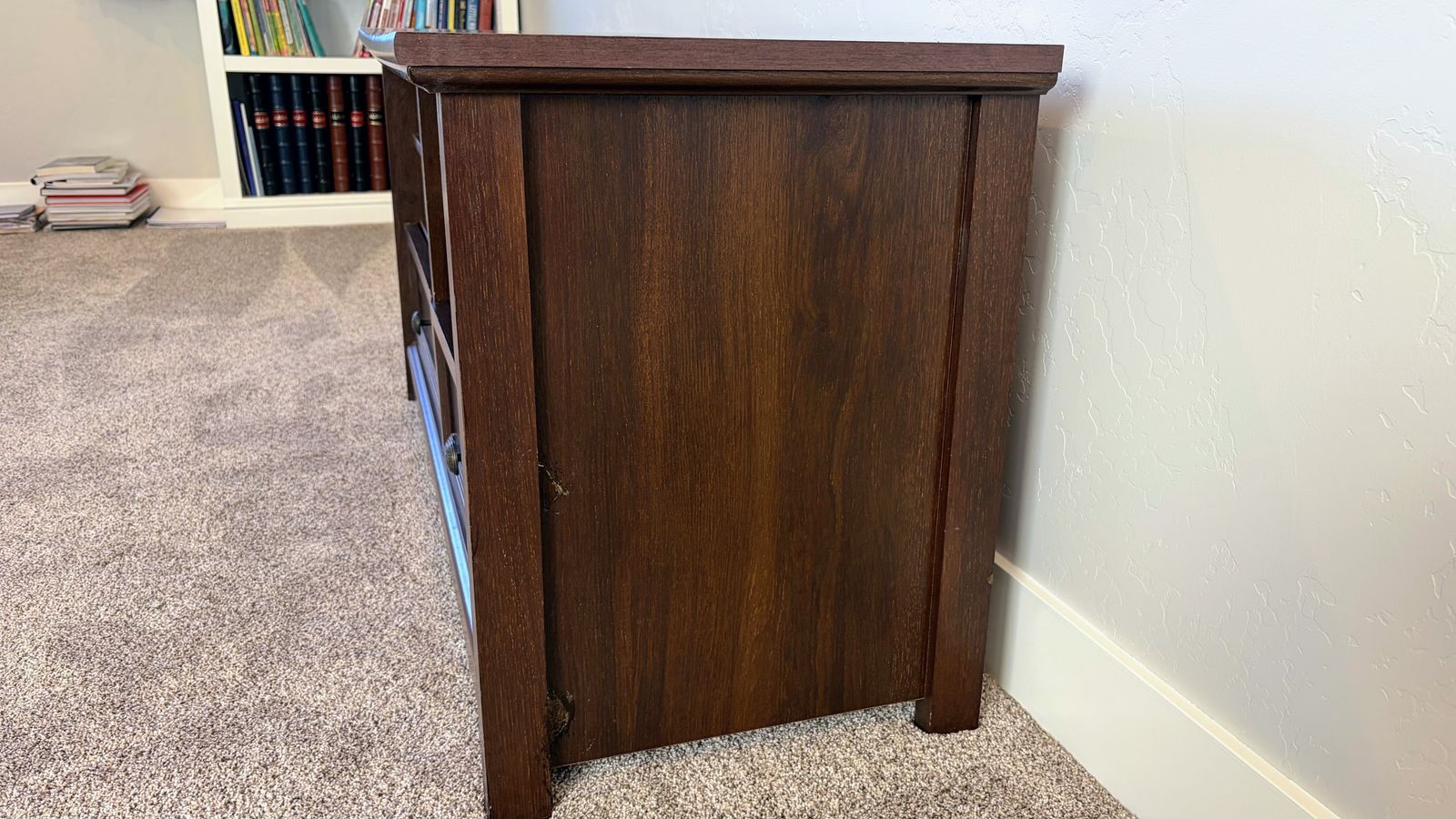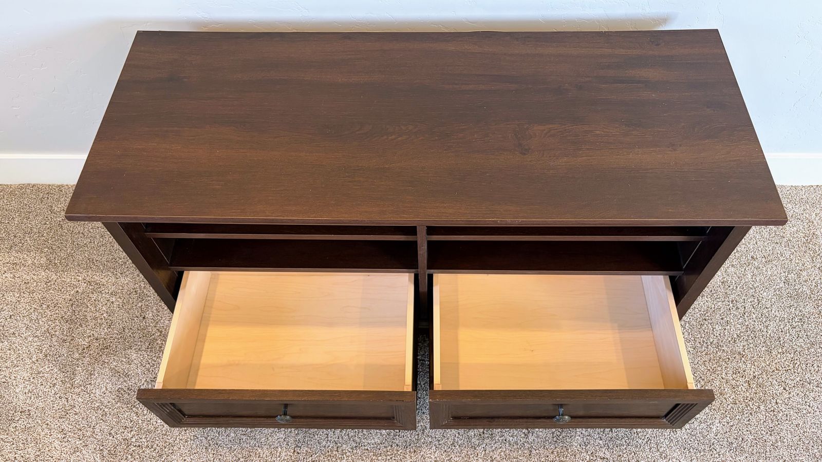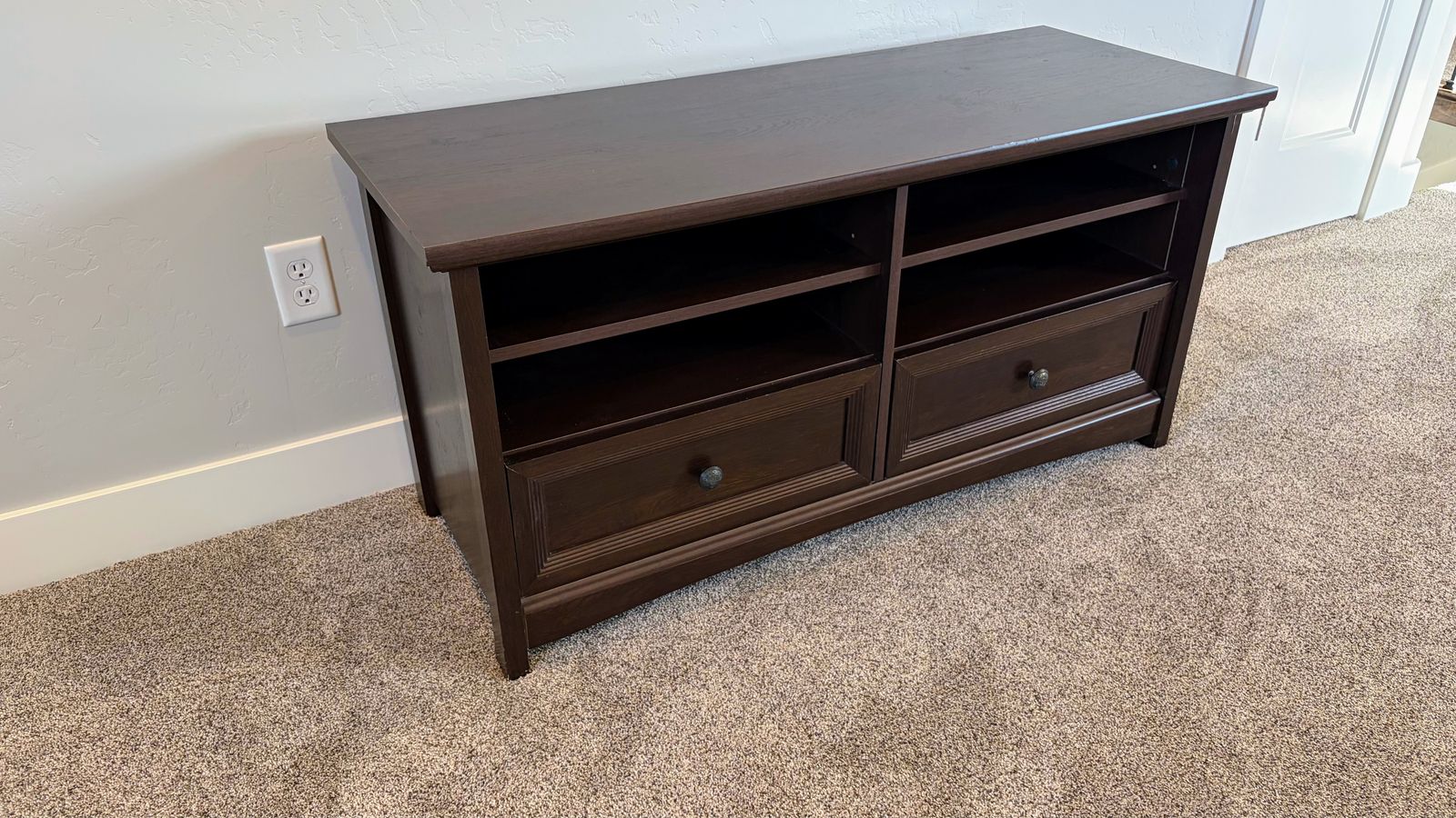 Venmo46" entertainment center with two drawers and two shelves. Full dimensions: 46" wide X 18" deep X 23" tall.