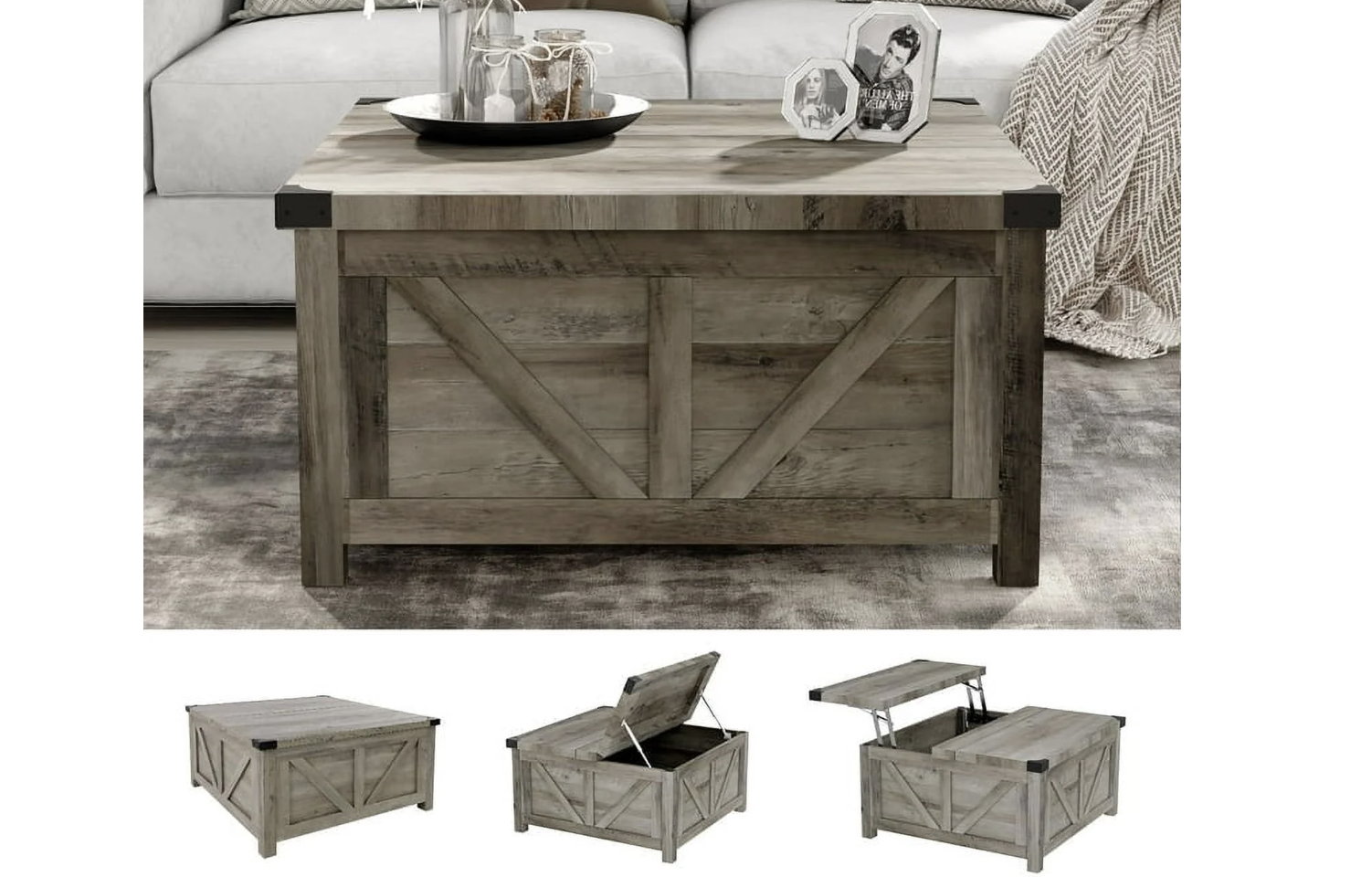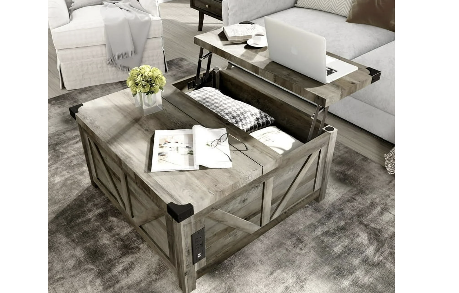 Farmhouse Design: Our white square farmhouse coffee table features a classic farm barn shape with metal corner decor, complementing modern, rustic, industrial, or vintage decor. Sturdy Construction: Made of high-density engineered wood and tough pinewood legs, this coffee table has a 1.2" thickened tabletop and a 3" reinforced solid base, supporting up to 110 lbs. Lift-Top Mechanism: The table includes a high-quality lifting mechanism with gas struts, allowing the top to be lifted to a height of 60cm for convenient office work. Hidden Storage: Features large hidden storage space under the top, ideal for storing pillows, magazines, notebooks, game consoles, toys, and remote controls. Charging Ports: Equipped with 2 USB ports and 2 output ports on the side for phone charging or using a notebook. Easy Assembly: Comes with all necessary hardware and a clear instruction manual for easy assembly. Specifications: Material: MDF Board + Particle Board; Color: Grey Wash/White; Size: 35.6" L x 35.6"W x 18.5"H; Max Load Capacity: 140 LBS; Weight: 92 pounds;