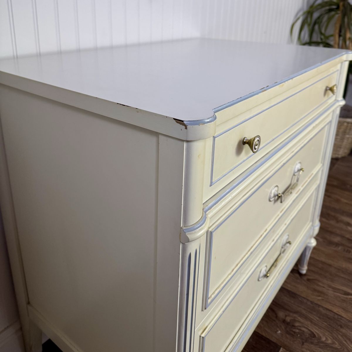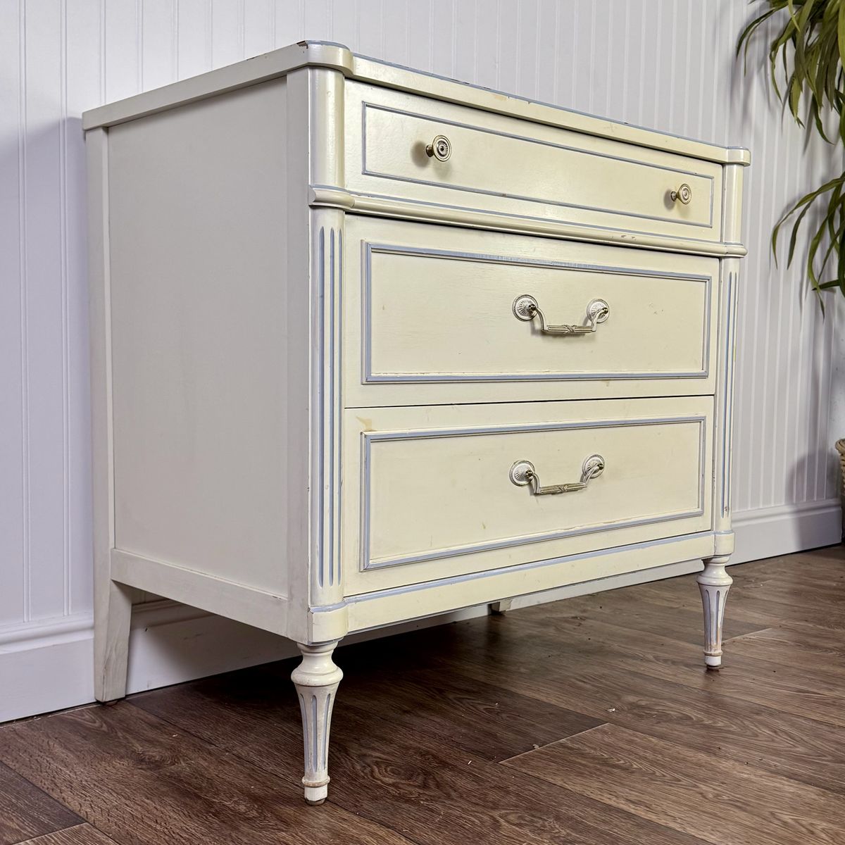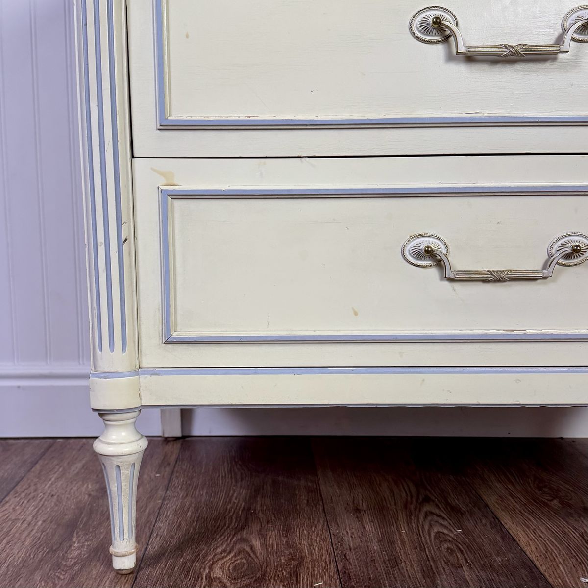 VenmoVintage Thomasville nightstand / chest of drawers from the 1960s featuring a classic French Provincial style with fluted details, a soft cream painted finish with light blue trim accents, and original brass hardware. Includes three dovetailed drawers that slide smoothly.