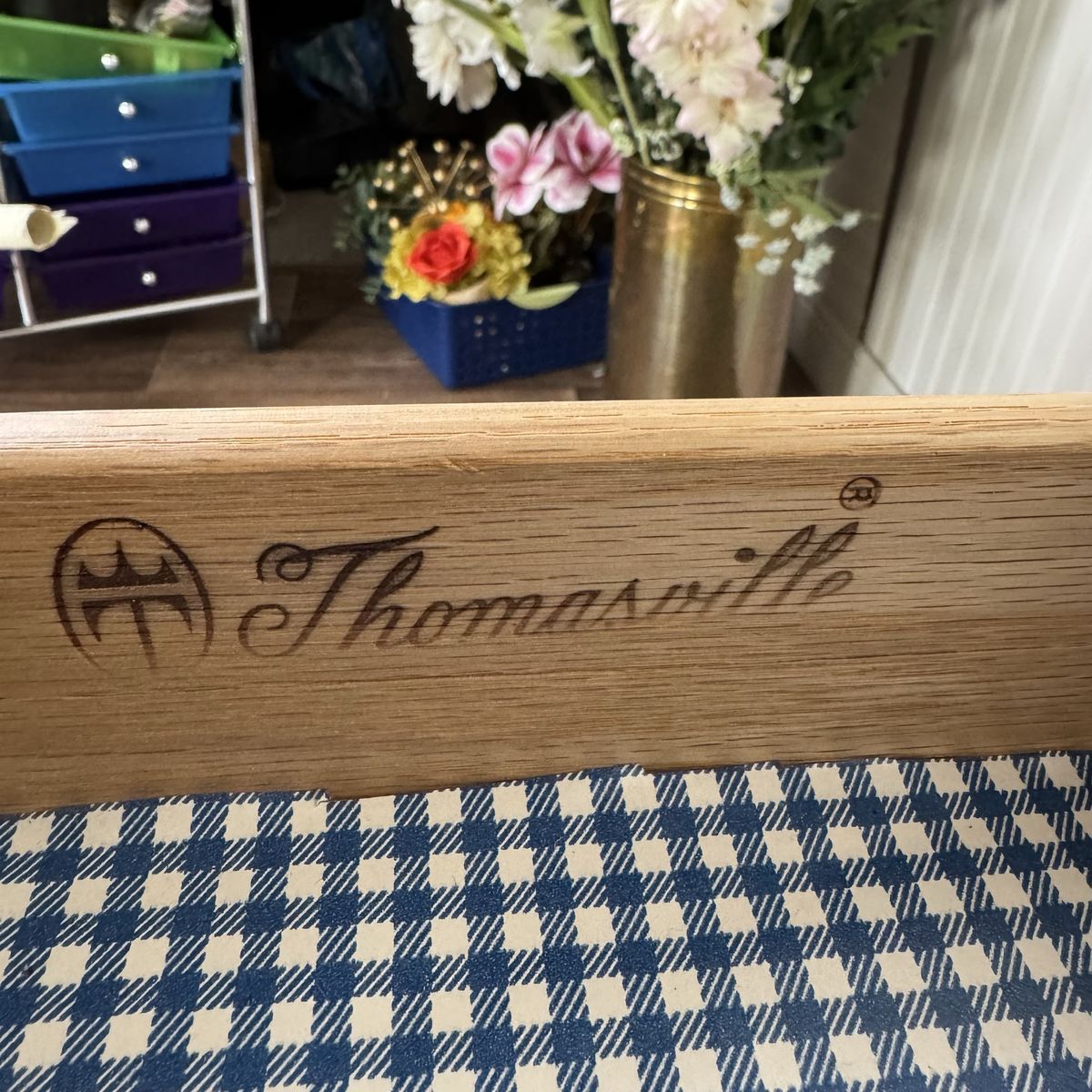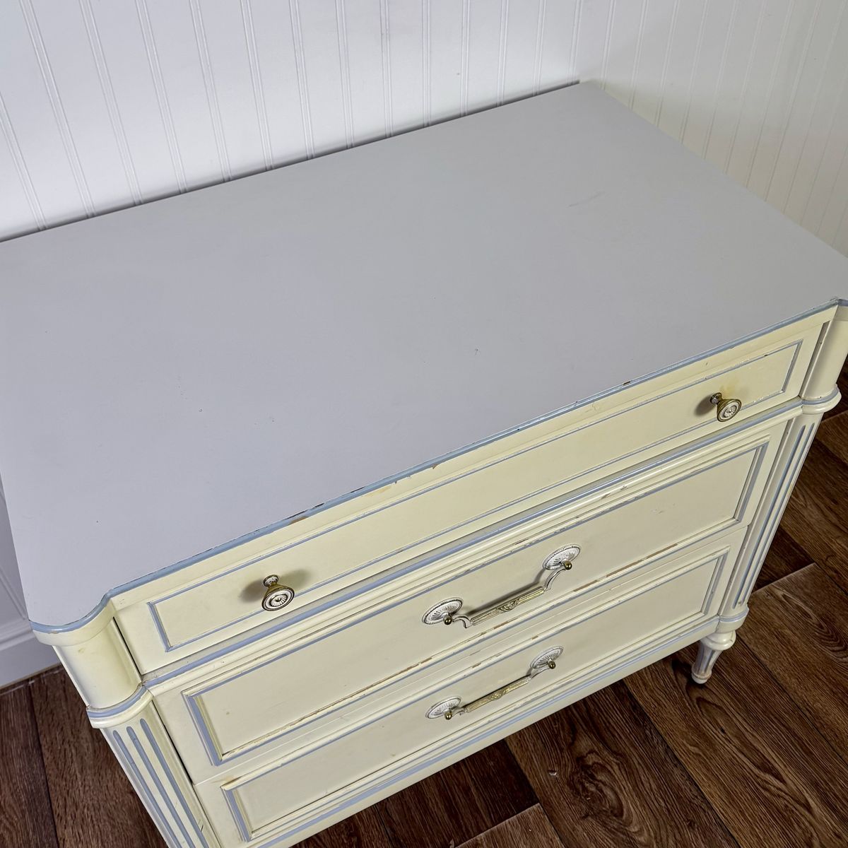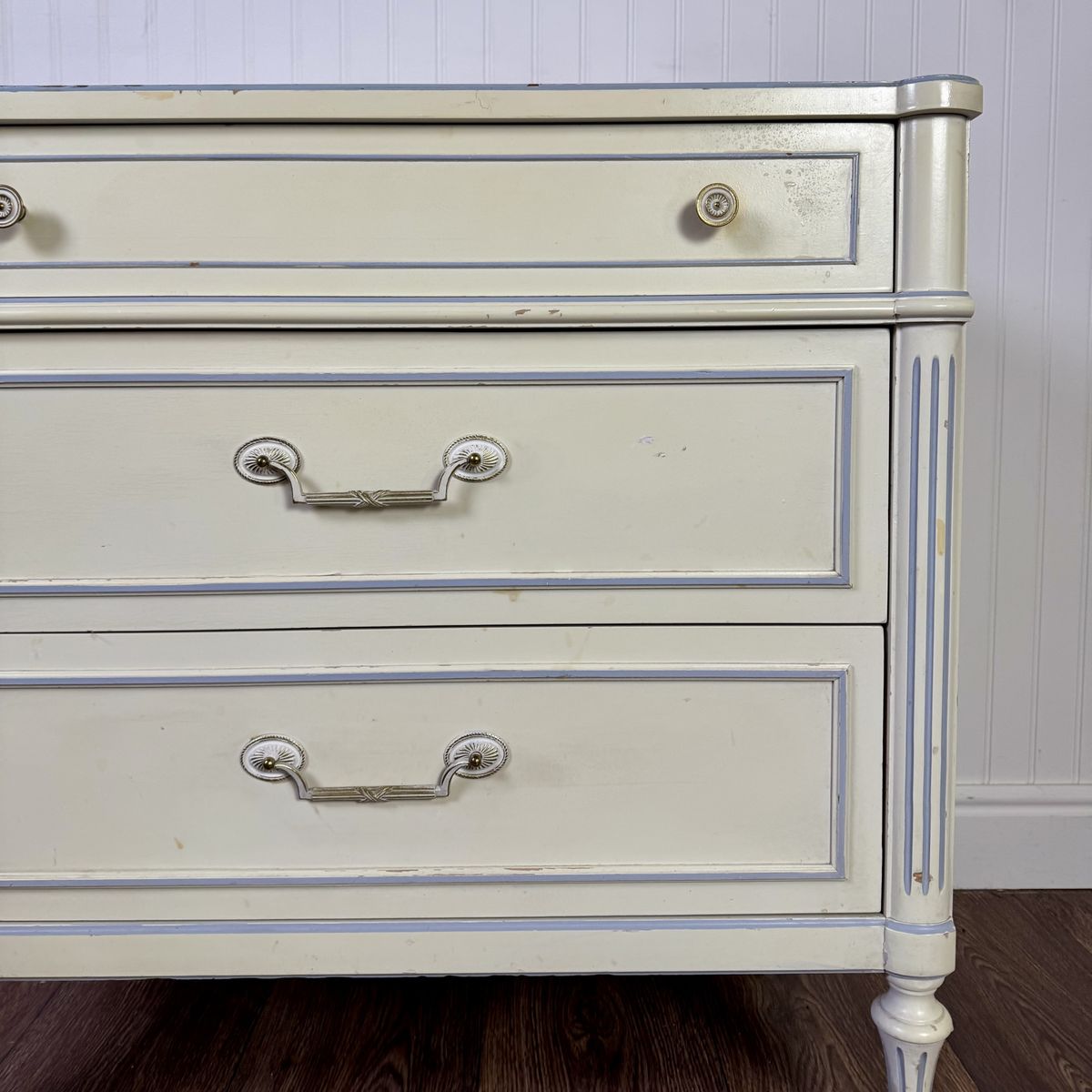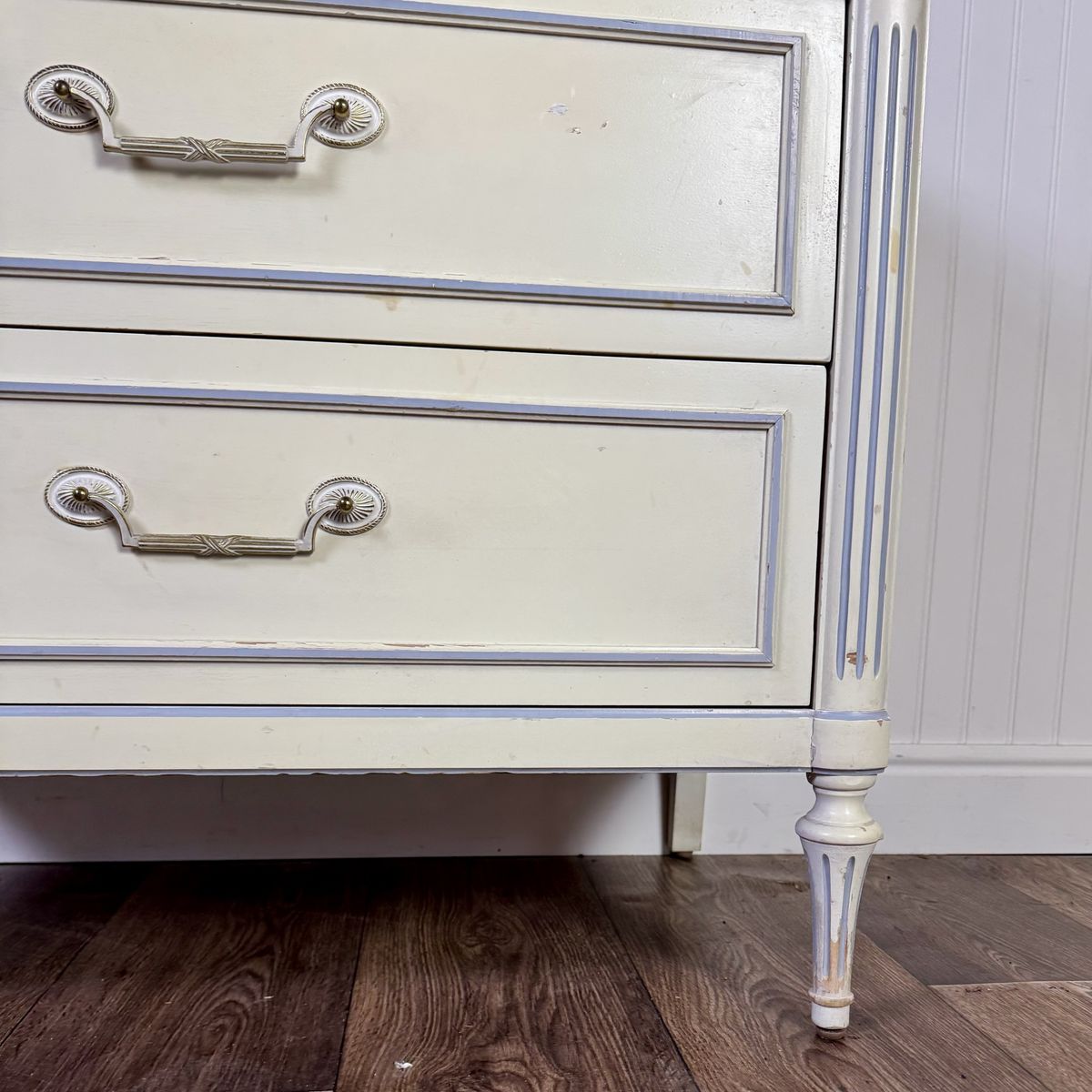 VenmoVintage Thomasville nightstand / chest of drawers from the 1960s featuring a classic French Provincial style with fluted details, a soft cream painted finish with light blue trim accents, and original brass hardware. Includes three dovetailed drawers that slide smoothly.