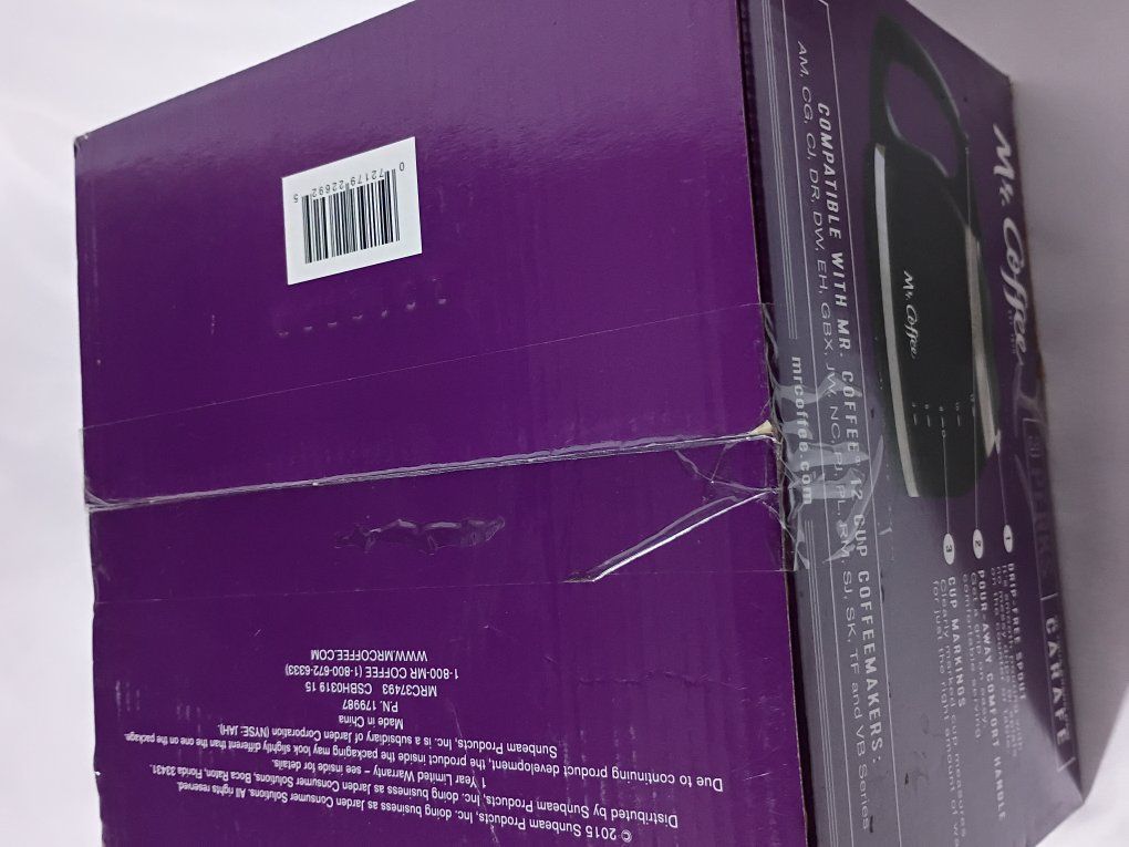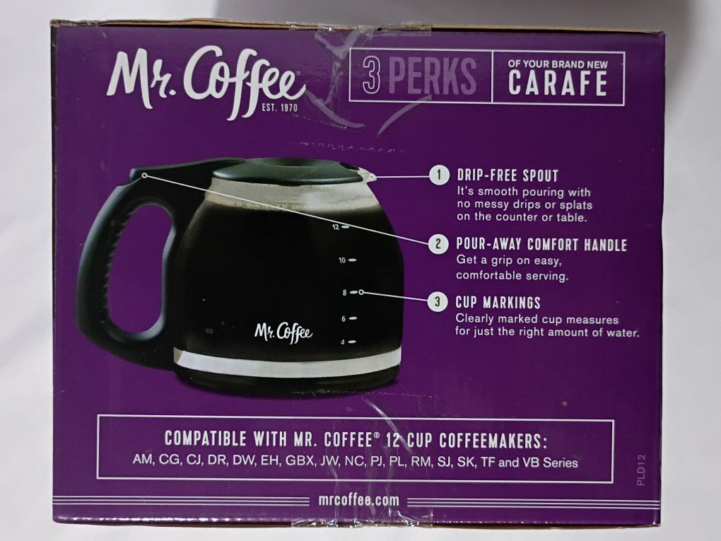 Brand new Mr. Coffee 12-cup replacement carafe. Never used, still in original box.