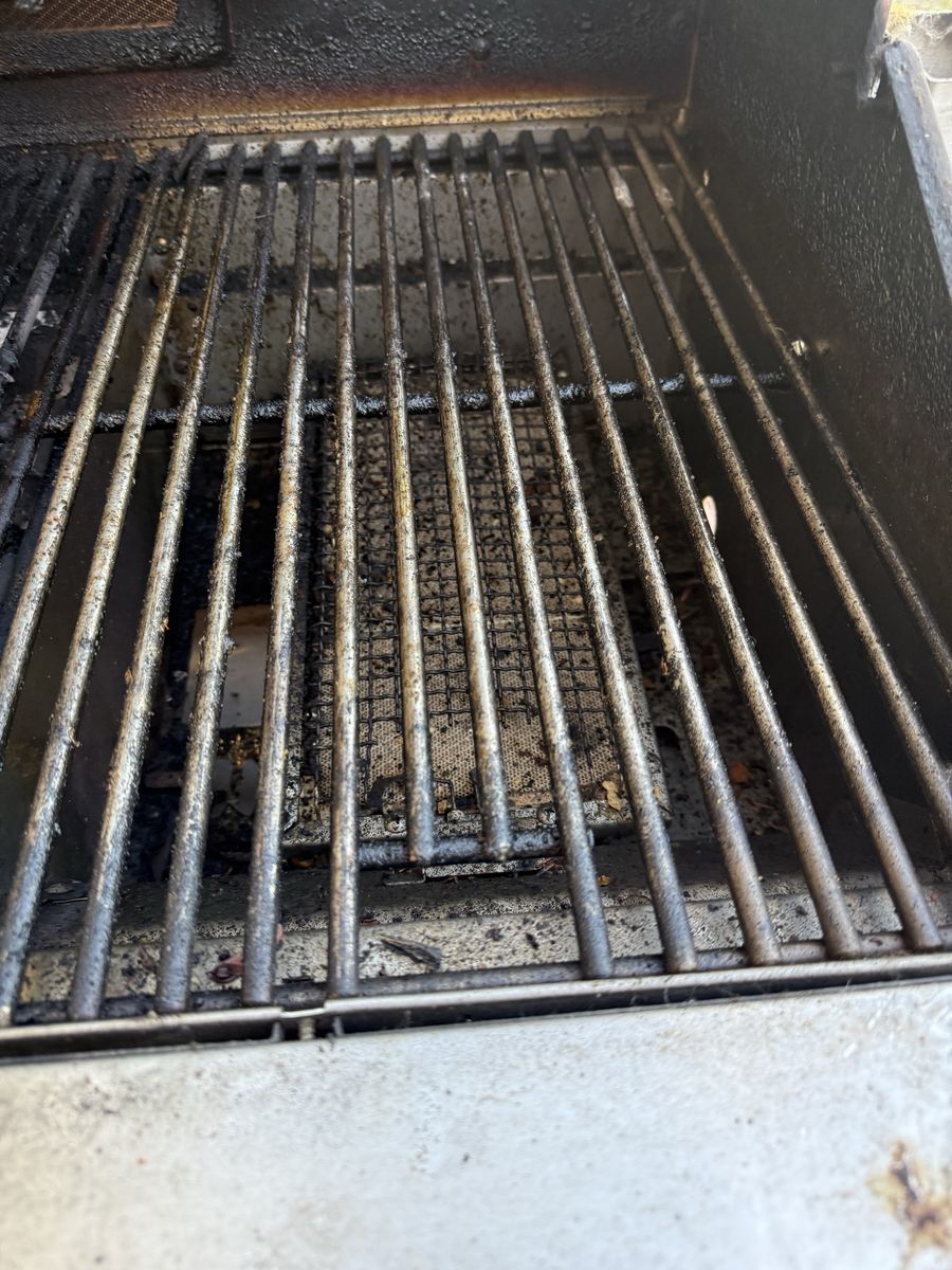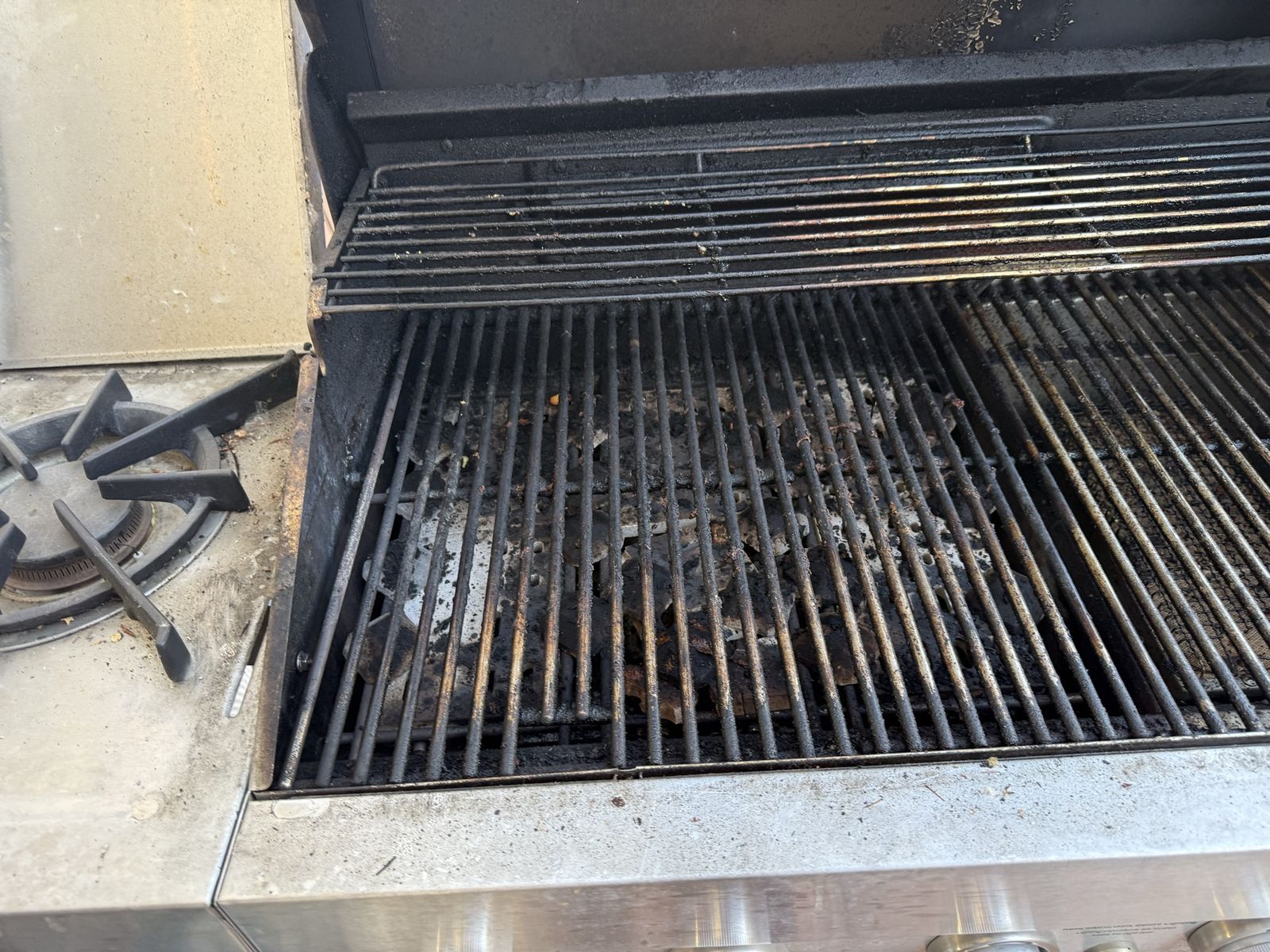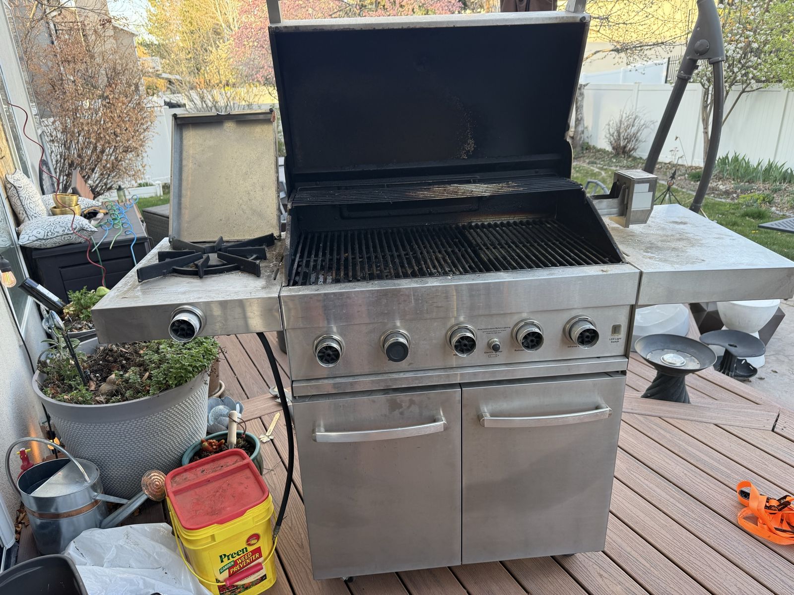 Stainless Steel. Propane. Used, originally from Costco. The main grill surface works fine. The side burner works, but hose leaks. The side infrared burner works, the rear rotisserie burner does work, and the rotisserie motor does work. Has a cover, small tears in it.