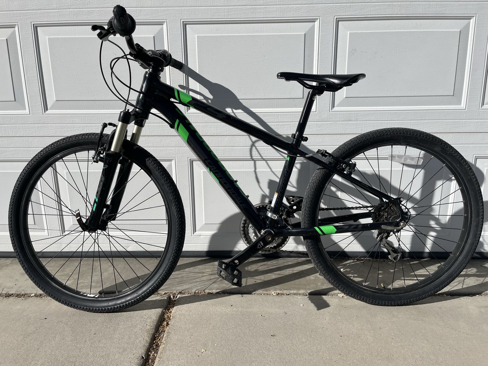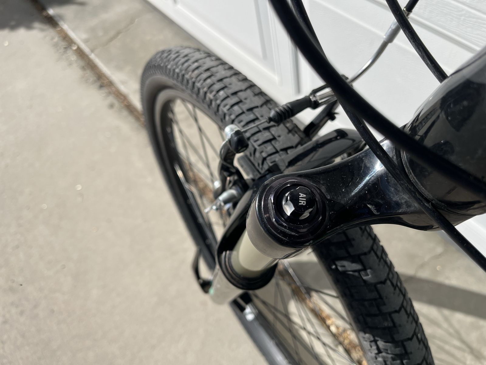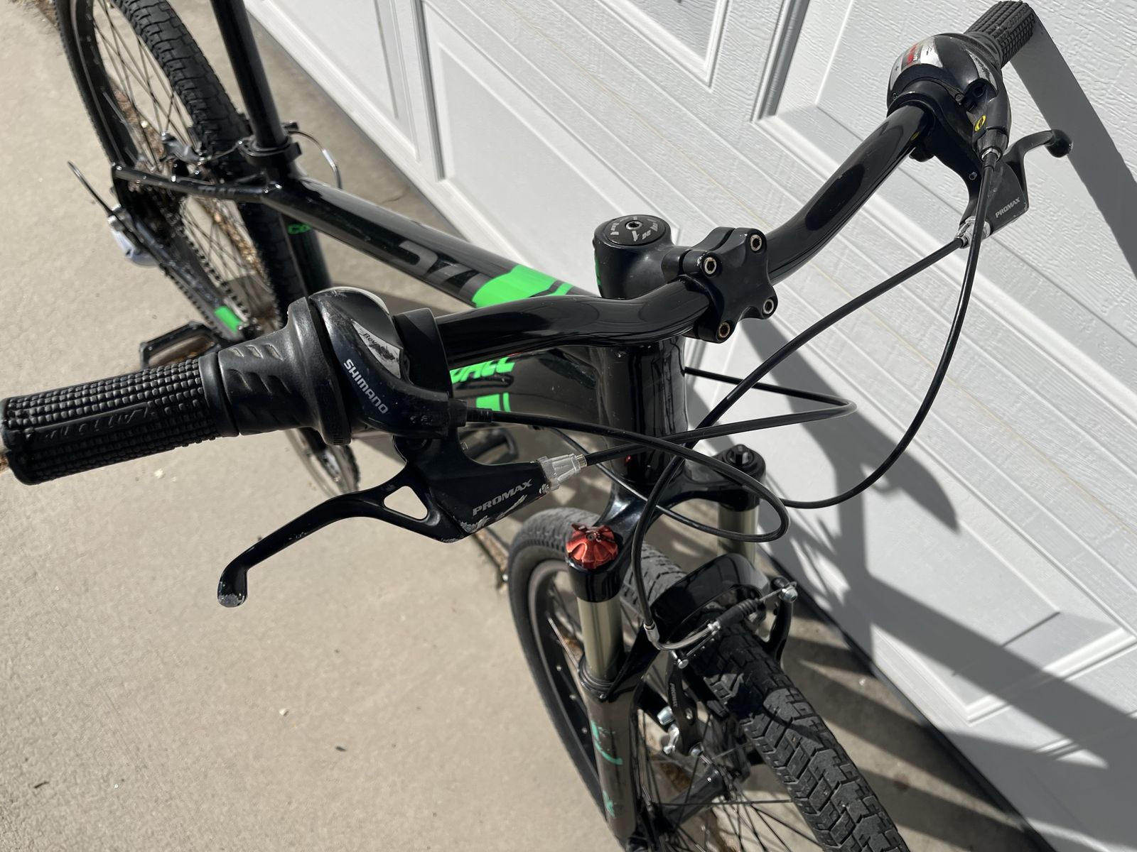 This has 21 speeds (3x7), 24 inch wheels, RST 60mm adjustable air fork with lockout, quick release skewers front and rear, and Shimano components. Except for a few minor scratches it's in very good condition. The air fork is what sets this apart from other bikes by allowing the front suspension to be adjusted by weight and riding style. Standover is around 23 inches.