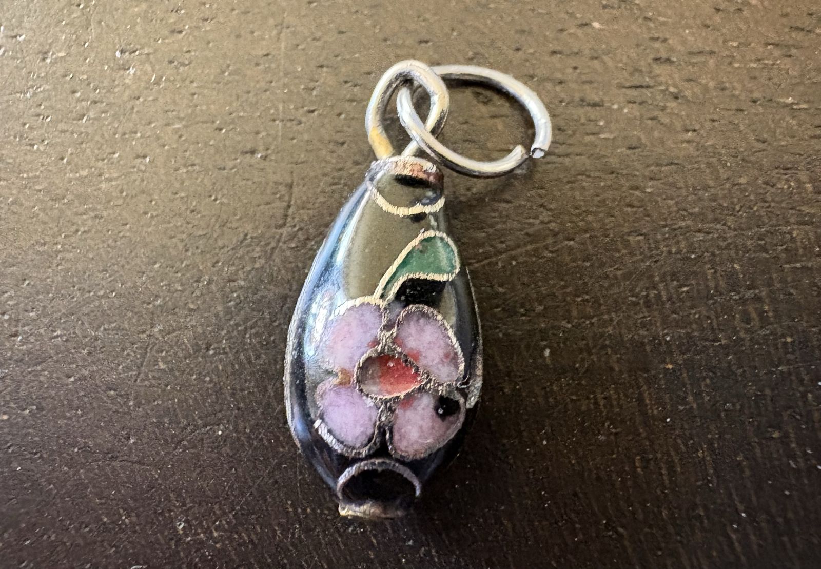 I have a small vintage cloisonné metal and enamel pendant. It is black with a pink flower on each side. It is 3/4 inches long. It used to be an earring but was turned into a pendant when the other one was lost. See my other ads for jewelry, artwork, home decor and more.