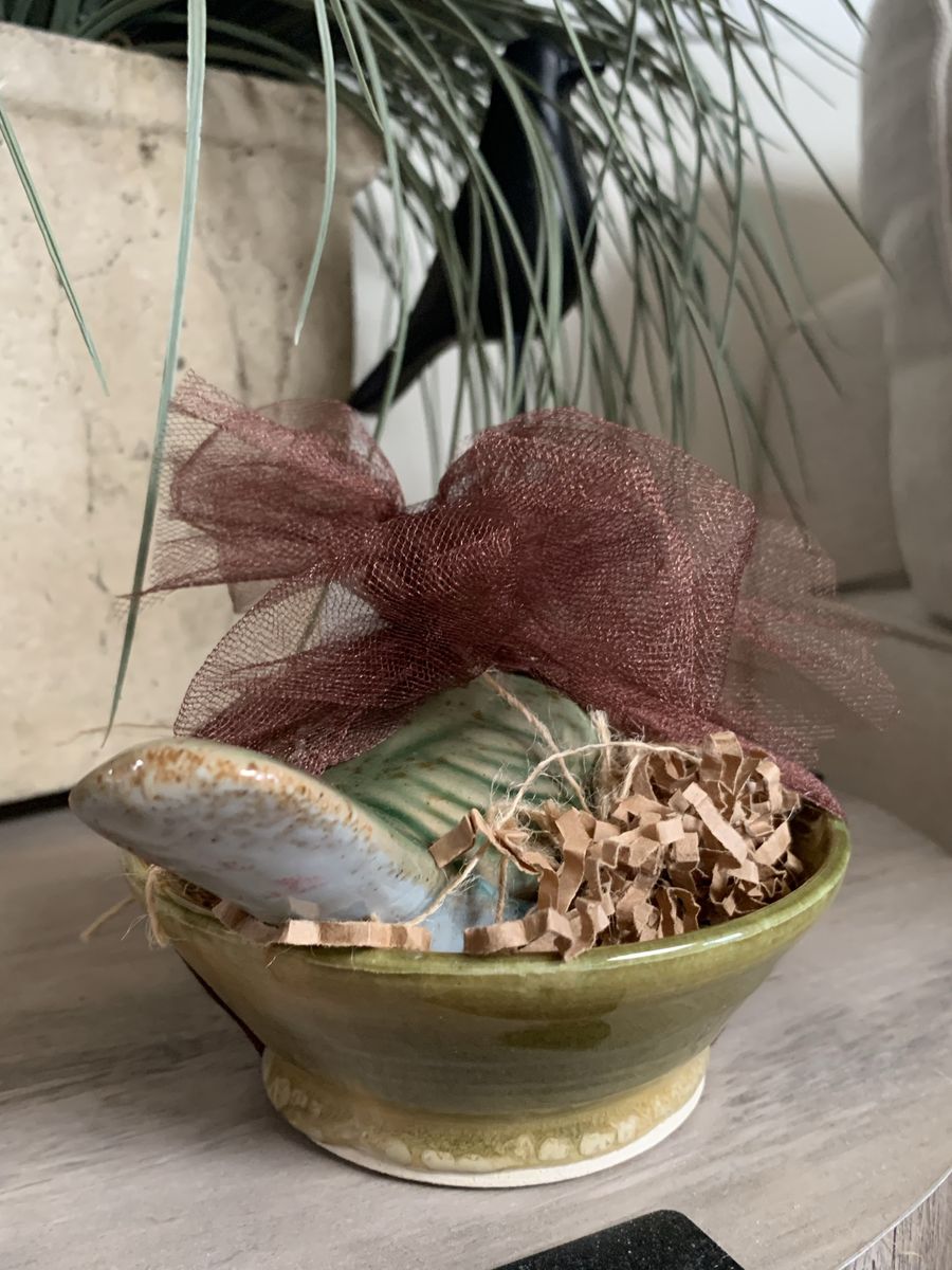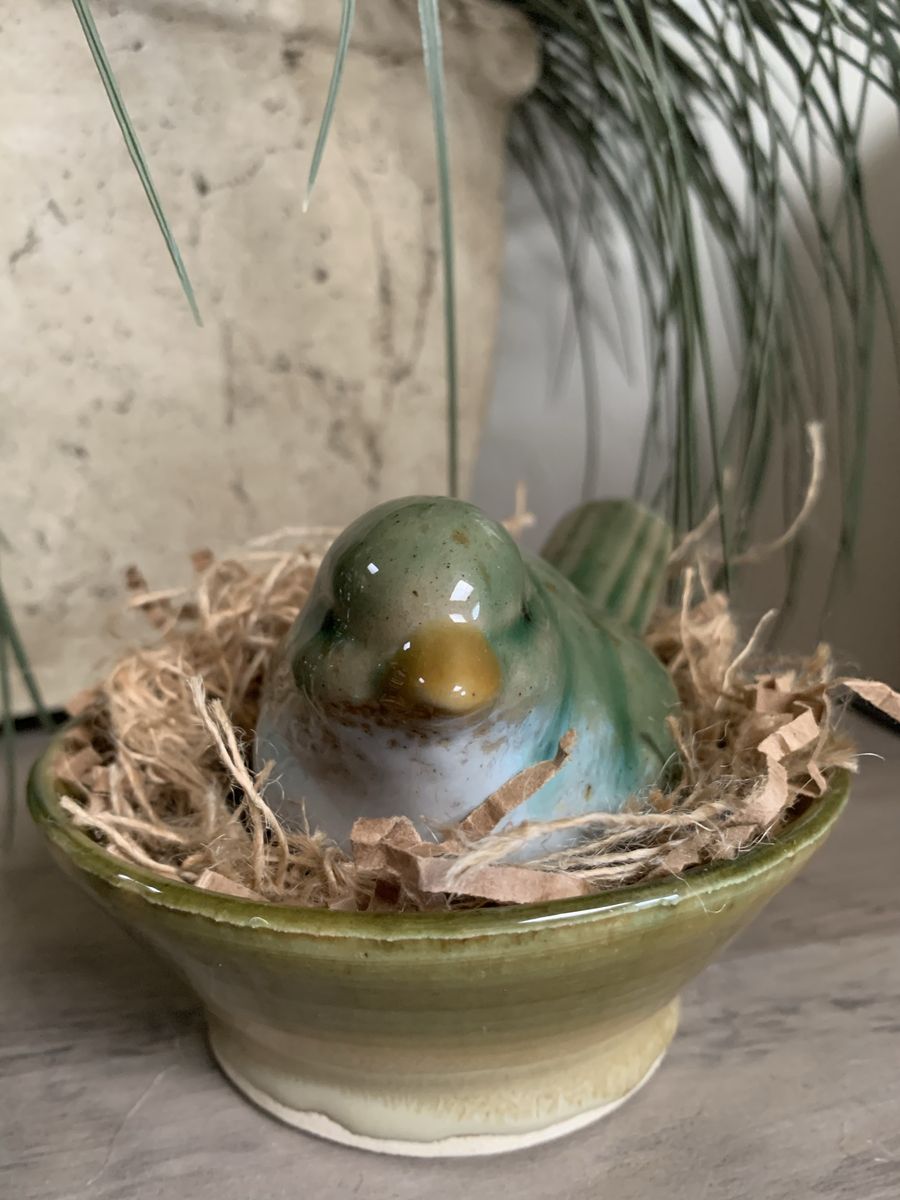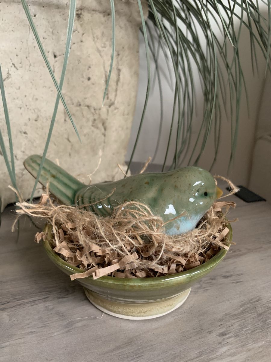 VenmoCeramic green and blue bird in a pretty ceramic bowl. Bird is 6”L x 3 1/4”W x3”H. 5 1/2” bowl. Clean. Hold with Venmo. Non-smoking/No pet home.