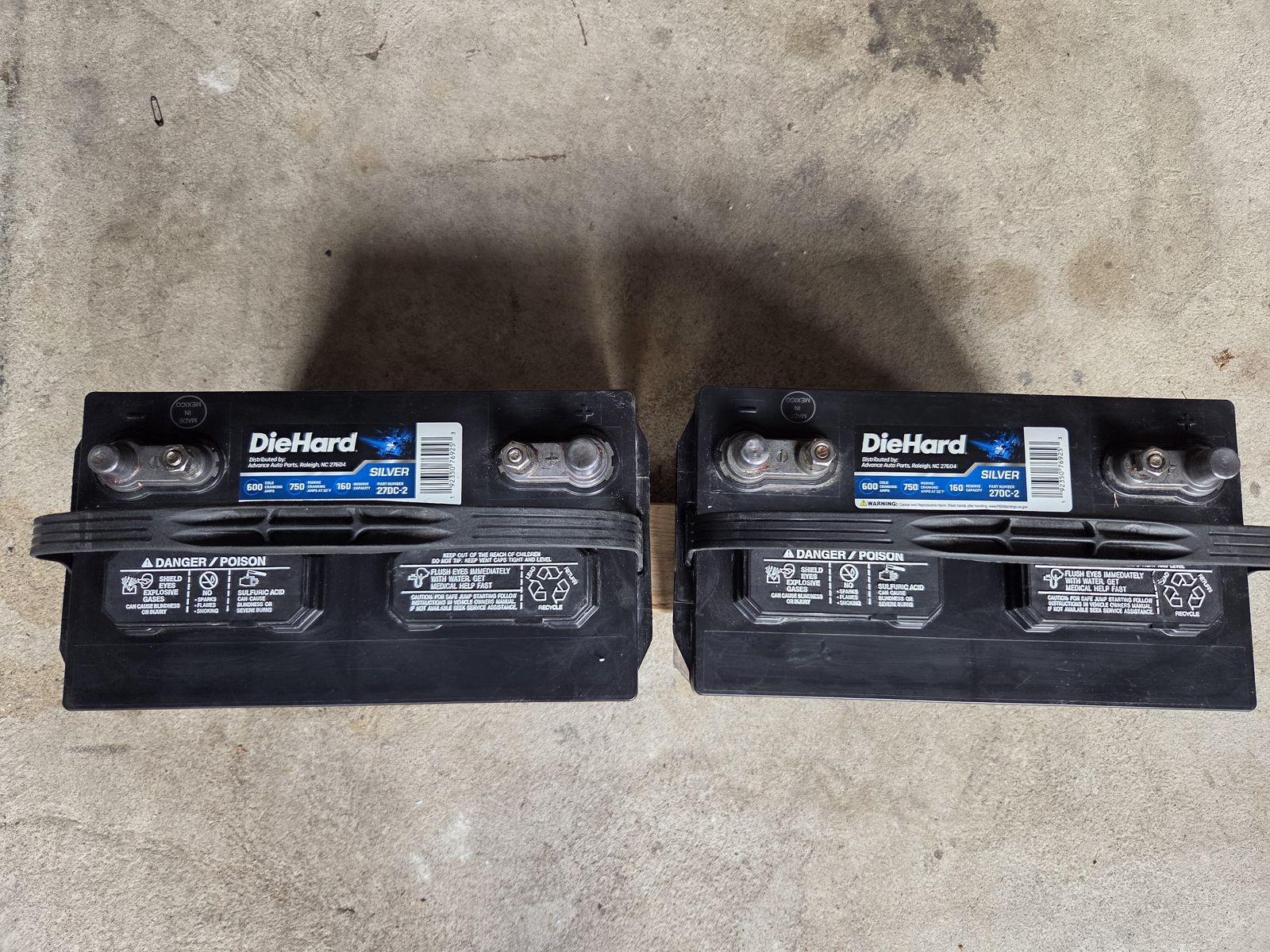 12v deep cycle 27 series die hard silver batteries, came with camper new when I bought it last year and we switched them out with lithium ones instead. Kept of the ground and indoors.