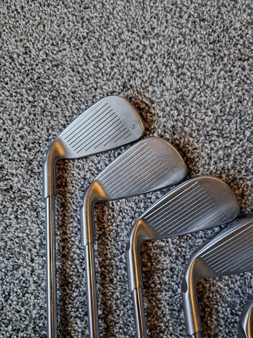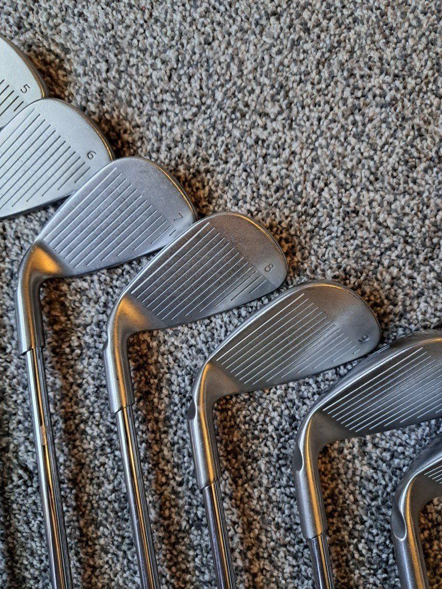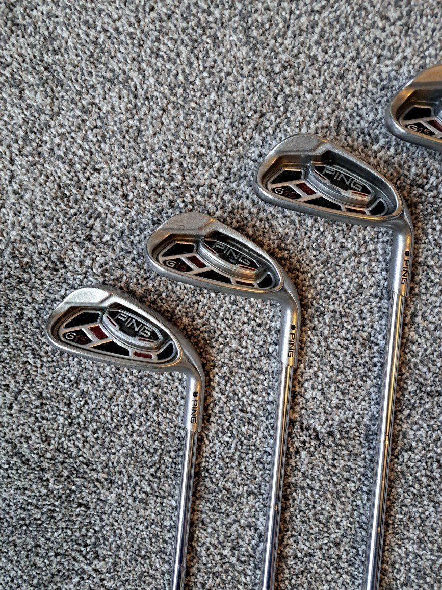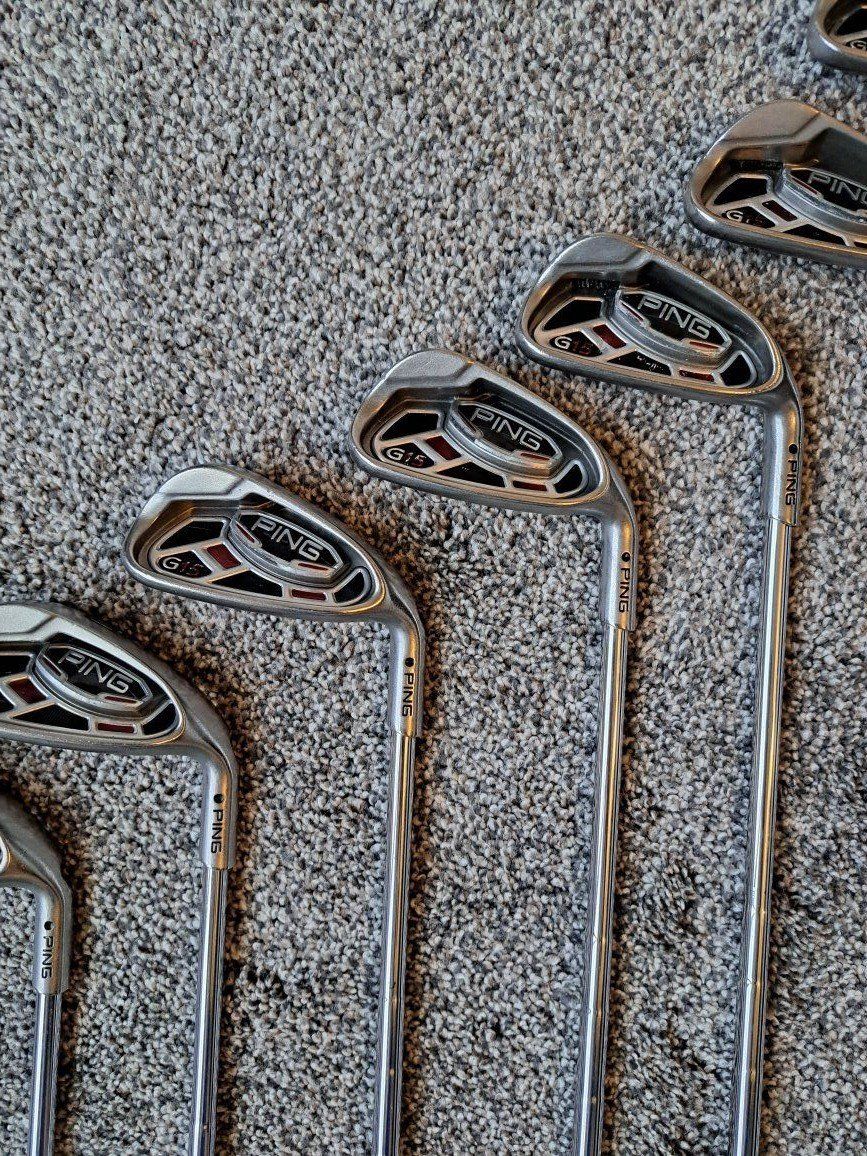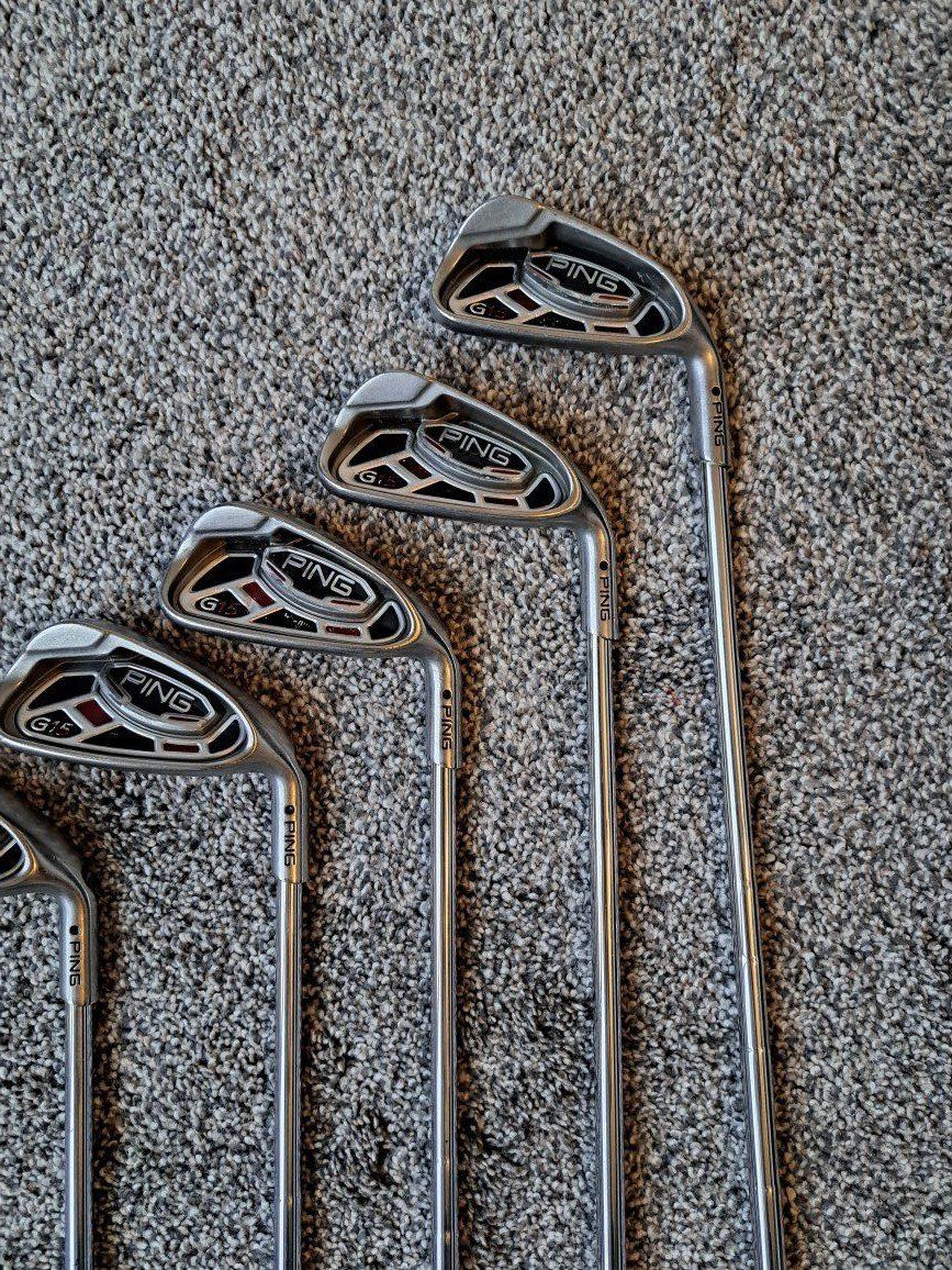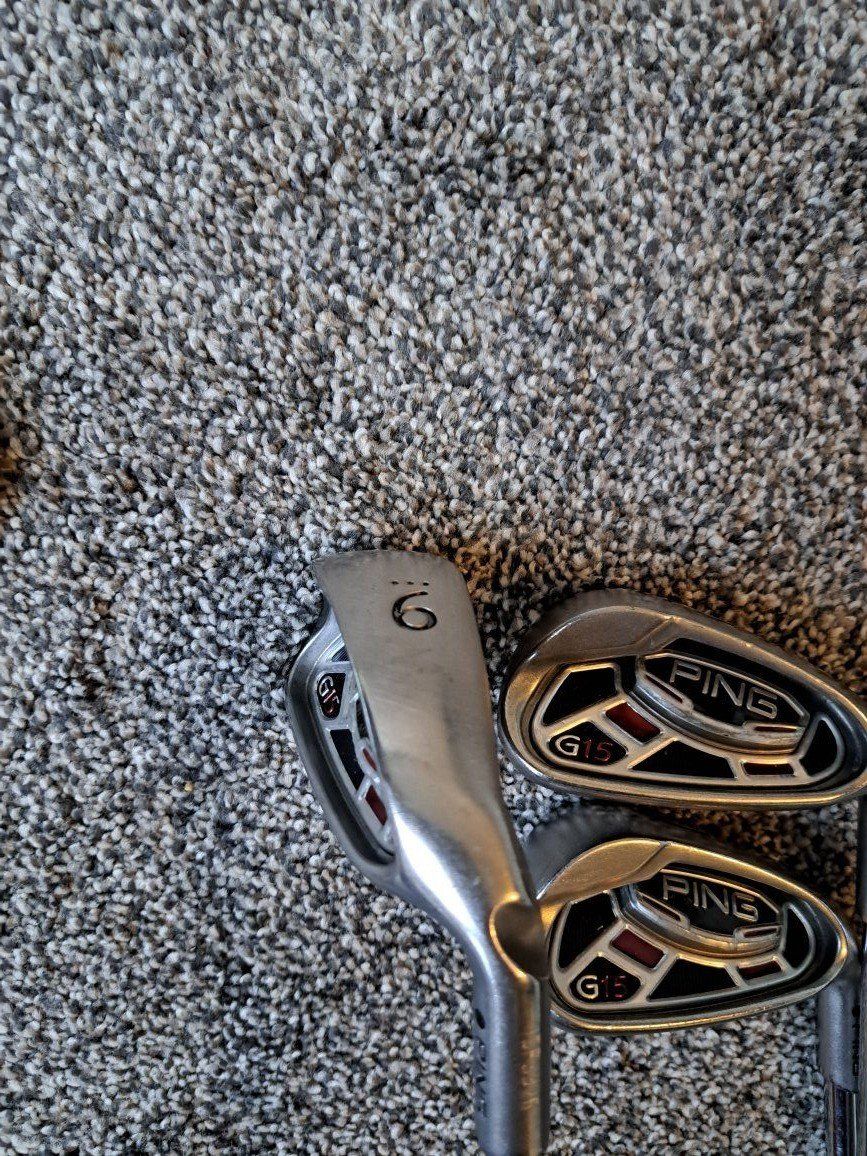 Ping G15 Irons 5-UW. Stiff flex steel shafts. Standard size grips. Black dot. Standard length and lie.