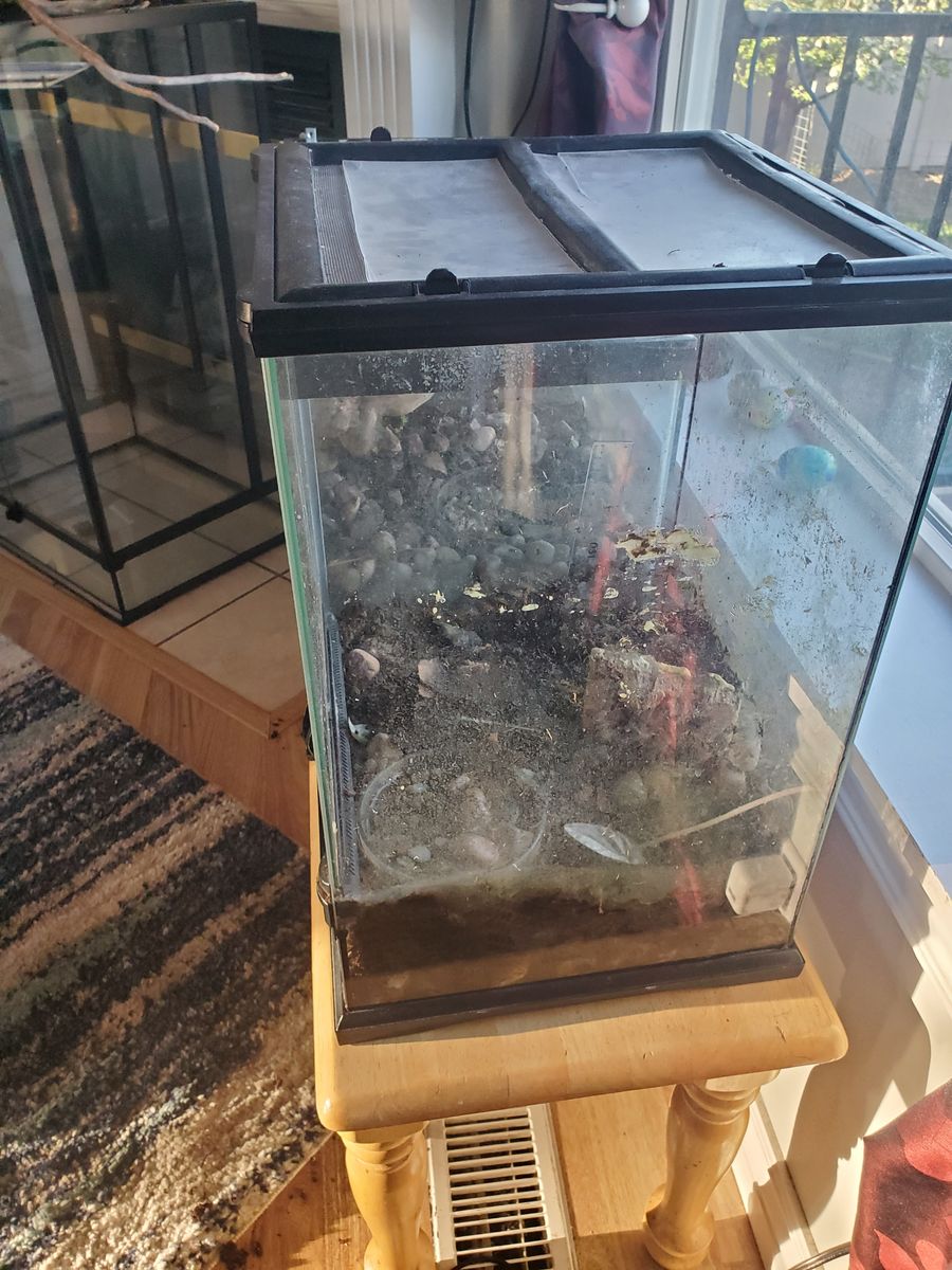 VenmoSmall 12"x12"x18 exoterra tank. This tank is watertight and comes with homemade plastic slats for the top to keep the humidity high. Has been housing a dart frog but decided to update him to a larger tank. Has rocks and soil in it but I can remove it.