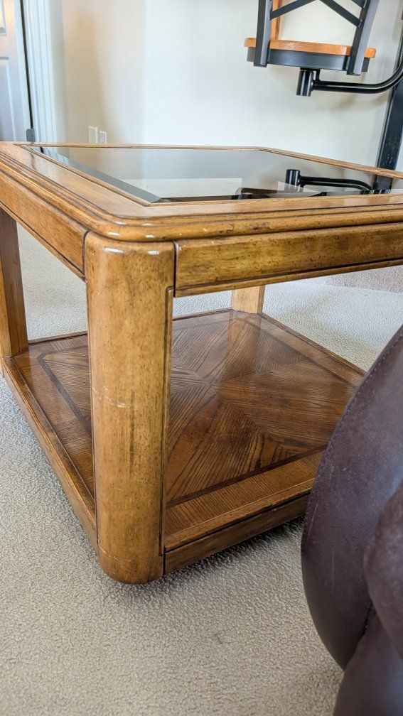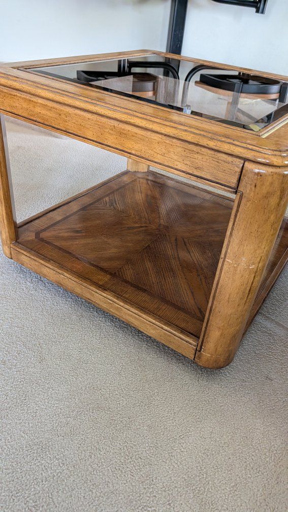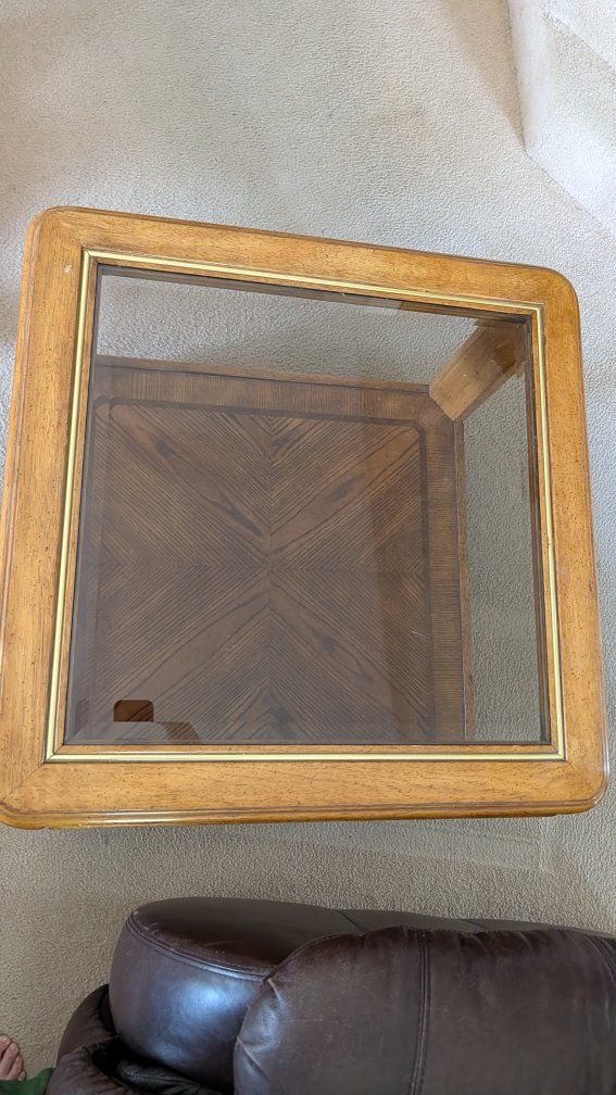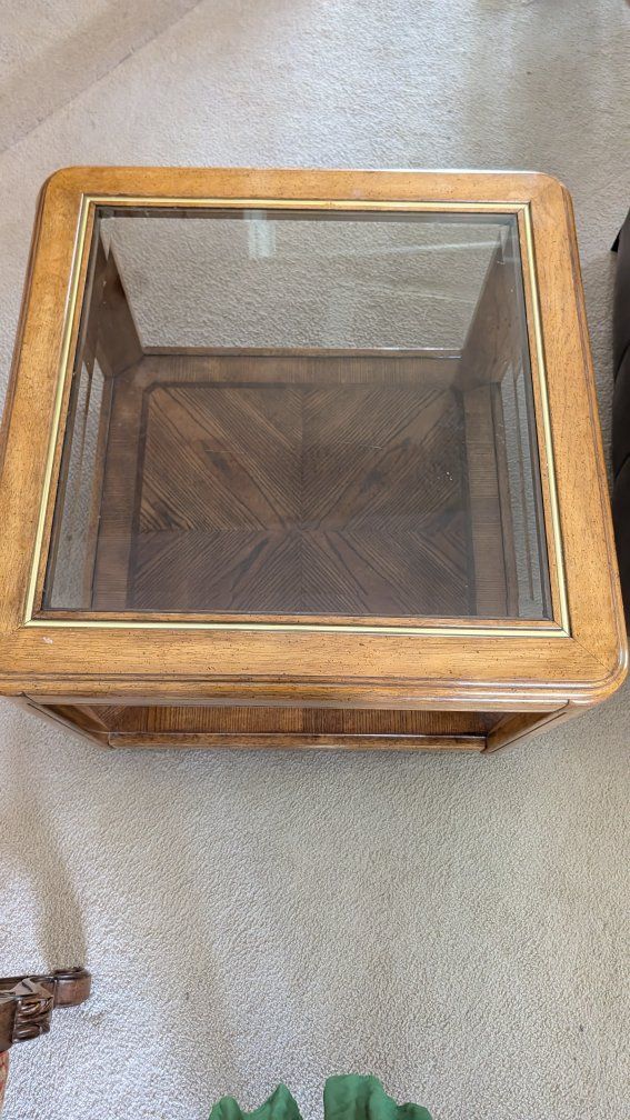 VenmoSolid wood side table with removable glass top. 1'9" tall x 2'4" wide and deep.