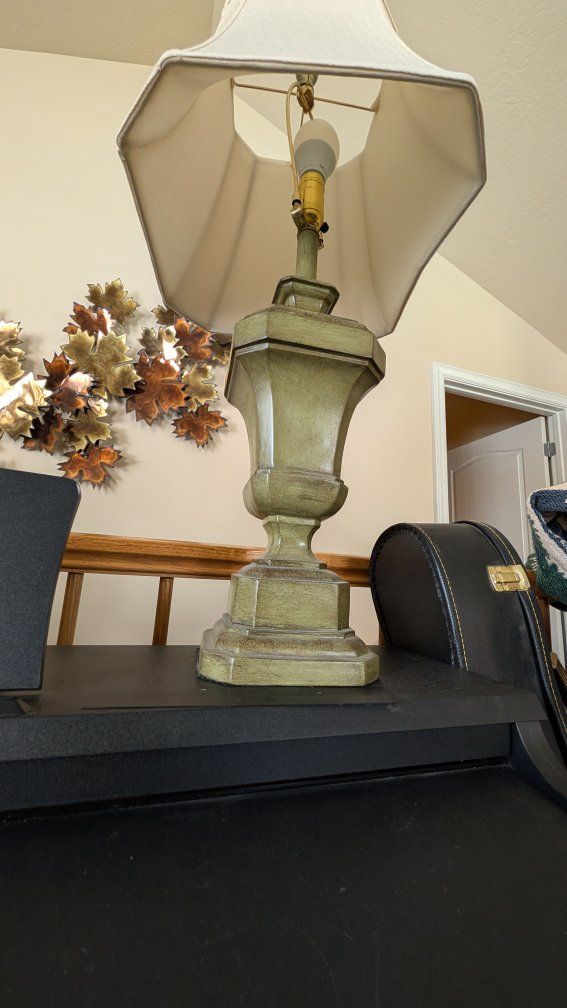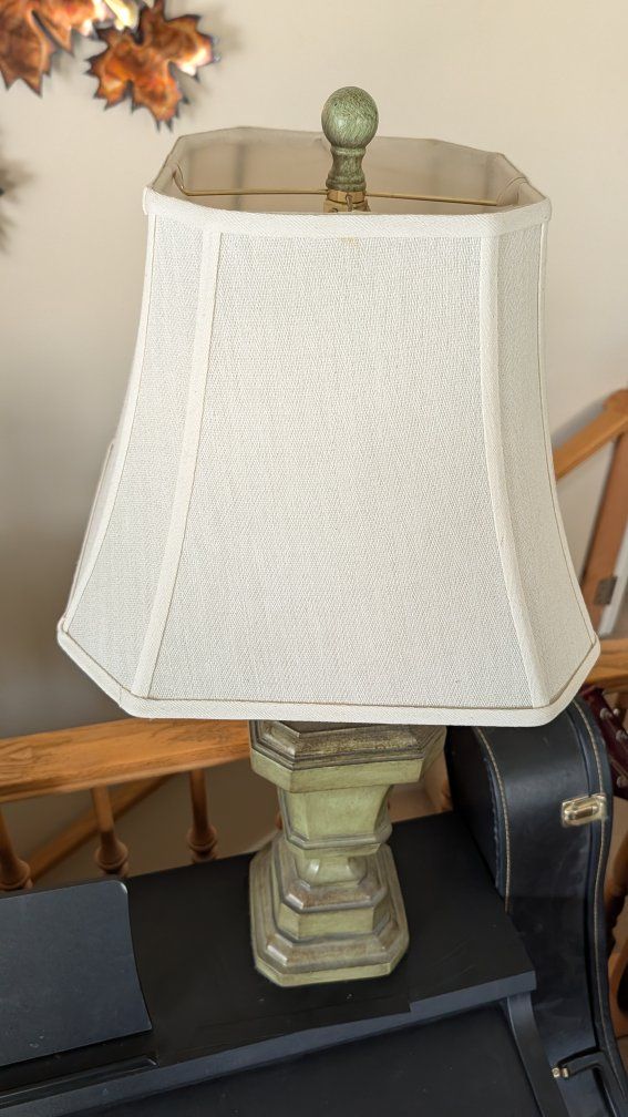 VenmoGreen side table lamp 6.5" squared base, 2'6" tall. Lamp shade is 1'2" deep and wide.
