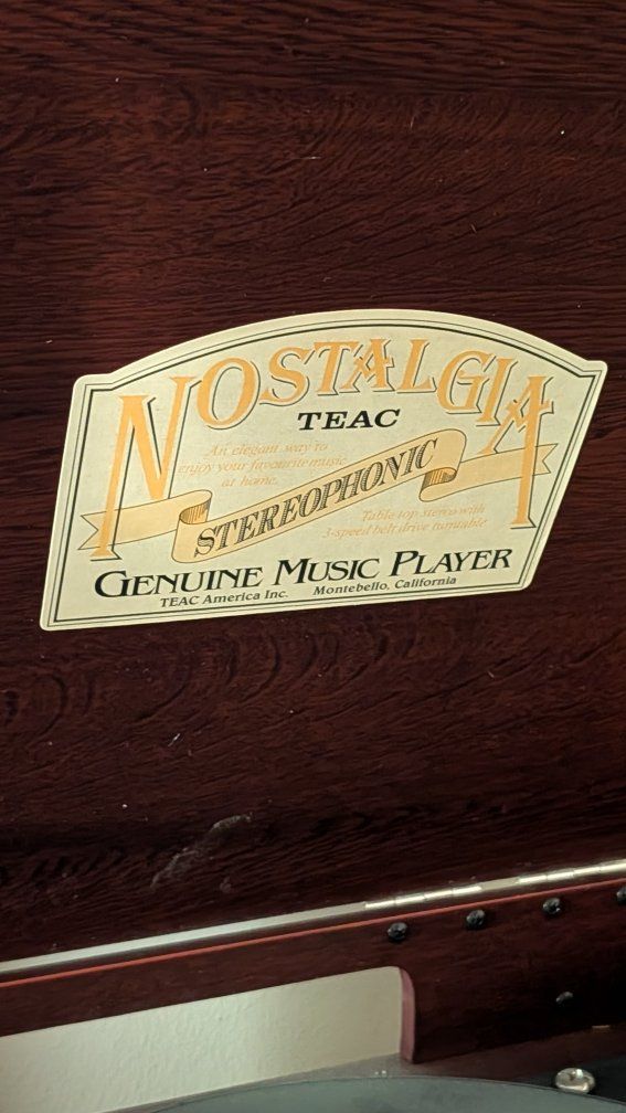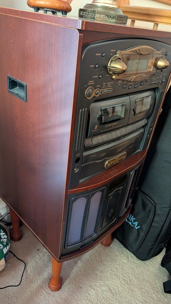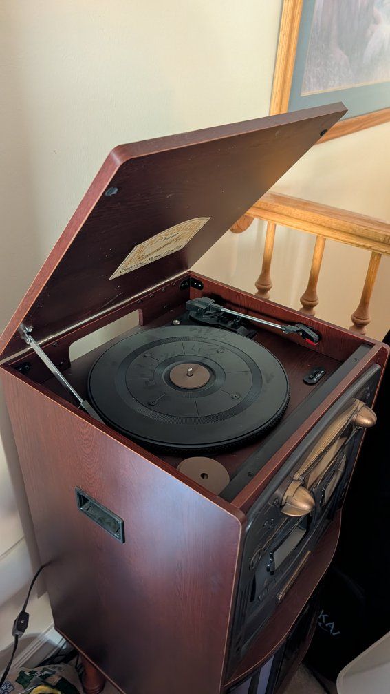 Venmo2005 Nostalgia Stereophonic Record Player with remote. Dimensions are 1'3" deep, 1'3.5" wide, 2'11". Capable of playing radio, cassette tapes, records, and CDs. Handles on the side for easy transportation.