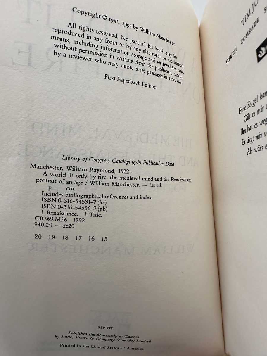 ApplePayPaperback copy of A World Lit Only by Fire by William Manchester, a bestselling narrative history exploring the Middle Ages and the rise of the Renaissance. This engaging and accessible account brings historical figures and events to life. Used copy with visible wear but fully readable—great for students or casual history readers.