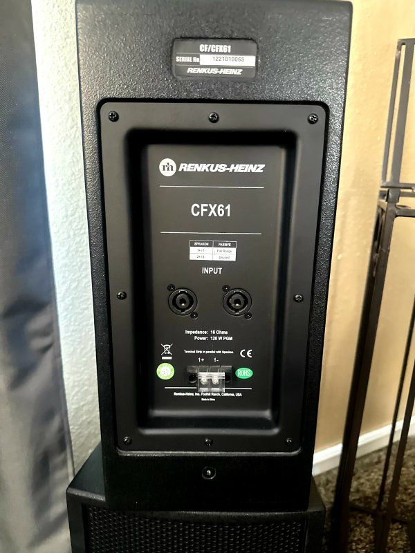 VenmoBrand new speakers Renkus-Heinz $400 O.B.O. pick up in South jordan. Venmo or cash preferred. Thanks for looking Key Features • High Volume Output, Small Enclosures 80 Hz to 20 kHz ±3 dB: Outstanding, full-range performance in an extremely compact, space-saving design. • Flexible Input Configurations Choose passive inputs, or go self-powered with the PF1-200 series intelligent amplifier, either with or without RHAON networking. • RHAON Audio Operations Network Self-Powered CF61-2R cabinets are RHAON empowered for flexible digital signal distribution, loudspeaker management and control using standard Ethernet hardware and cabling. • Exclusive 150° by 60° Complex Conic Design Provides constant beamwidth/directivity without the problems of conventional rectangular horns; can be rotated 90° within the cabinet for wide or deep listening spaces. • 1-inch Extended Range Titanium HF Driver Provides smooth, low distortion high frequency performance to 20 kHz and beyond. • Heavy-Duty 6.5-inch Woofer Easily handles 120 Watts of program power. PF Series Intelligent Amplifiers Passive, powered or networked: you can choose the CF/CFX system that suits your needs at any time. At the factory or in the field, the CFX passive connector plate can be easily replaced by a PF1-200 series Class D digital amplifier with loudspeaker specific processing. The PF1-200’s lightweight switching power supply delivers 70% efficiency at full output, reducing AC requirements and eliminating the need for a cooling fan.