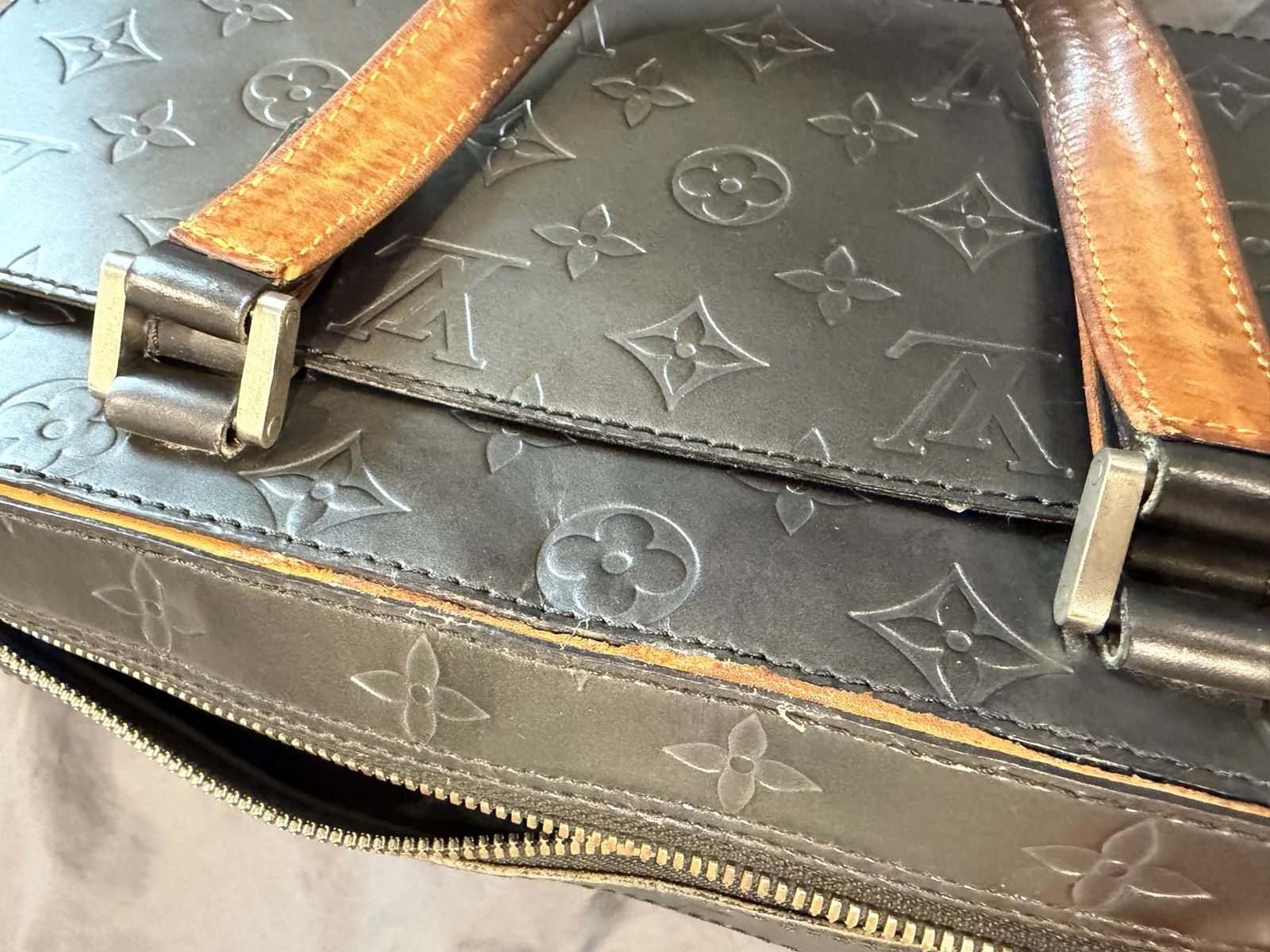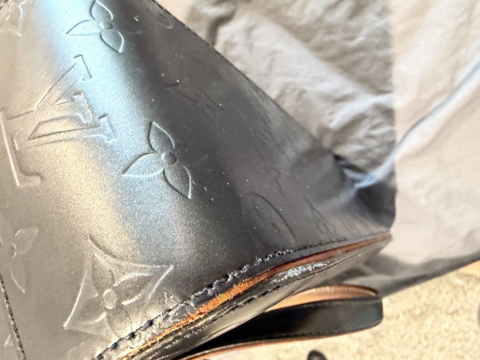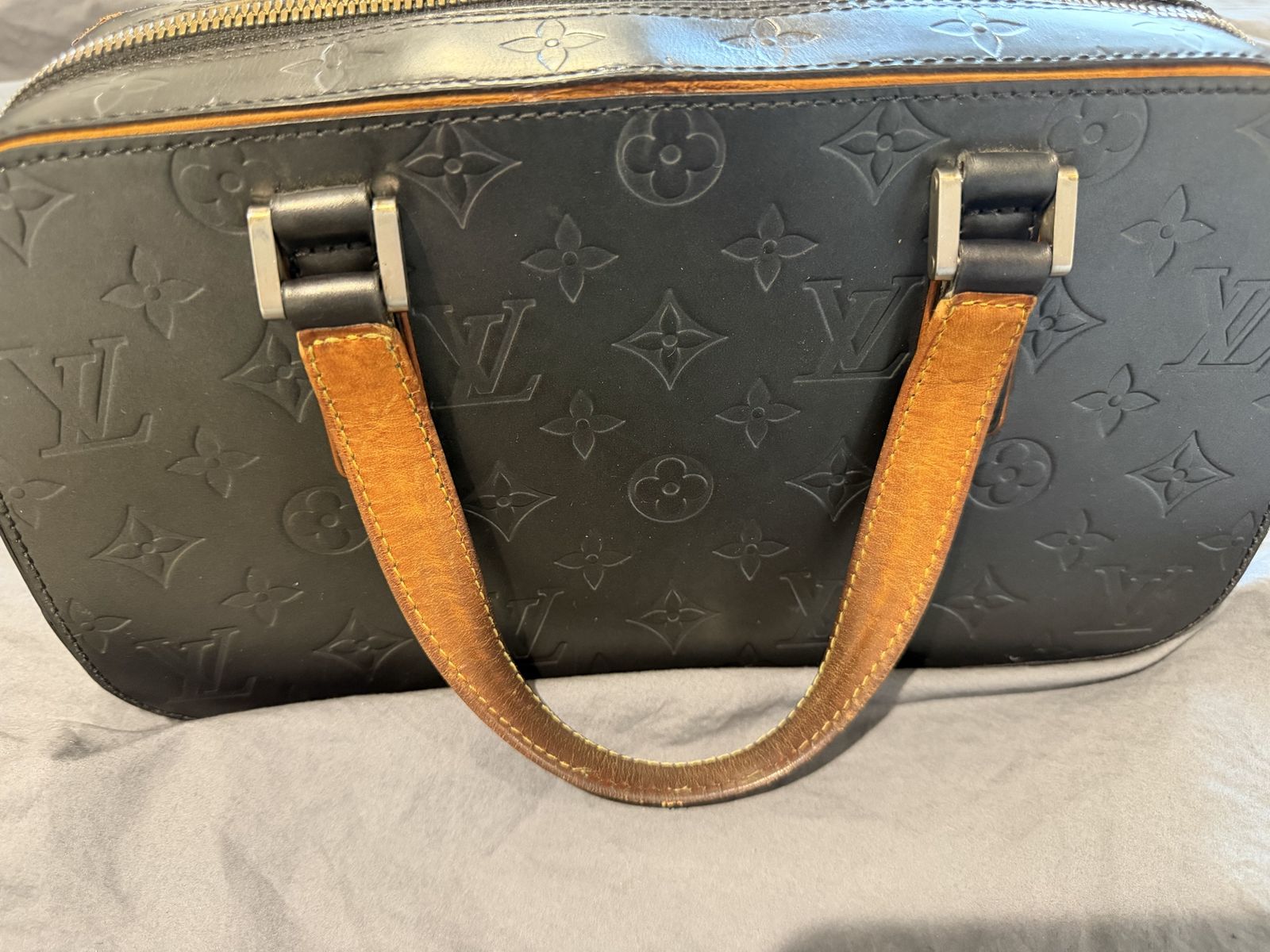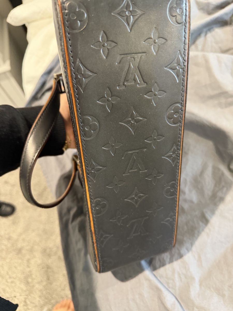 The item is a Louis Vuitton Monogram Mat Shelton handbag in Noir (black), Vachetta on one side has been glued by cobbler