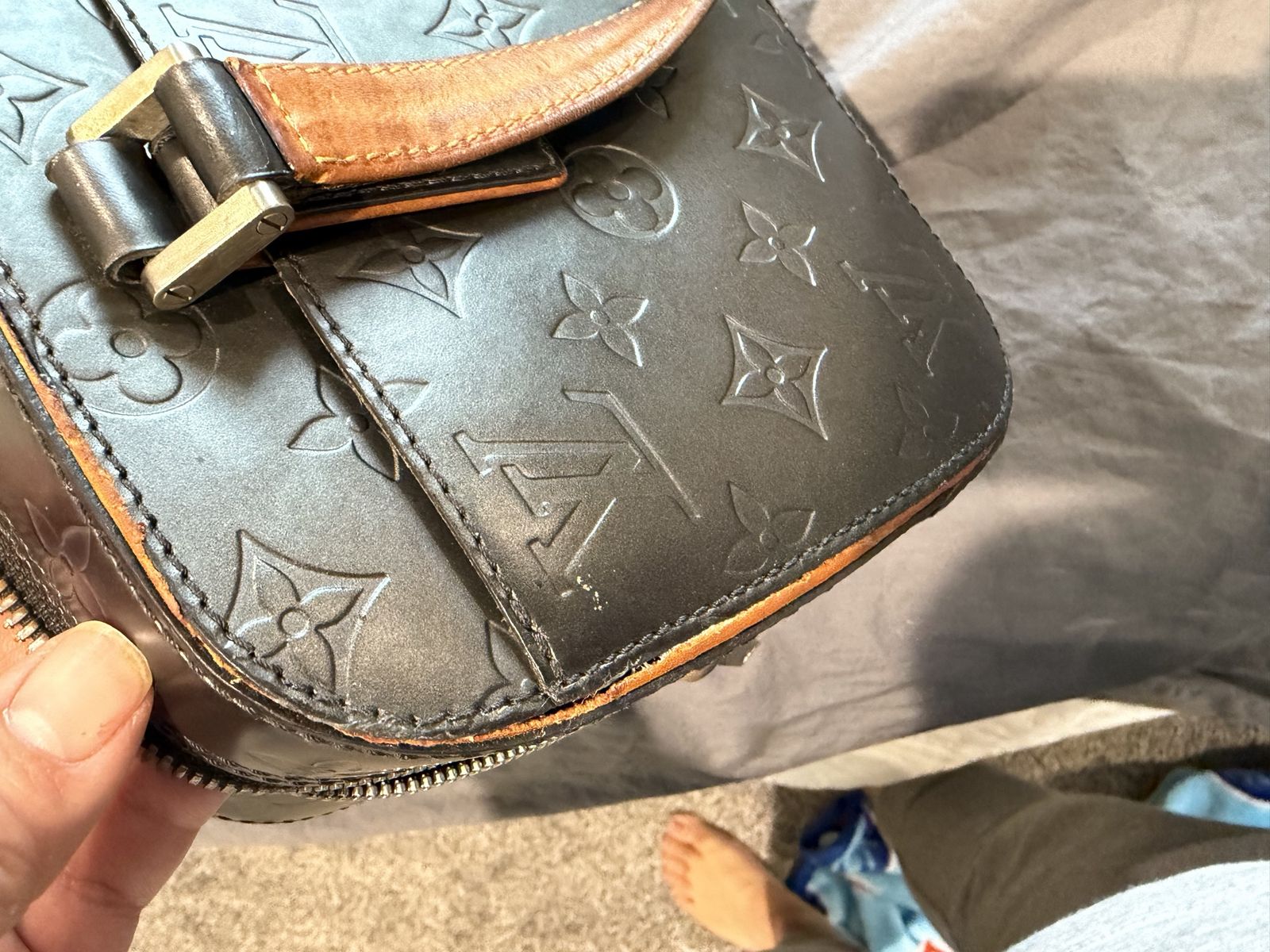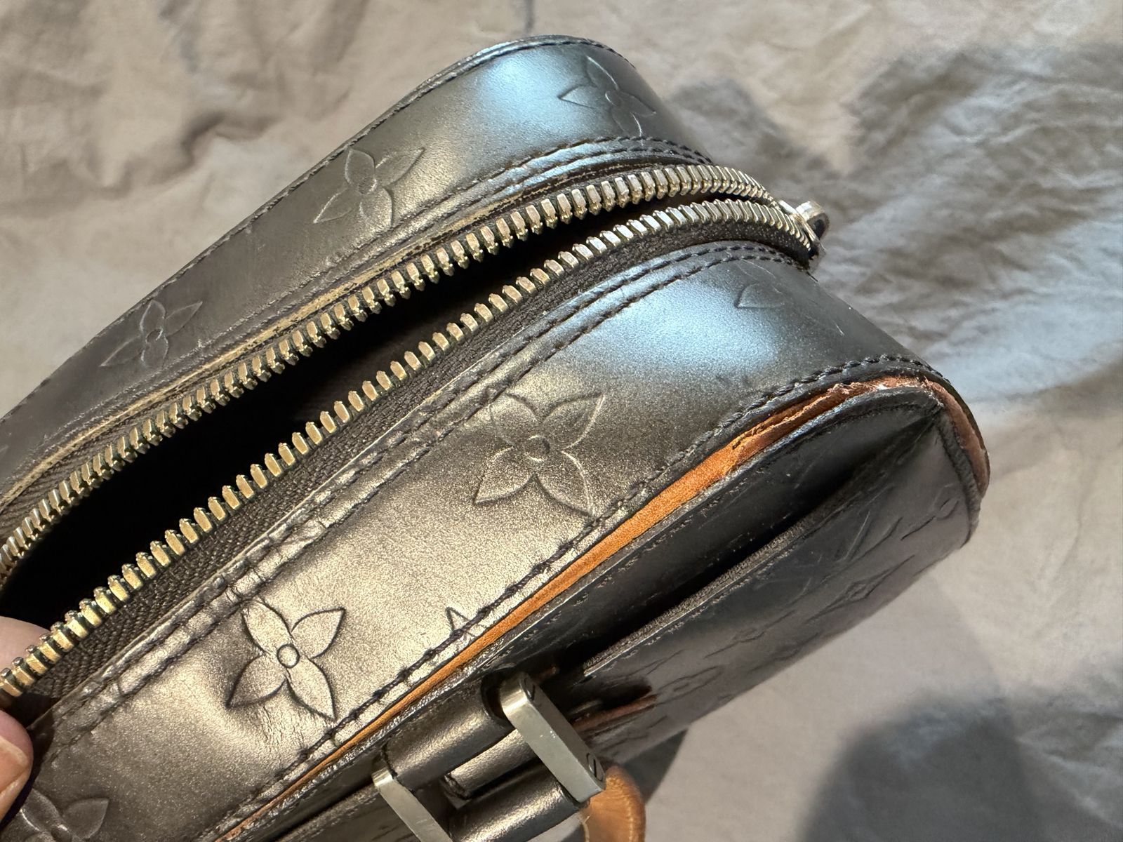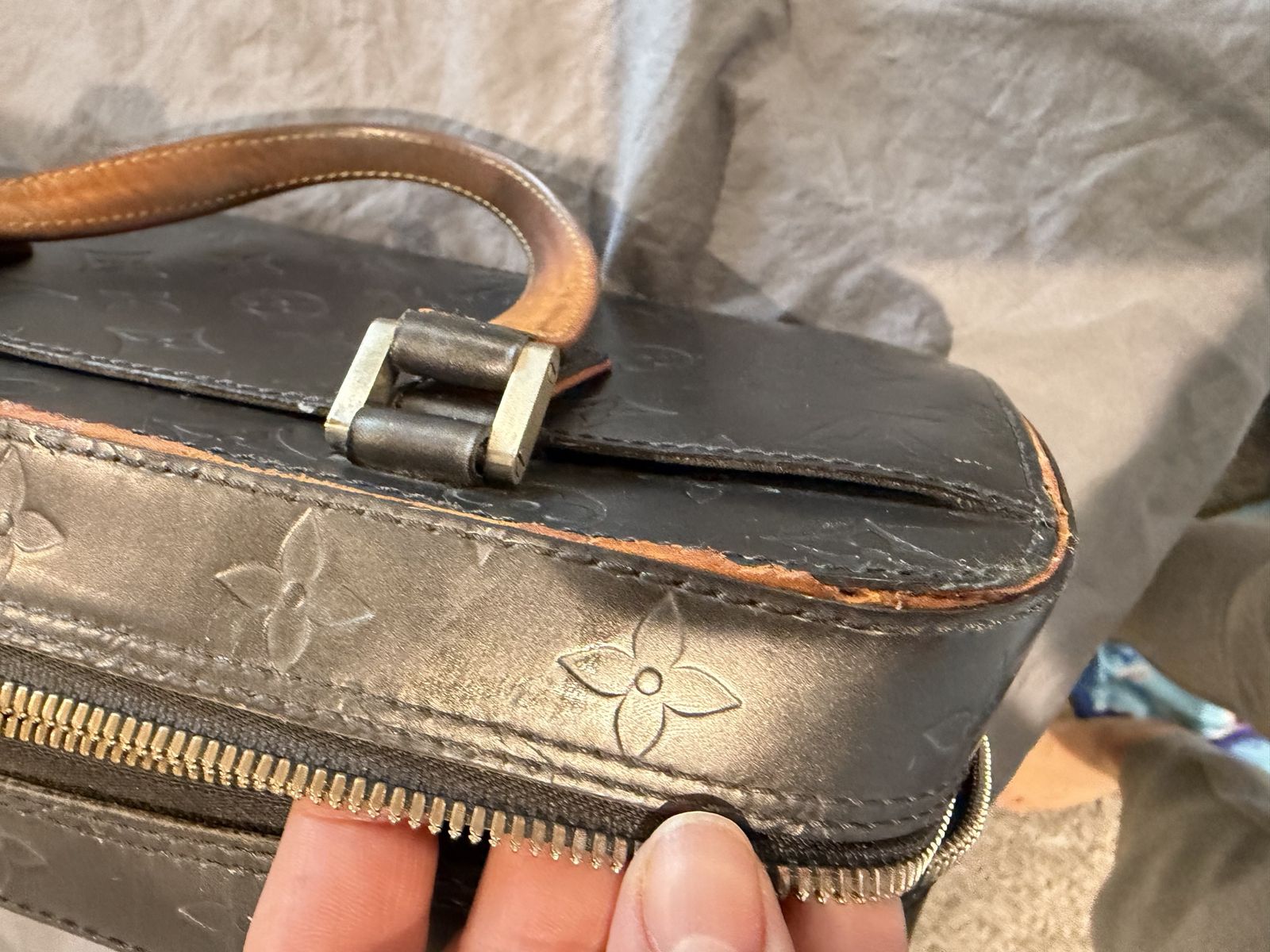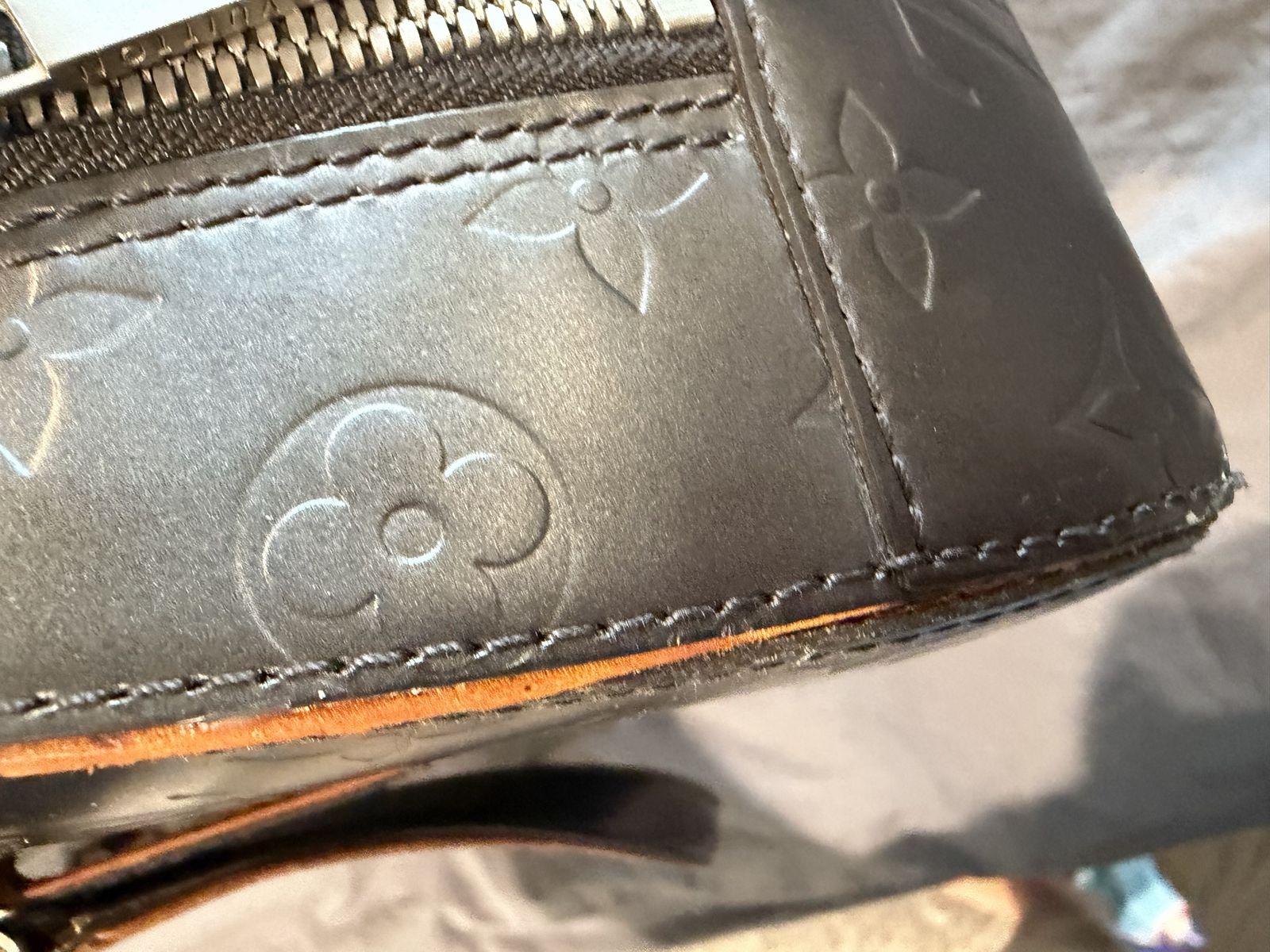 The item is a Louis Vuitton Monogram Mat Shelton handbag in Noir (black), Vachetta on one side has been glued by cobbler