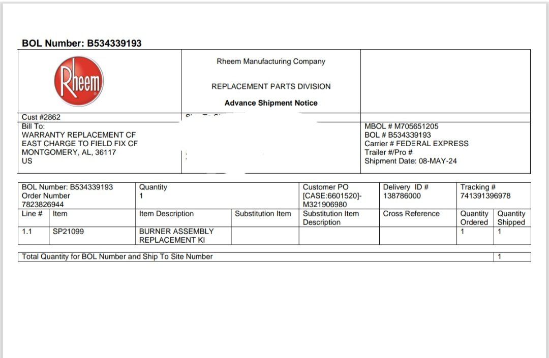 VenmoRheem Burner Assembly Replacement Kit SP21099 Silver Gas Metal with Instructions..... new never installed it was shipped to me but the whole water heater was replaced instead.