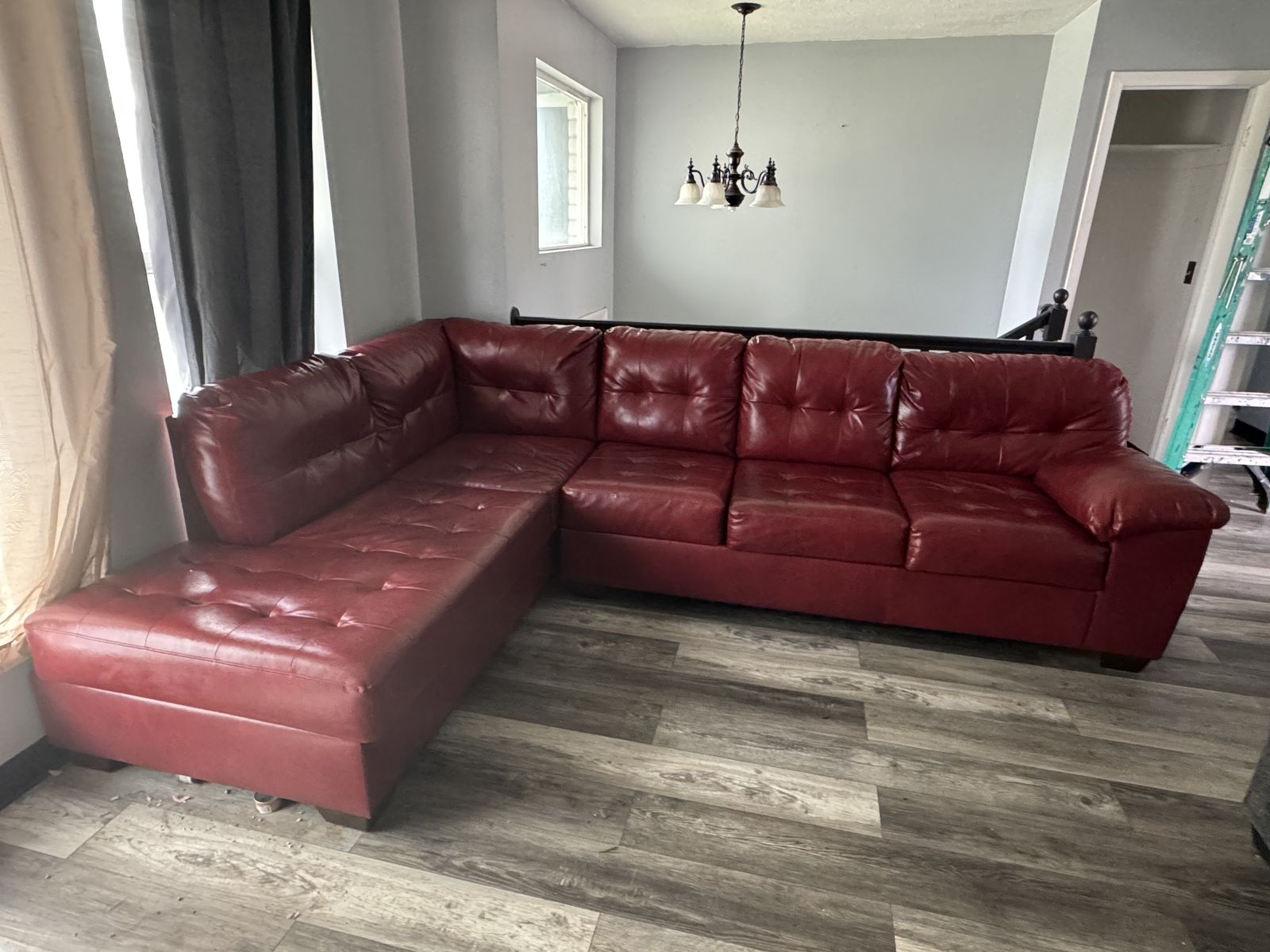 Leather sectional color salsa. Has a small area of scratches but other than that its a great sofa and very comfortabl. it has 2 pieces