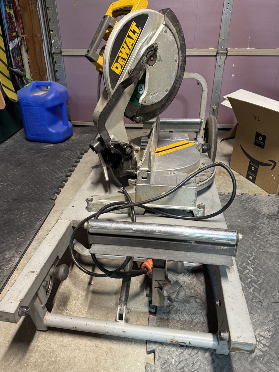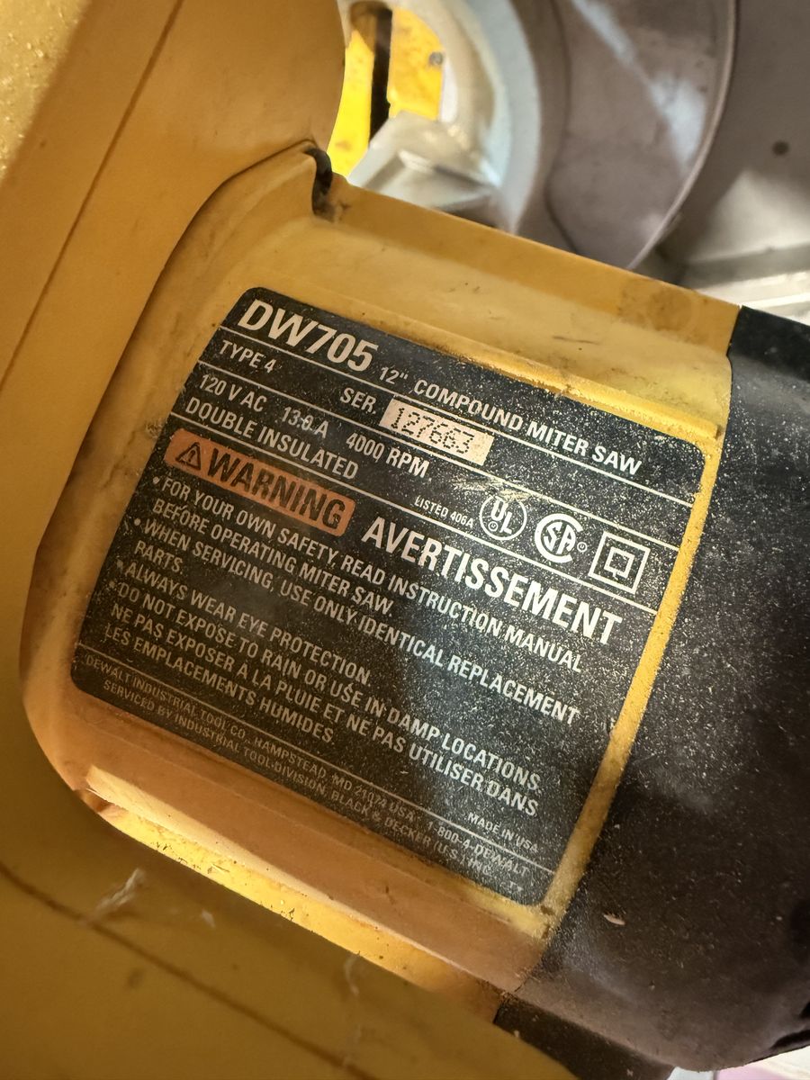 Dewalt DW705. Saw in good condition, some fraying of the power cord but never had issues. Stand not included. Functions well, just upgraded.