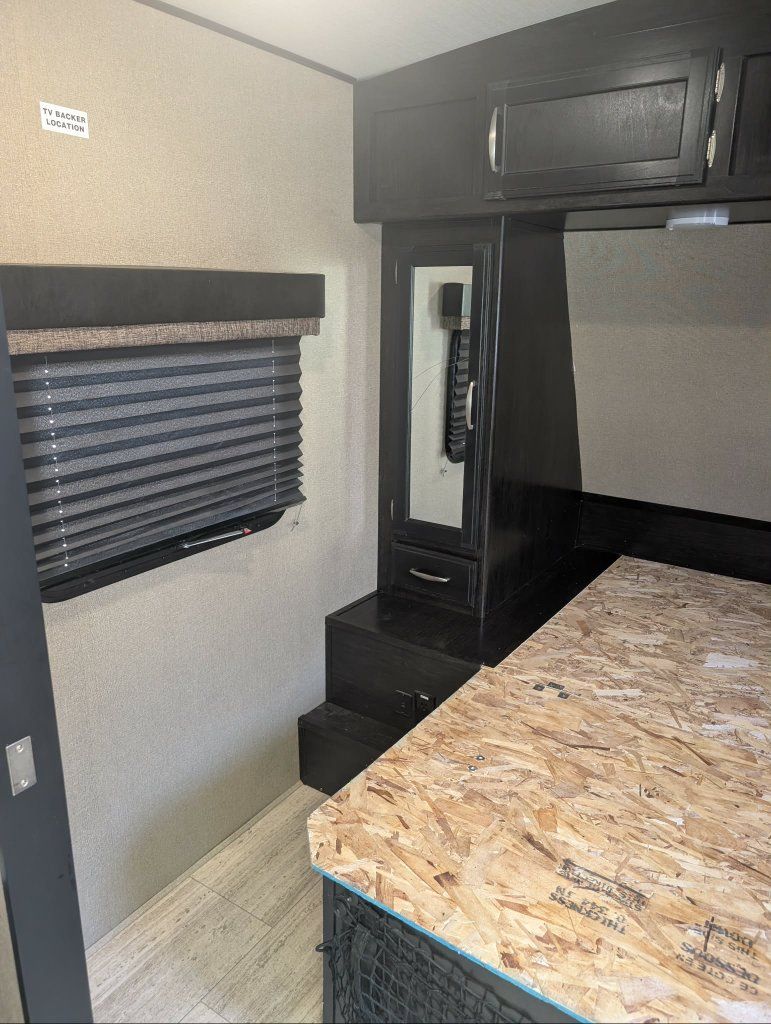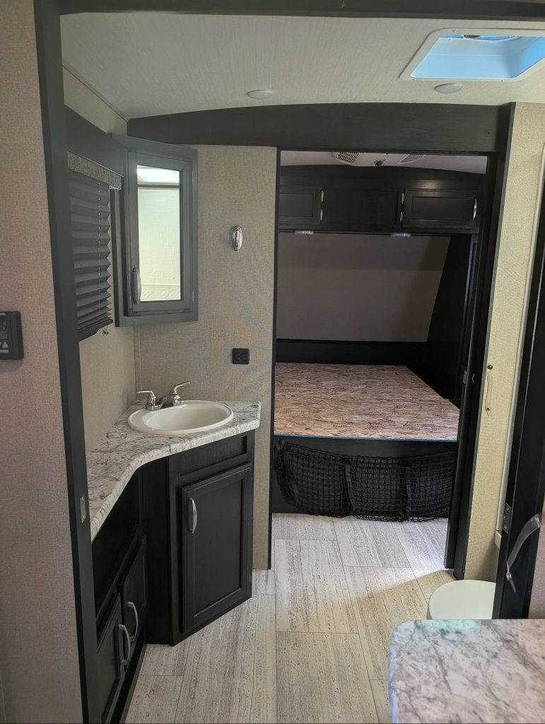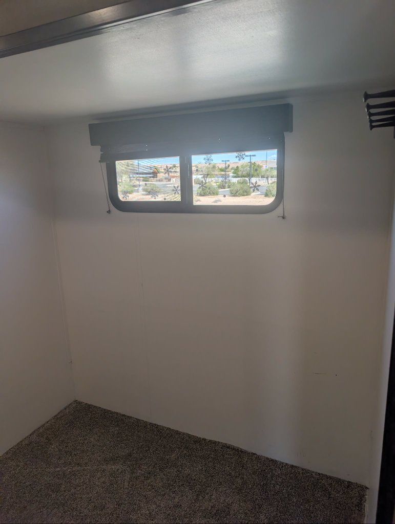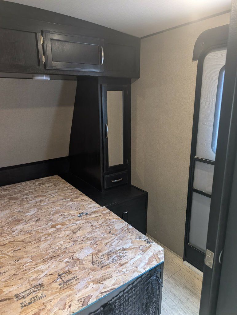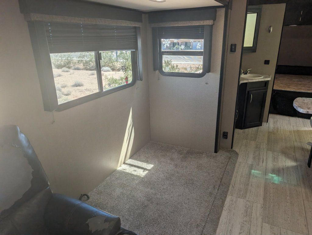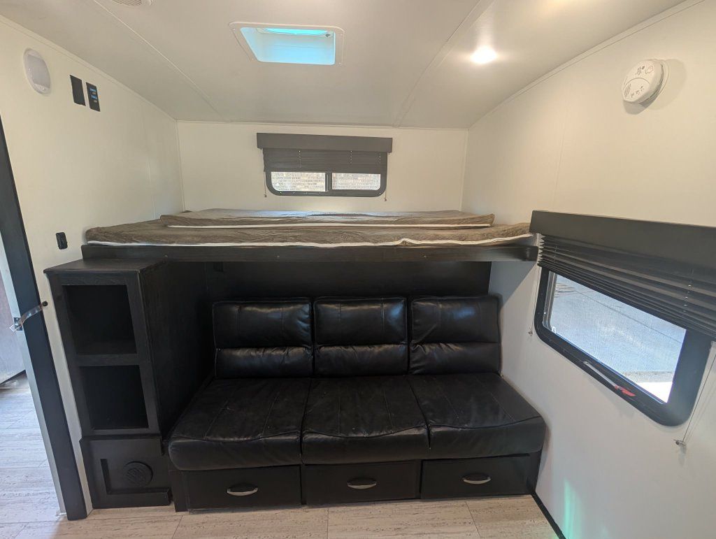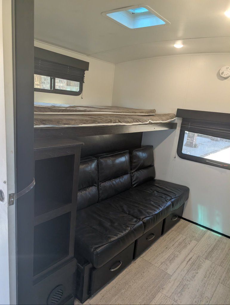 The U-shaped dining table was removed and replaced with a removable standard 4 chair table set. The rear bedroom drop down bed in the slide out was removed to create more space. The camper can comfortably sleep 6-7 in its current arrangement. However, there is plenty of space to comfortably blow up air mattresses for extra bedding arrangements.