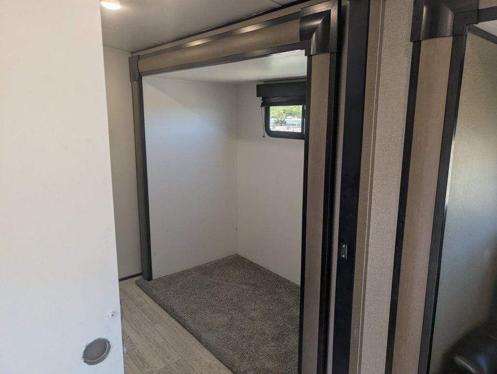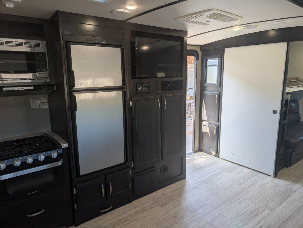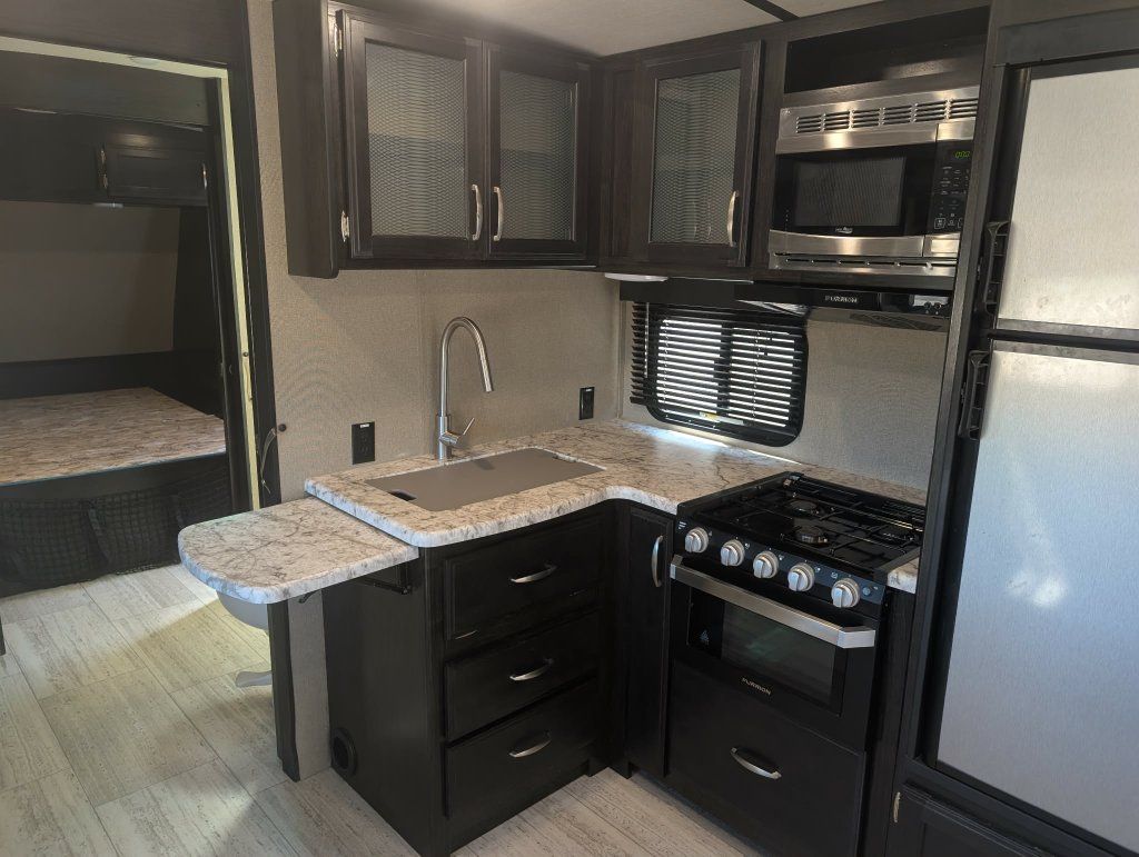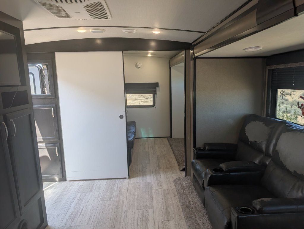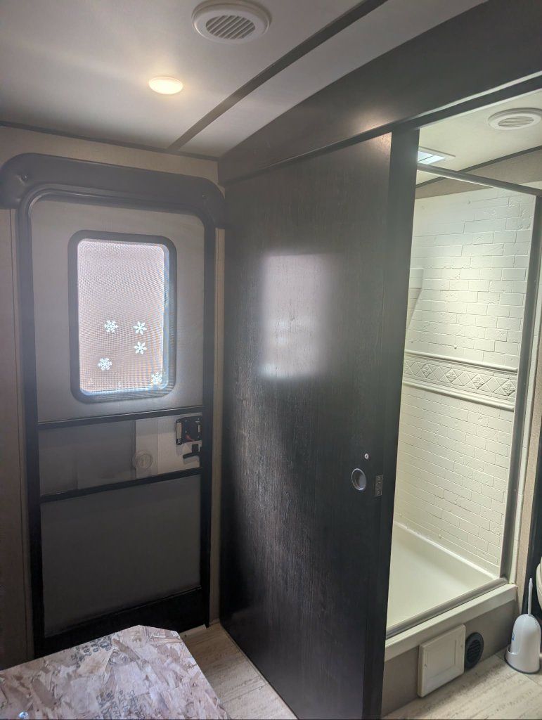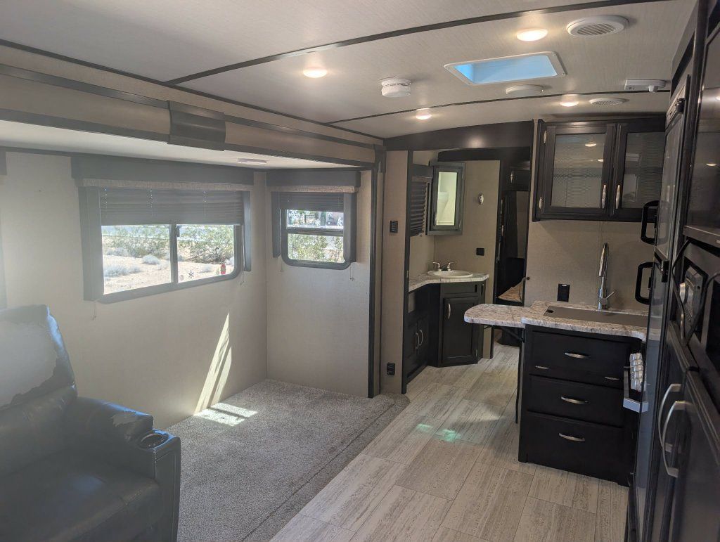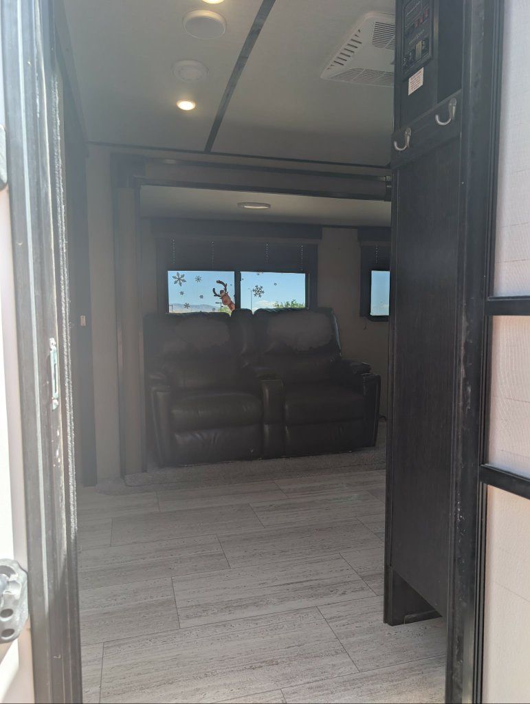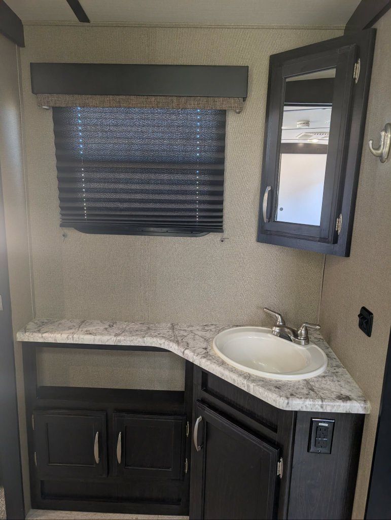 The U-shaped dining table was removed and replaced with a removable standard 4 chair table set. The rear bedroom drop down bed in the slide out was removed to create more space. The camper can comfortably sleep 6-7 in its current arrangement. However, there is plenty of space to comfortably blow up air mattresses for extra bedding arrangements.