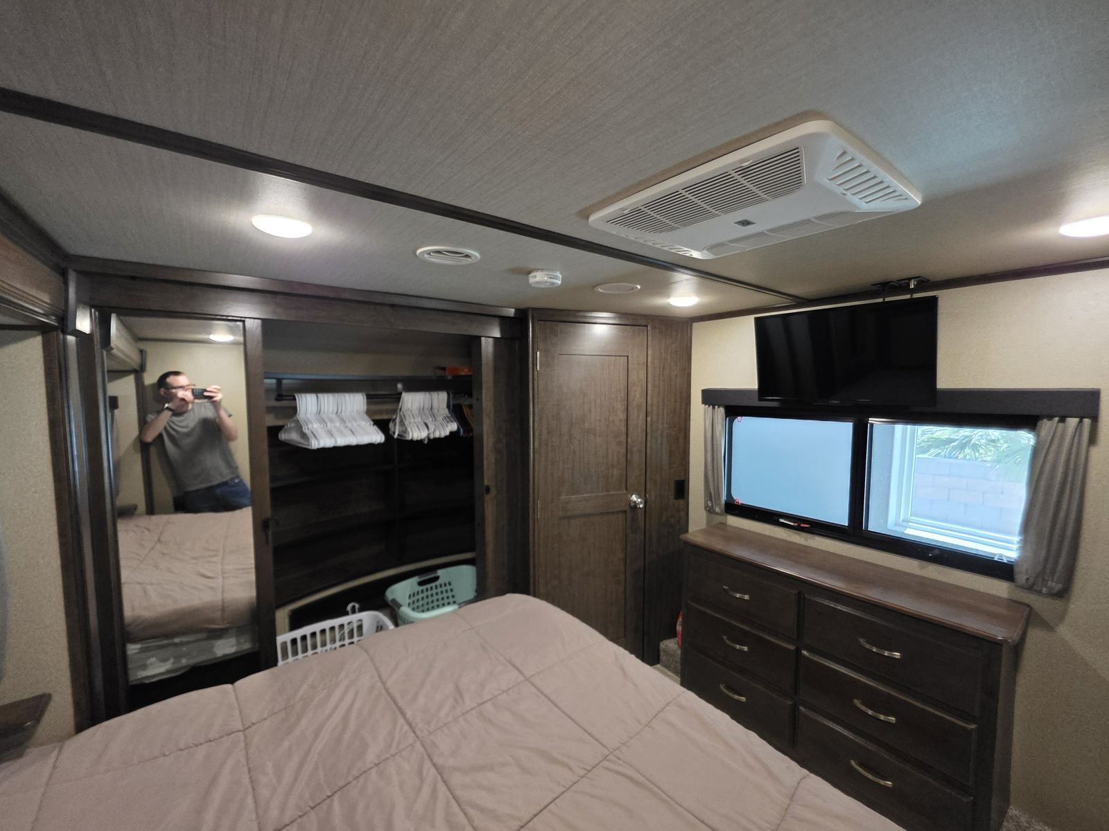 Bed & Bath - Master Suite: King-size bed with under-bed storage, flip-top dresser, and a private TV.