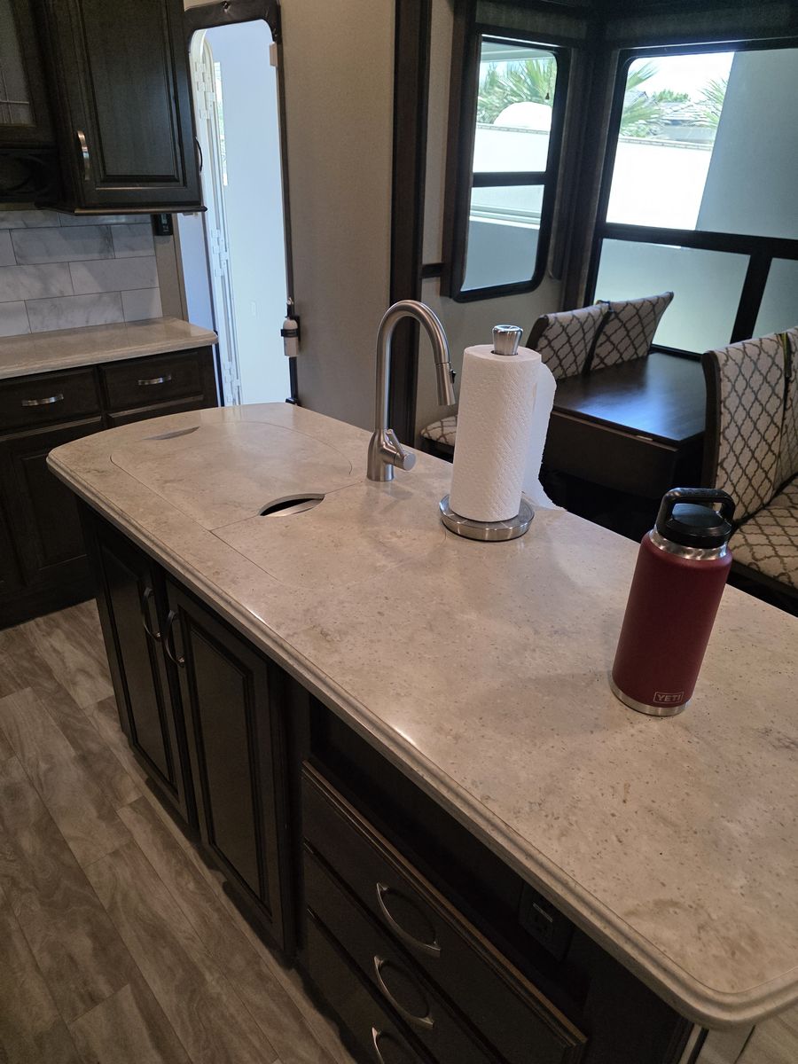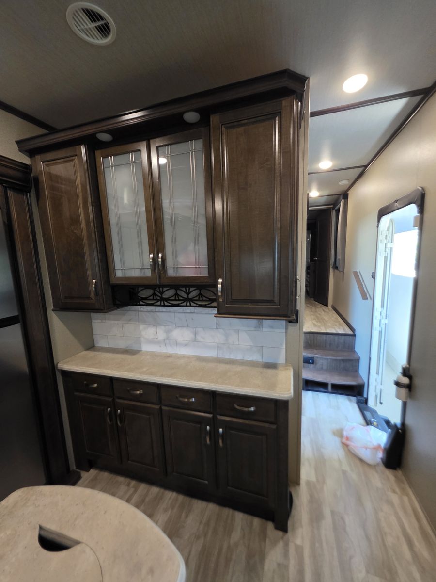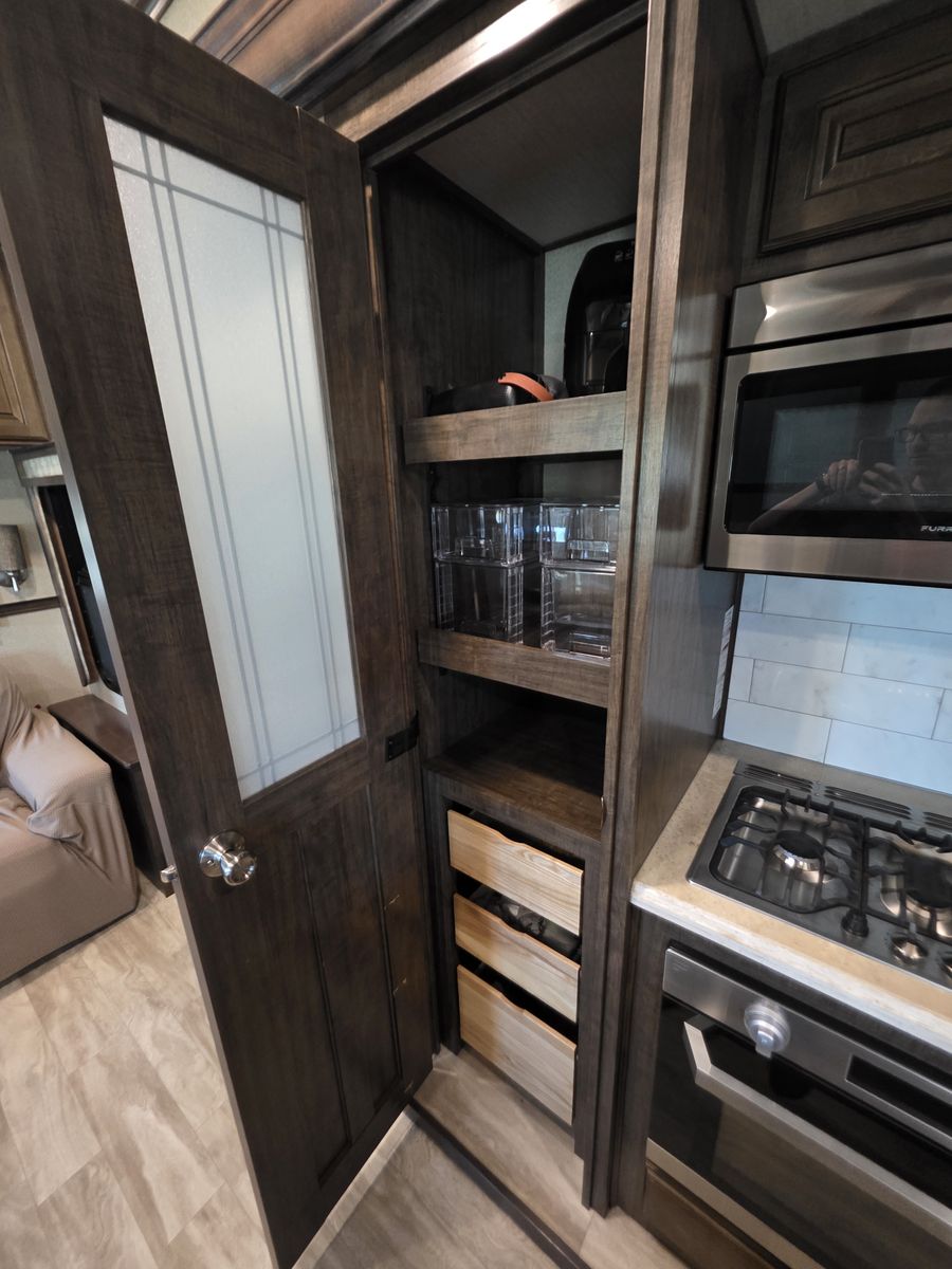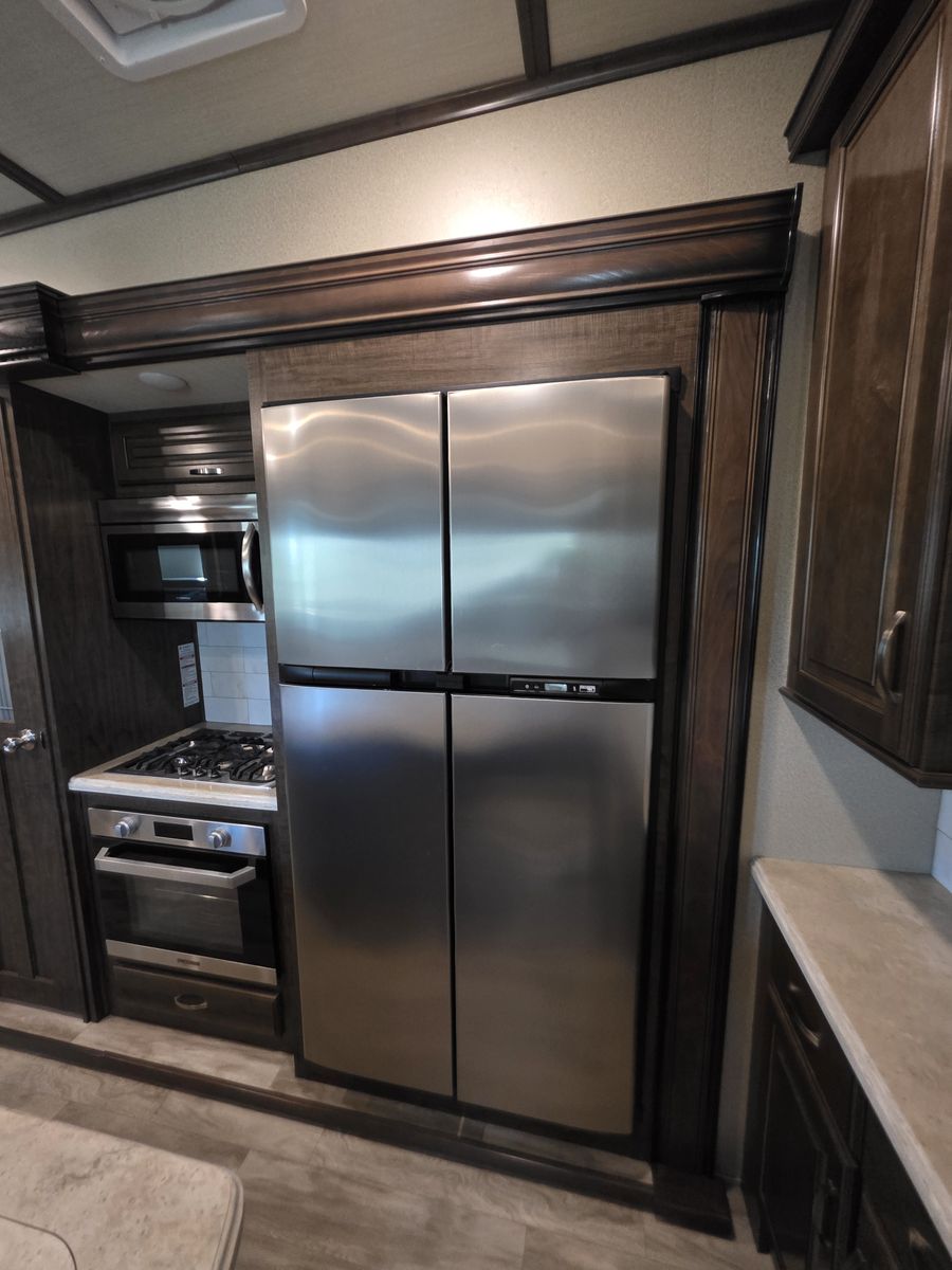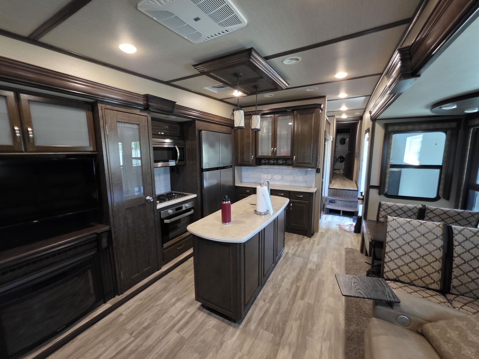 Living & Kitchen Area - Gourmet Kitchen: Large central island with LED accent lighting, 18 cu. ft. 4-door RV fridge (Propane/Electric), and an oversized pantry.