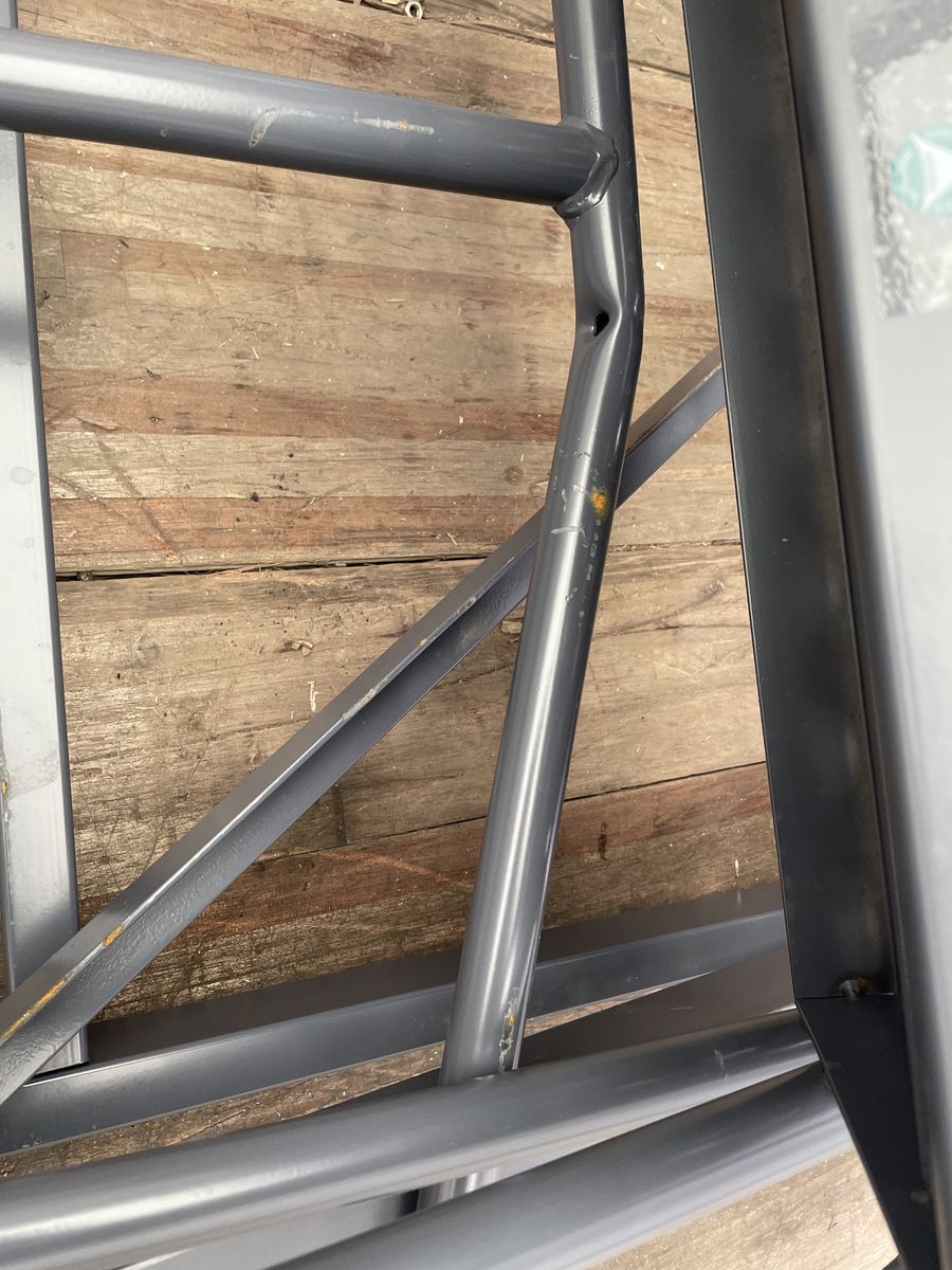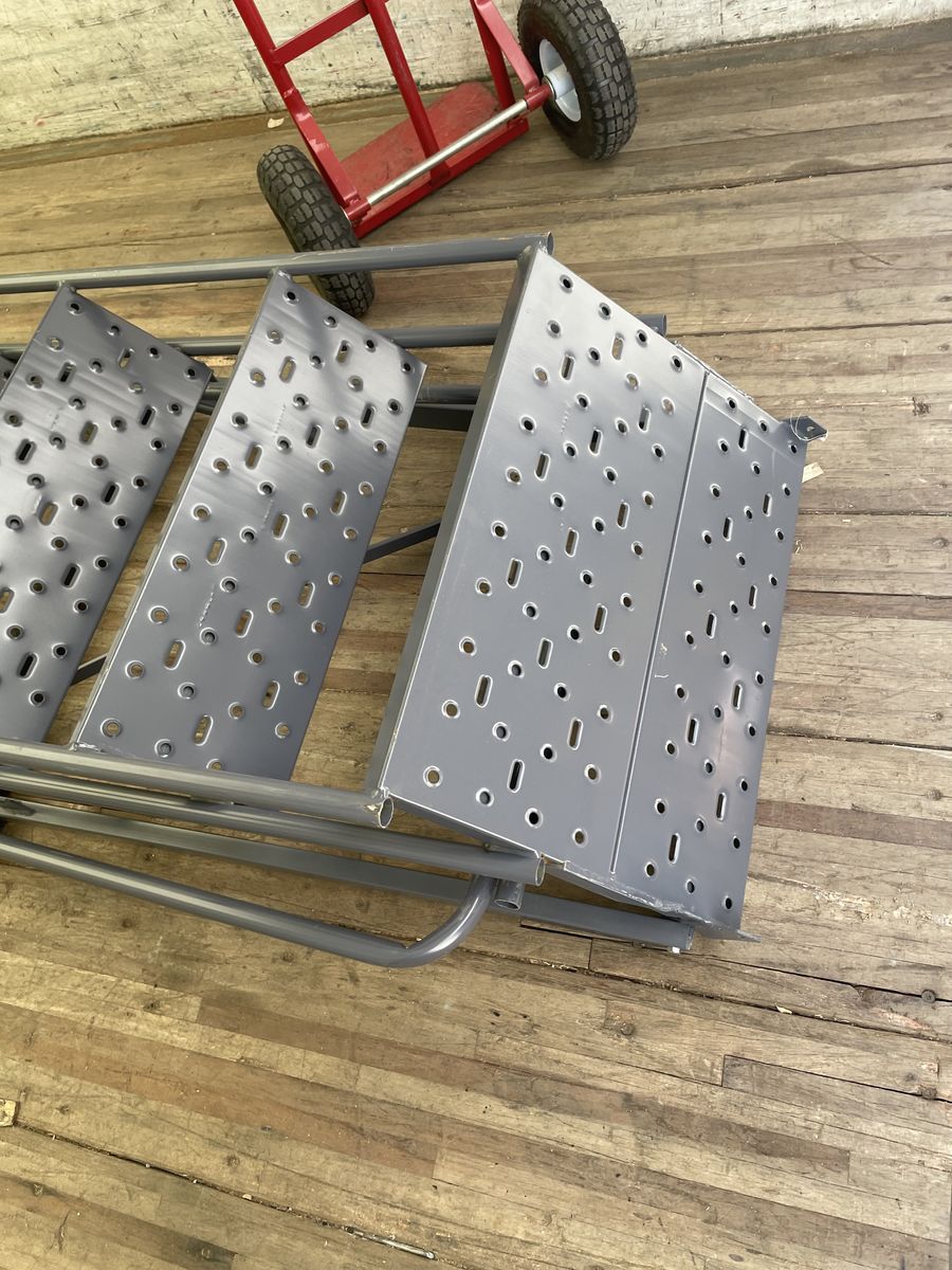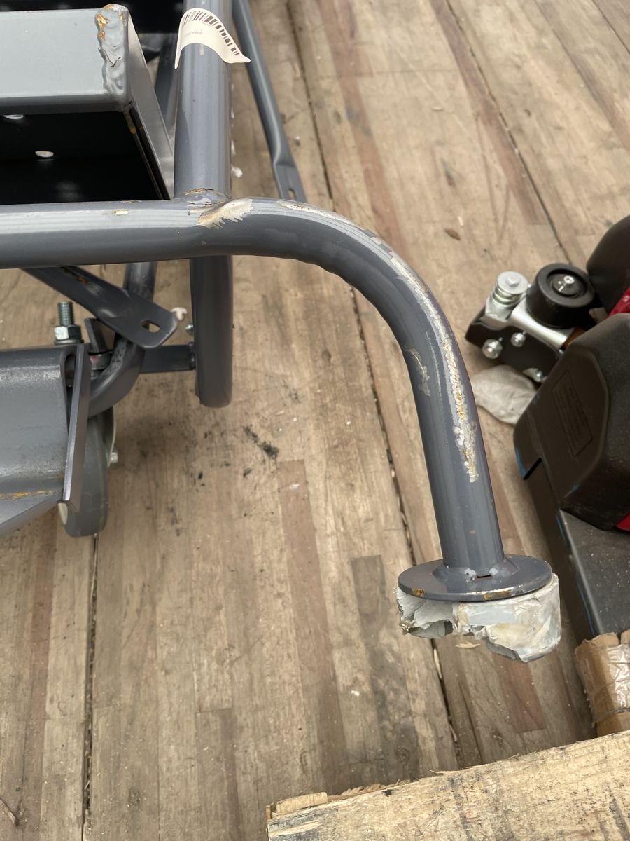VenmoThis is a new damaged shipment. It has three issues that I'm aware of. The one foot pad has a chuck of rubber missing and that leg is slightly bent. It is missing the back fixed caster wheels and bolts. The hoop for the top railing is bent. All damage is shown in the pictures. Top step on this ladder would be 100" from the ground as assembled. Pickup in Layton.